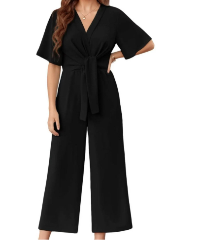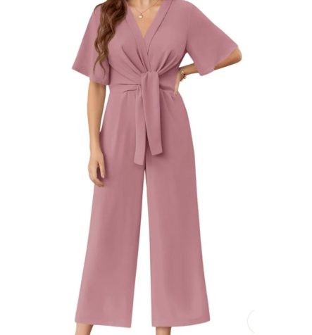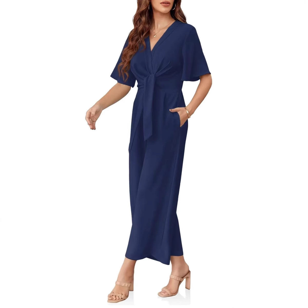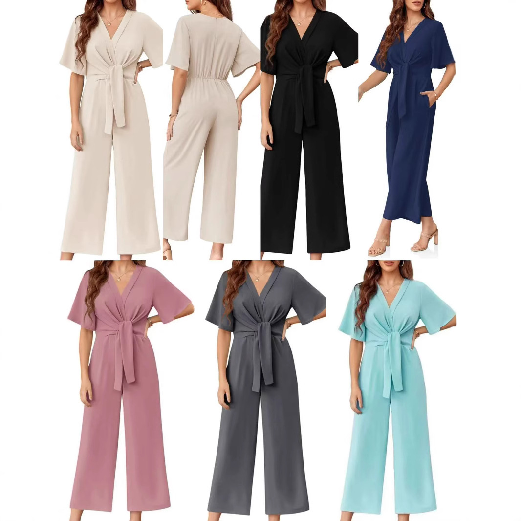 Solid Color And V-neck Minimalist Design Short-sleeved Jumpsuit