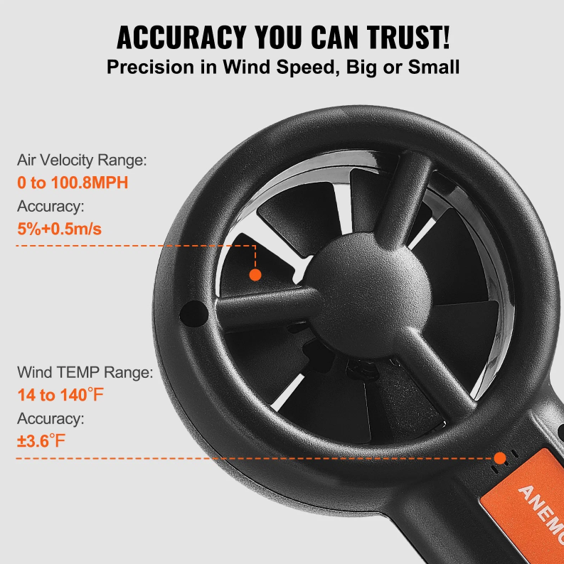 4-in-1 Precision Measurement: Experience the power of integrated technology as our anemometer measures wind velocity, wind temp, air flow, and wind chill. From a gentle zephyr to a gusty gale, our wind meter covers the full spectrum with a wind speed range of 0 to 100.8mph (5%+0.5m/s) and a wind temperature range of 14 to 140°F (±3.6°F). Get data you can rely on, no matter the conditions.