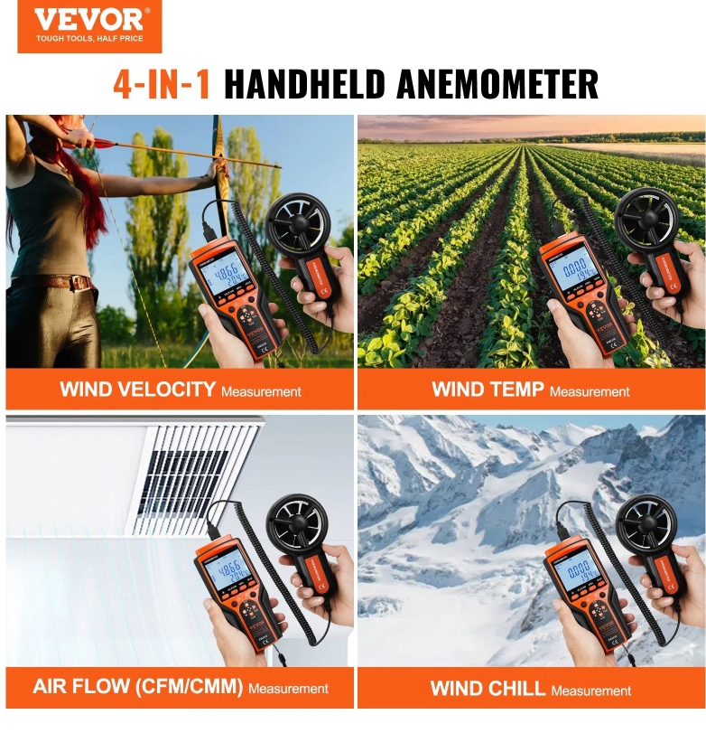Explore nature, master every breeze with our anemometer! Our 4-in-1 wind speed meter measures wind velocity, wind temp, air flow, and wind chill. IP44 waterproof(excluding the vane unit), 6 wind speed units, LED backlit display, it has got you covered! Ready to elevate your wind experience?