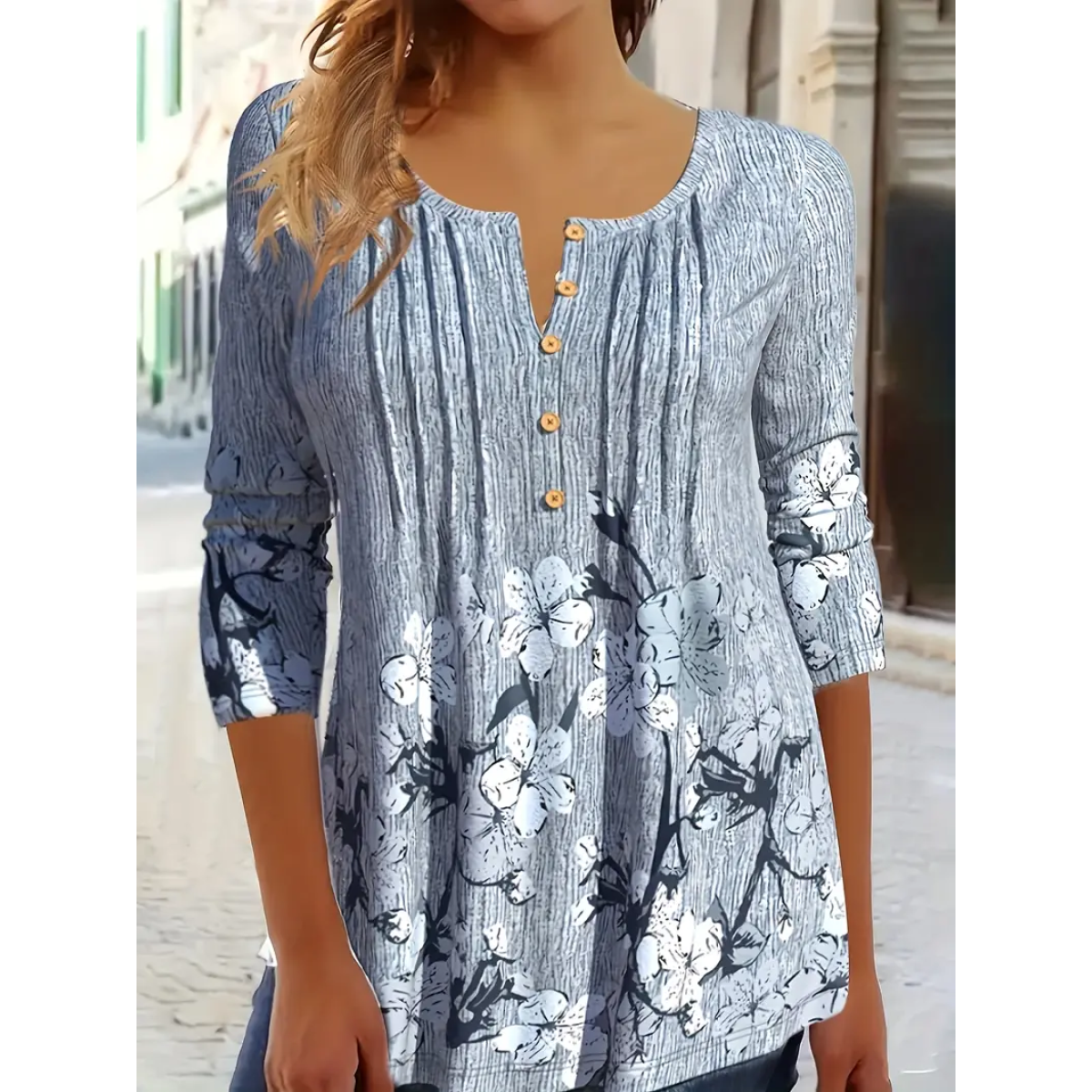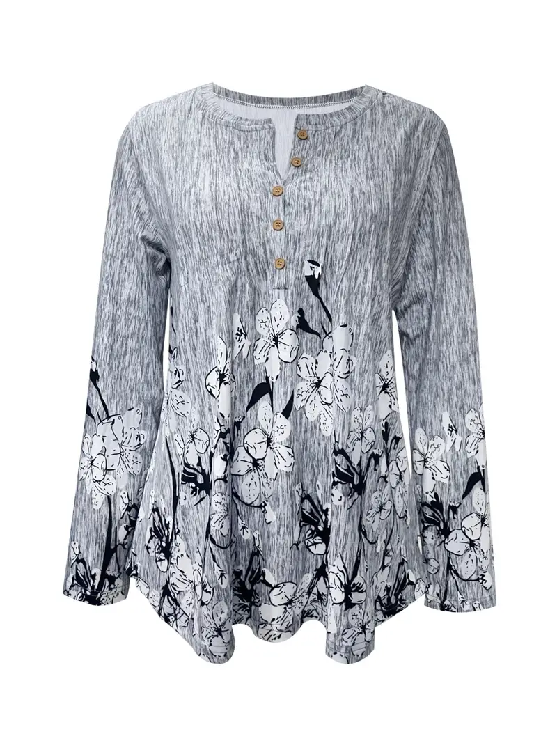 Spring And Autumn Casual Print Spike Button Crew Neck Long Sleeve T-shirt