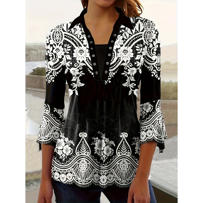 Spring Autumn New Printed Lapel Three-quarter Sleeve T-shirt Irregular Cuff Button Top