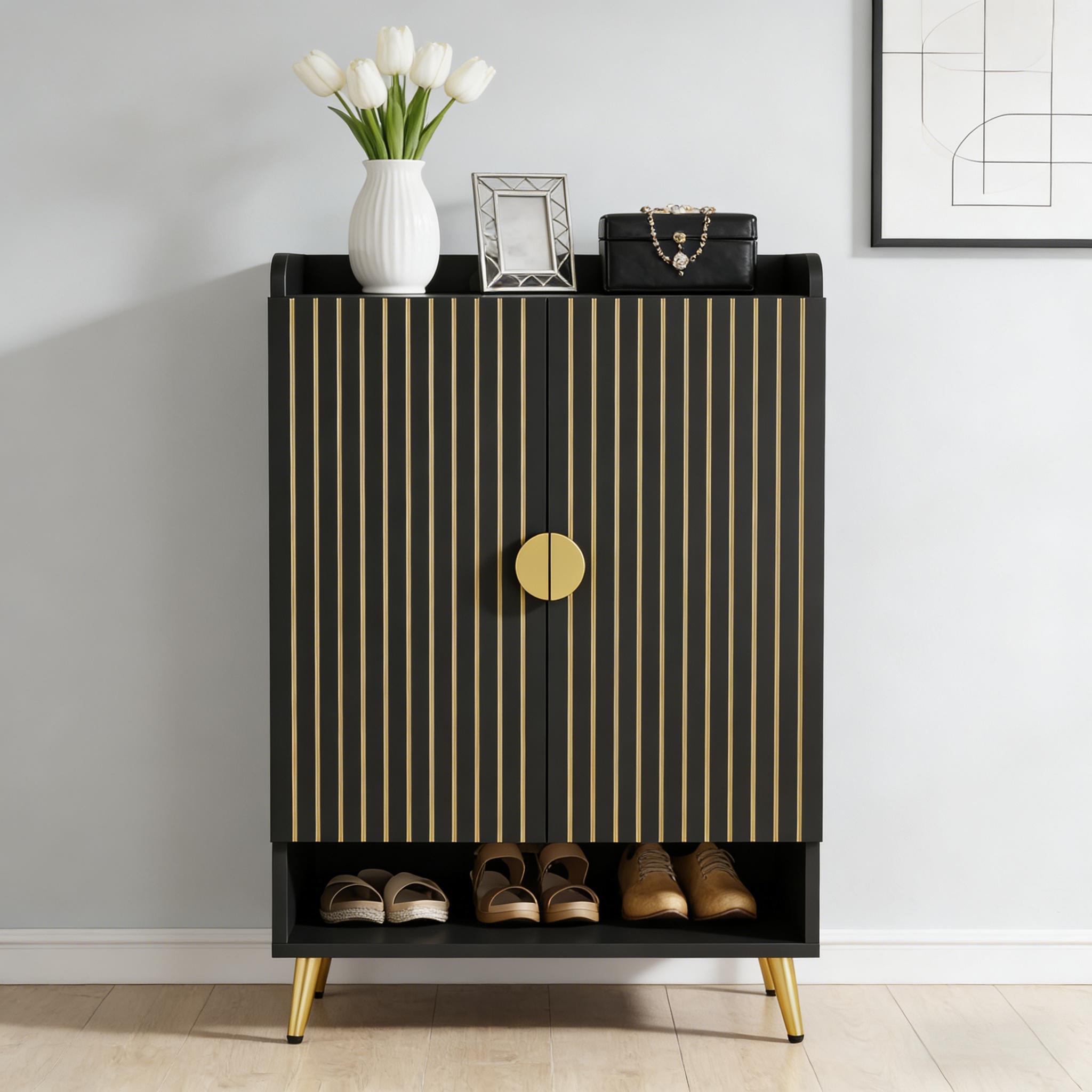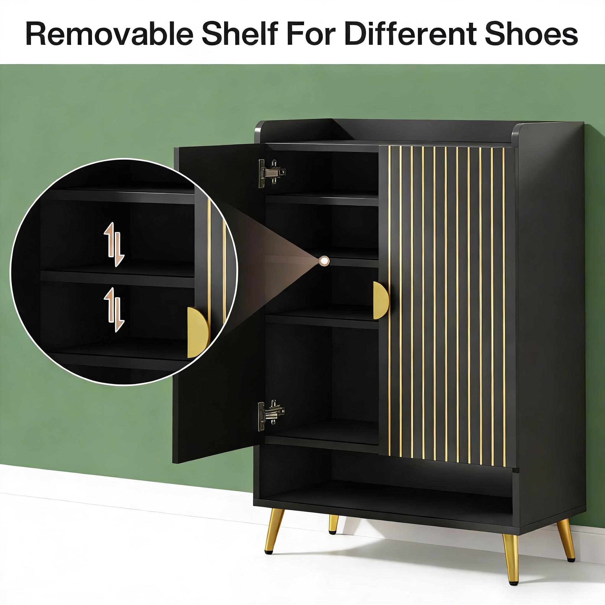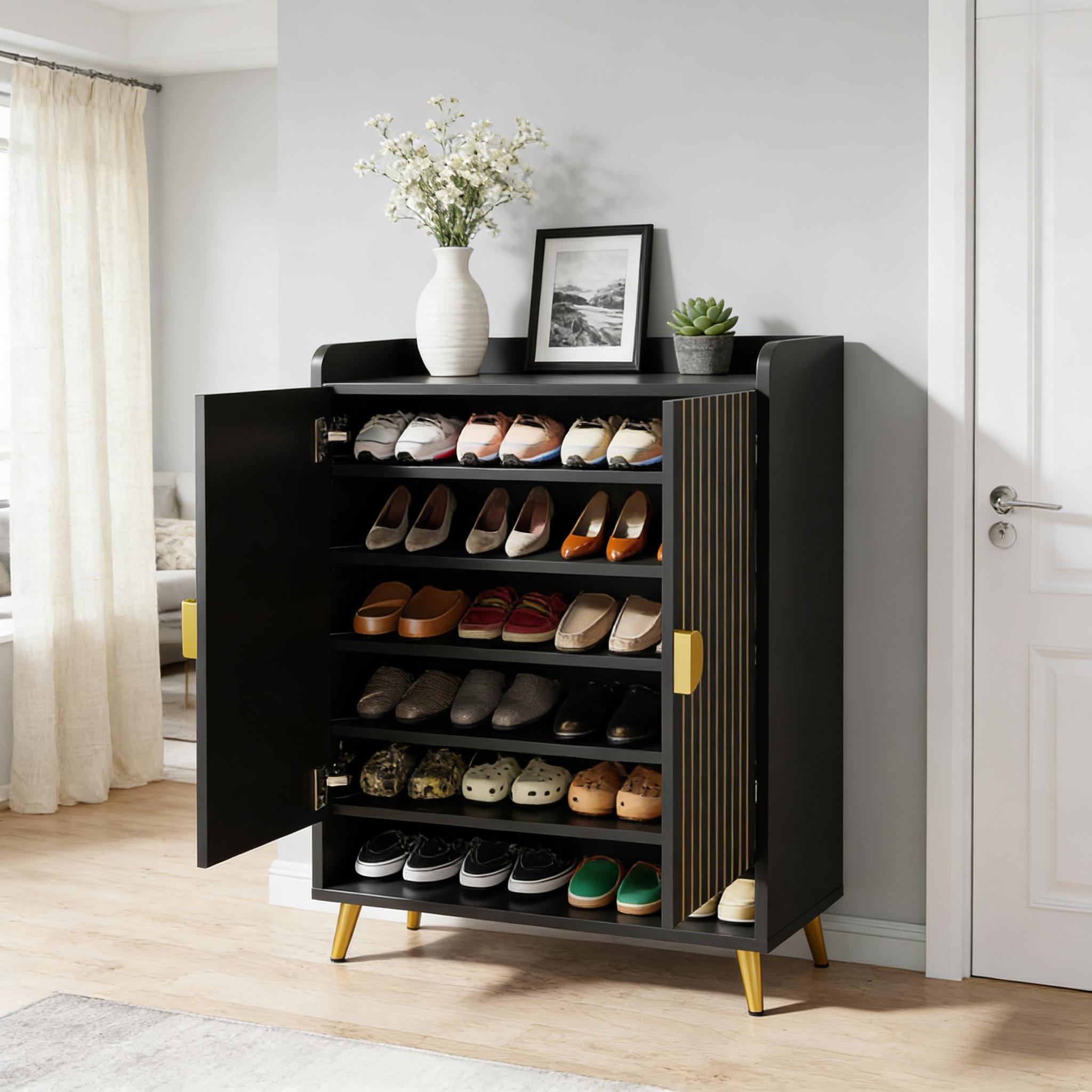 Important Reminder!!! 1) Attention: All products in our store do not support Canada self pickup ordering. Please do not create shipping labels for Canada. Our American products do not support self pickup to Canada 2)We do not ship to Alaska, Hawaii, US protectorates (e.g., Puerto Rico), P.O. boxes, or APO/FPO addresse 3)We don’t accept non-defective remorse returns Sturdy & Reliable - Swap your unstable shoe rack for our solid and durable adjustable shoe rack, made from premium E0 particle board. Large & Flexible - Our 7-tier shoe rack with adjustable panels accommodates various types of shoes, along with your bags and decor items. With the capability to hold up to 24 pairs of shoes, this 29.6" W x 14.6" D x 43.3" H storage solution keeps your shoes organized. Chic & Elegant - Impress your guests with this attractive shoe cabinet, featuring a waterproof, wood finish and golden metal accents. It adds modern, homely charm to any space. Compact & Practical - Functional yet simple, this entryway shoe storage cabinet can serve both as a shoe shelf or kitchen storage. Its swing doors offer hidden storage, making it a perfect clutter-free solution for your hallway, dorm, or garage. Easy Assembly - Simplify your life with the easy-to-assemble design of our shoe organizer.