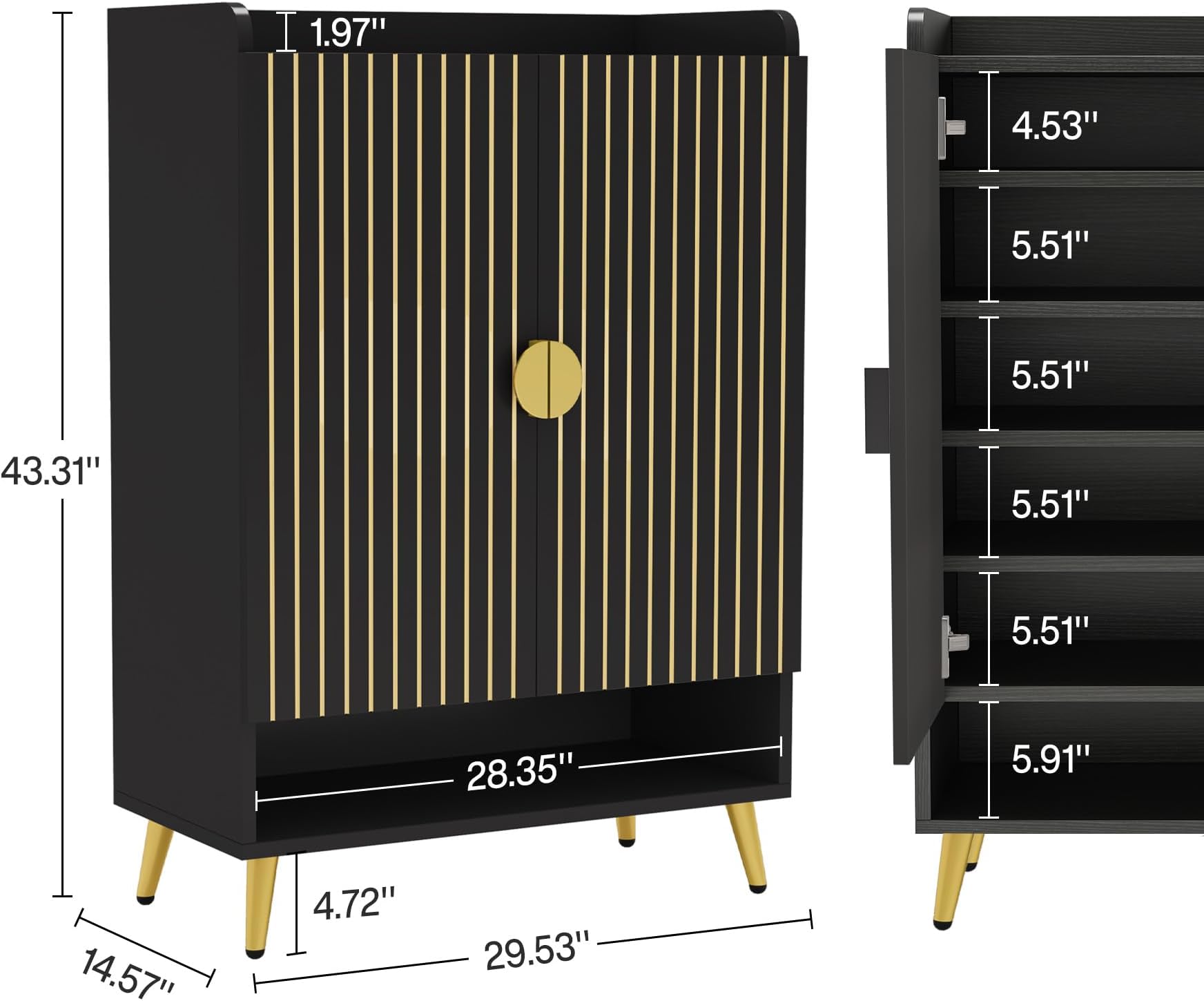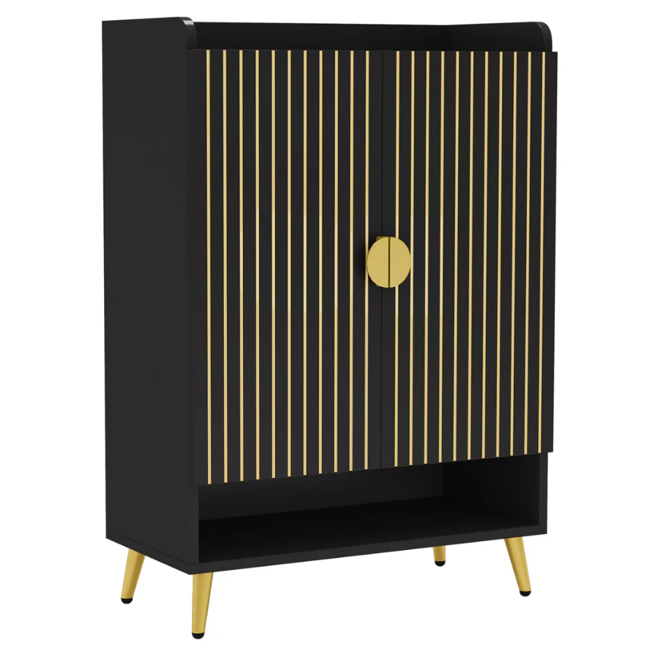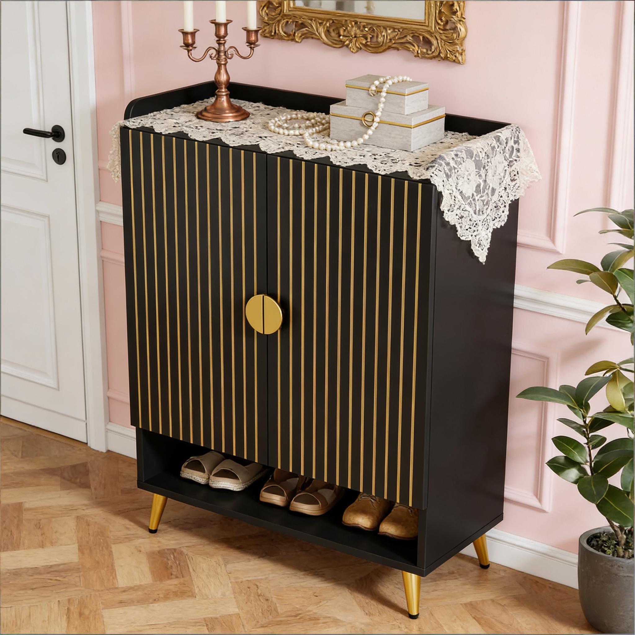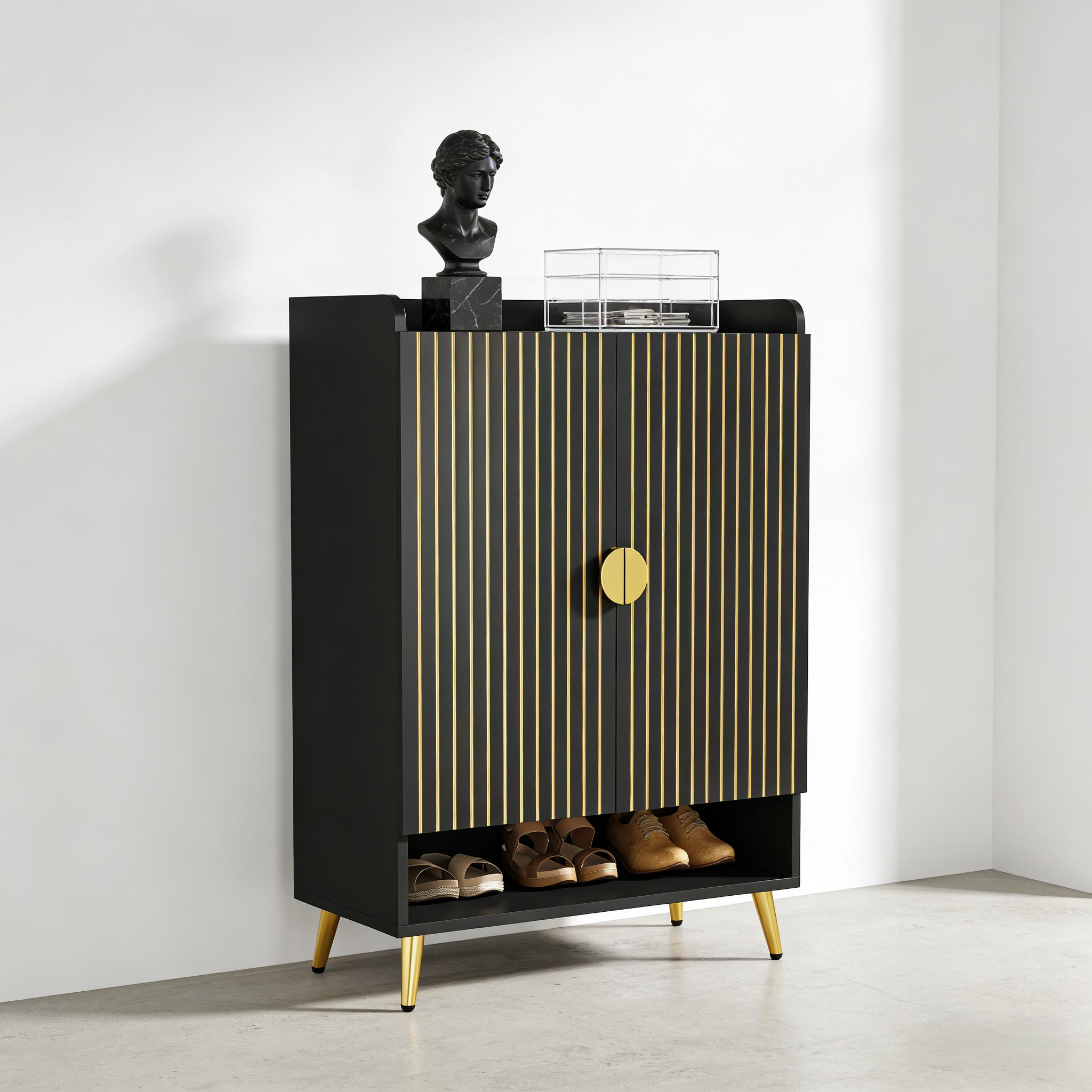 Important Reminder!!! 1) Attention: All products in our store do not support Canada self pickup ordering. Please do not create shipping labels for Canada. Our American products do not support self pickup to Canada 2)We do not ship to Alaska, Hawaii, US protectorates (e.g., Puerto Rico), P.O. boxes, or APO/FPO addresse 3)We don’t accept non-defective remorse returns Sturdy & Reliable - Swap your unstable shoe rack for our solid and durable adjustable shoe rack, made from premium E0 particle board. Large & Flexible - Our 7-tier shoe rack with adjustable panels accommodates various types of shoes, along with your bags and decor items. With the capability to hold up to 24 pairs of shoes, this 29.6" W x 14.6" D x 43.3" H storage solution keeps your shoes organized. Chic & Elegant - Impress your guests with this attractive shoe cabinet, featuring a waterproof, wood finish and golden metal accents. It adds modern, homely charm to any space. Compact & Practical - Functional yet simple, this entryway shoe storage cabinet can serve both as a shoe shelf or kitchen storage. Its swing doors offer hidden storage, making it a perfect clutter-free solution for your hallway, dorm, or garage. Easy Assembly - Simplify your life with the easy-to-assemble design of our shoe organizer.