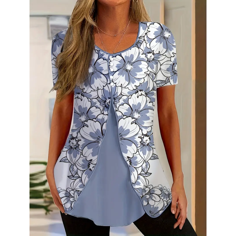 Summer New Short-sleeved Printed Fake Two-piece T-shirt V-neck Fashion Spike Top