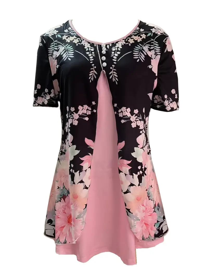 Summer New Short-sleeved Printed Fake Two-piece T-shirt V-neck Fashion Spike Top