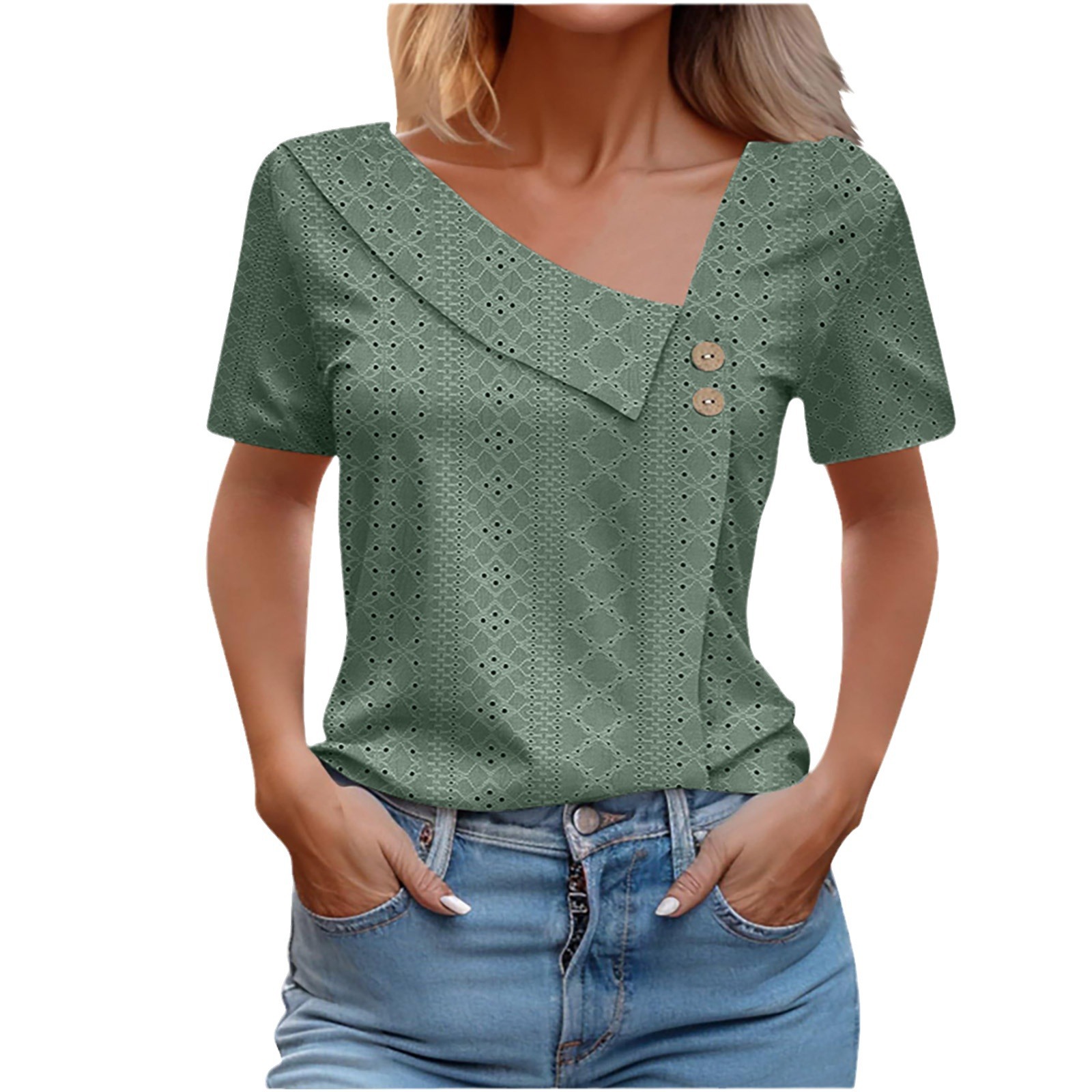 Summer V-neck Button Solid Color Loose Women's Short Sleeved T-shirts