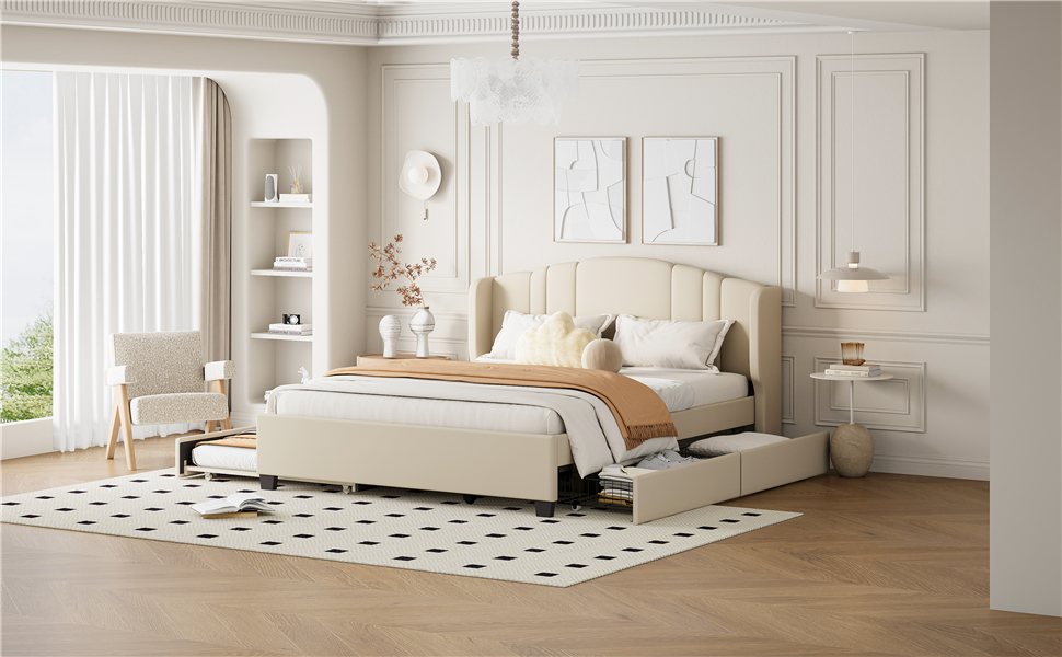 Product Name:Upholstered Platform Bed with Wingback Headboard, One Twin Trundle and 2 Drawers, No Box Spring Needed, Linen Fabric, Queen Size, Beige
