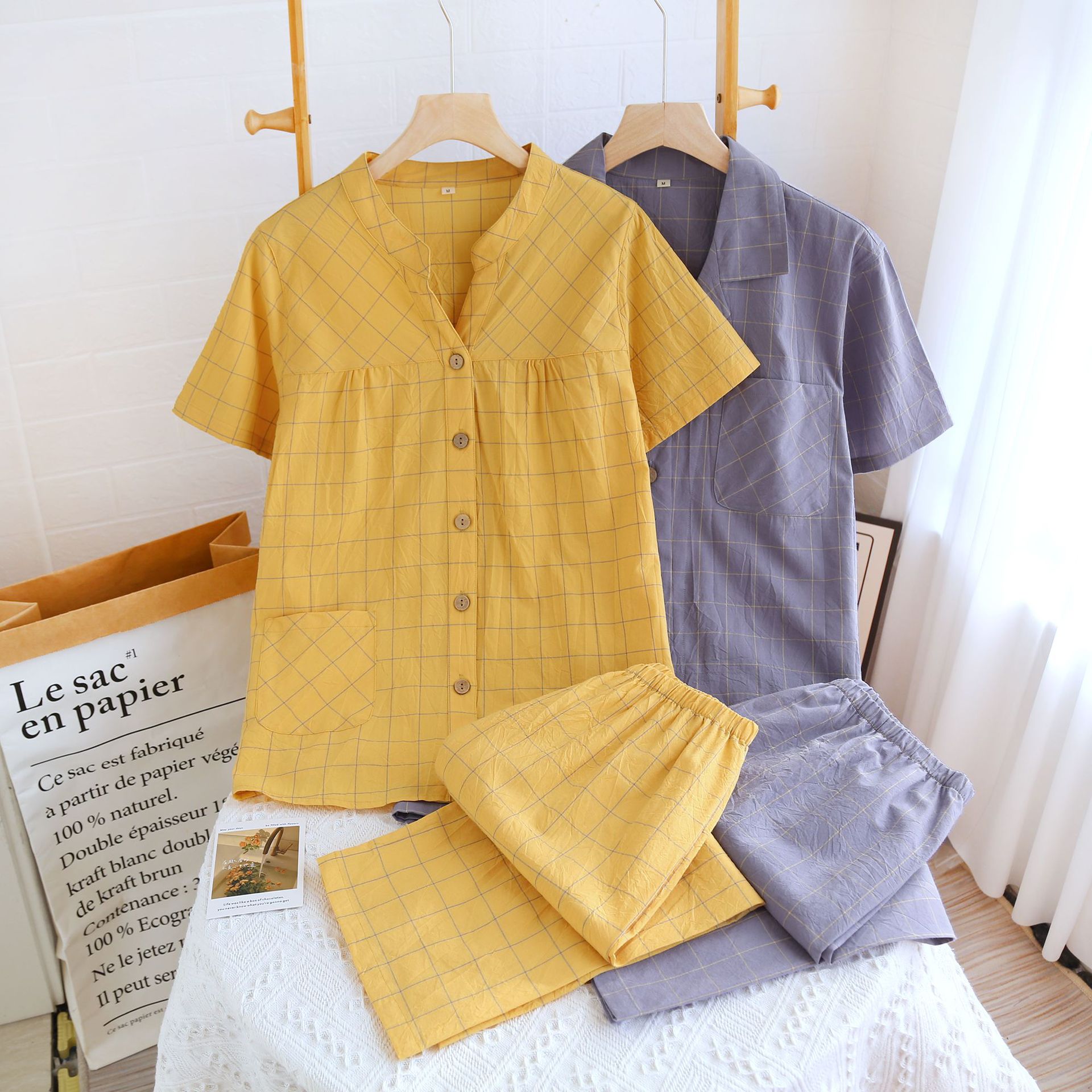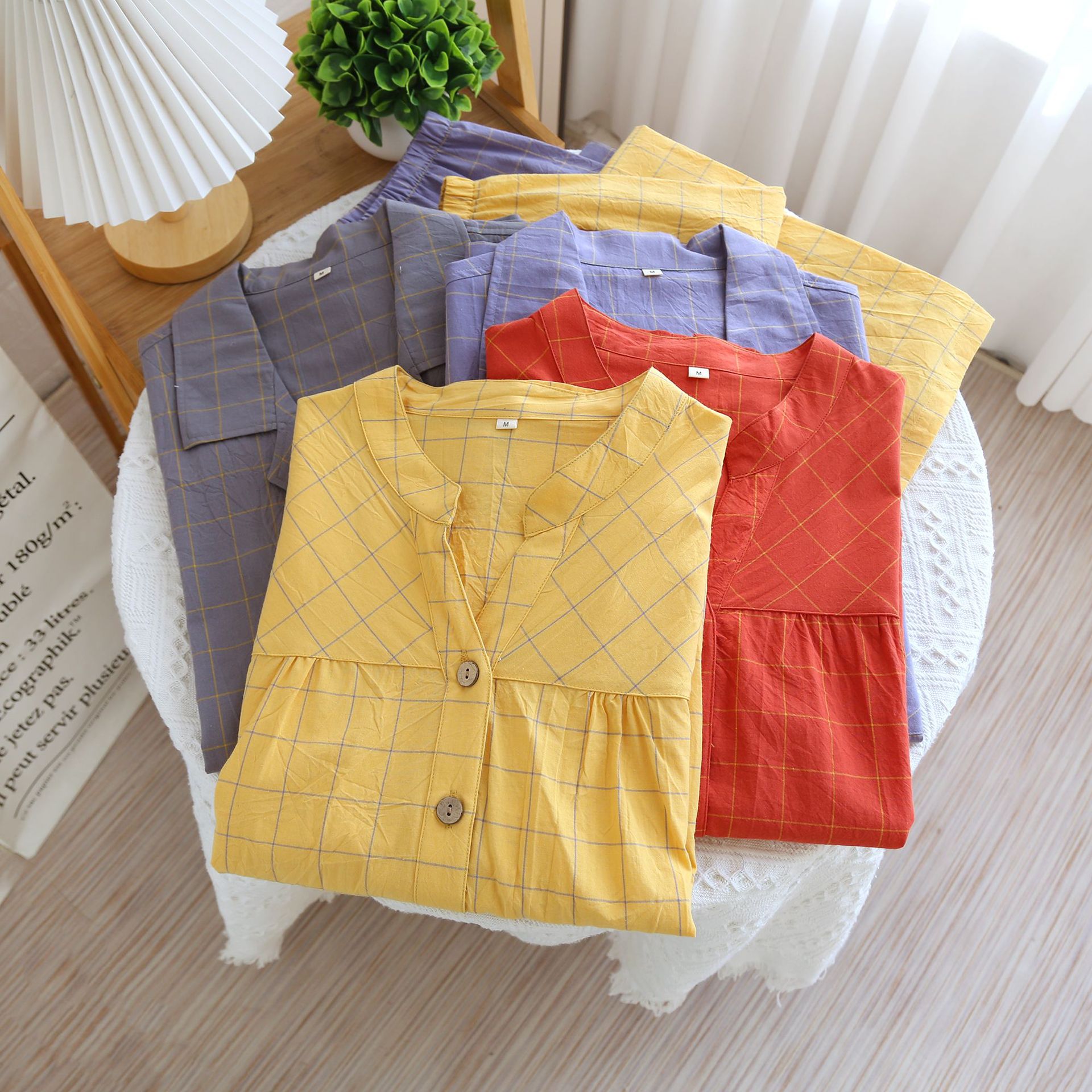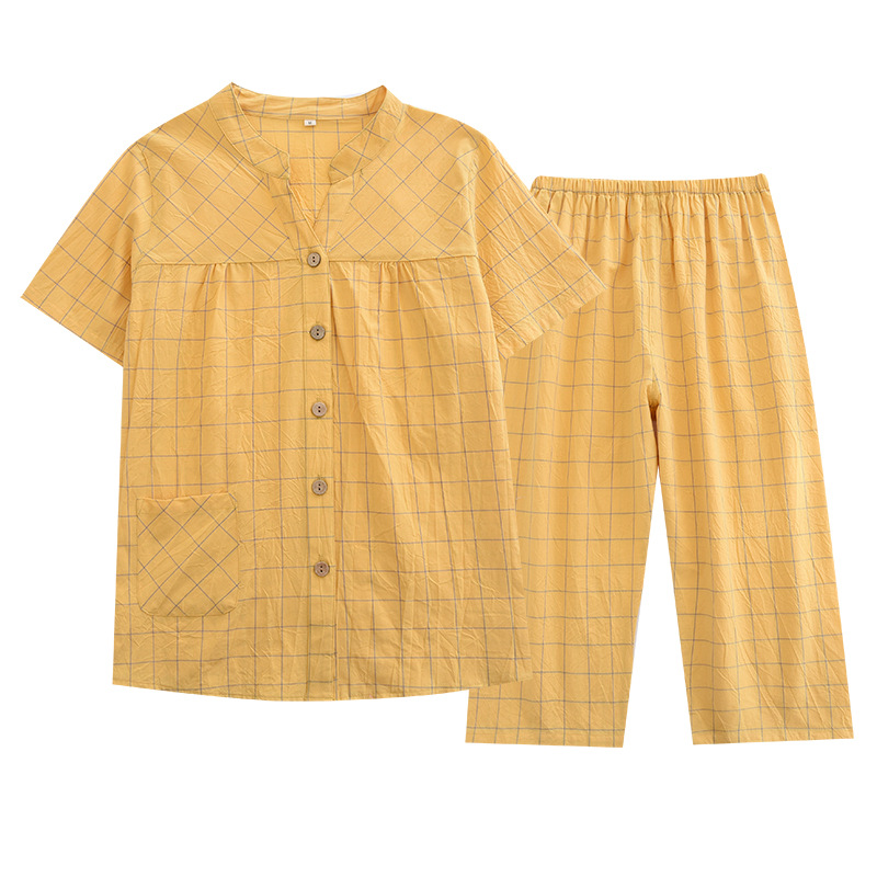 Color: washed cotton V-neck women's half sleeve cropped pack-single line Red large plaid, washed cotton V-neck women's half sleeve cropped pack-single line large plaid yellow, washed cotton male half sleeve short suit-single line large plaid gray, washed cotton male half sleeve short suit-single line large Grand