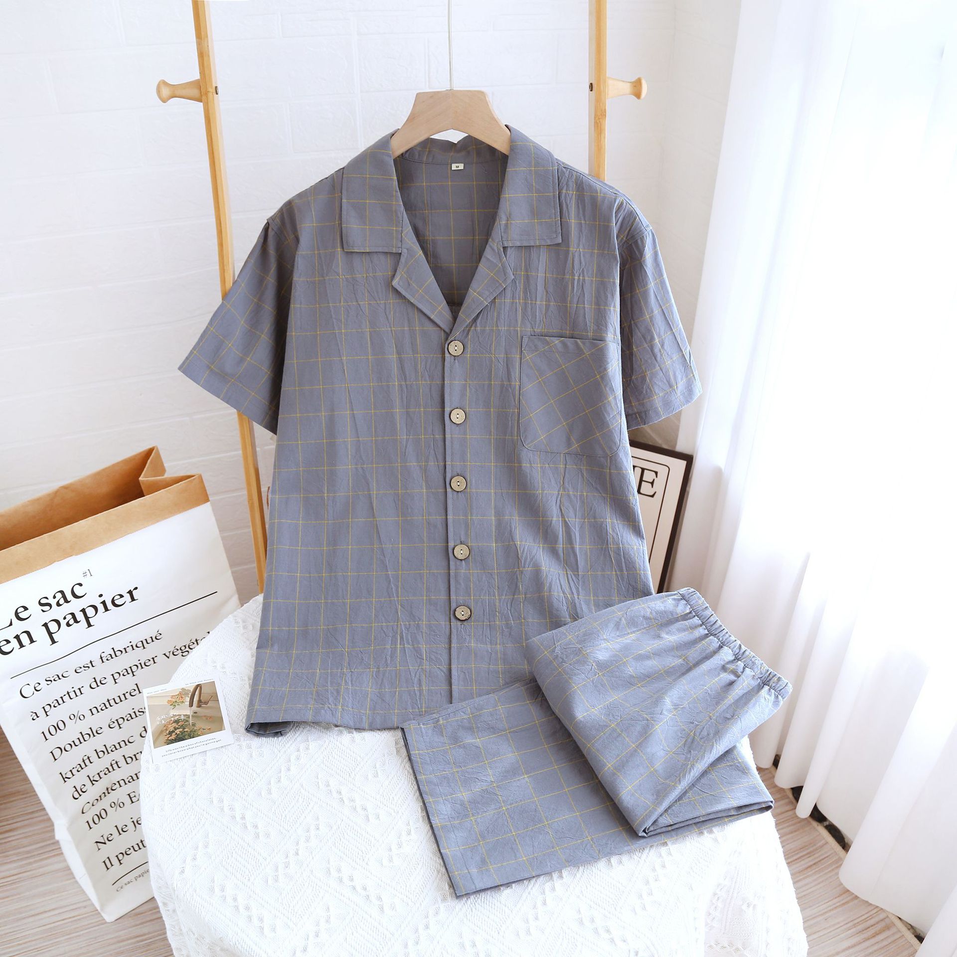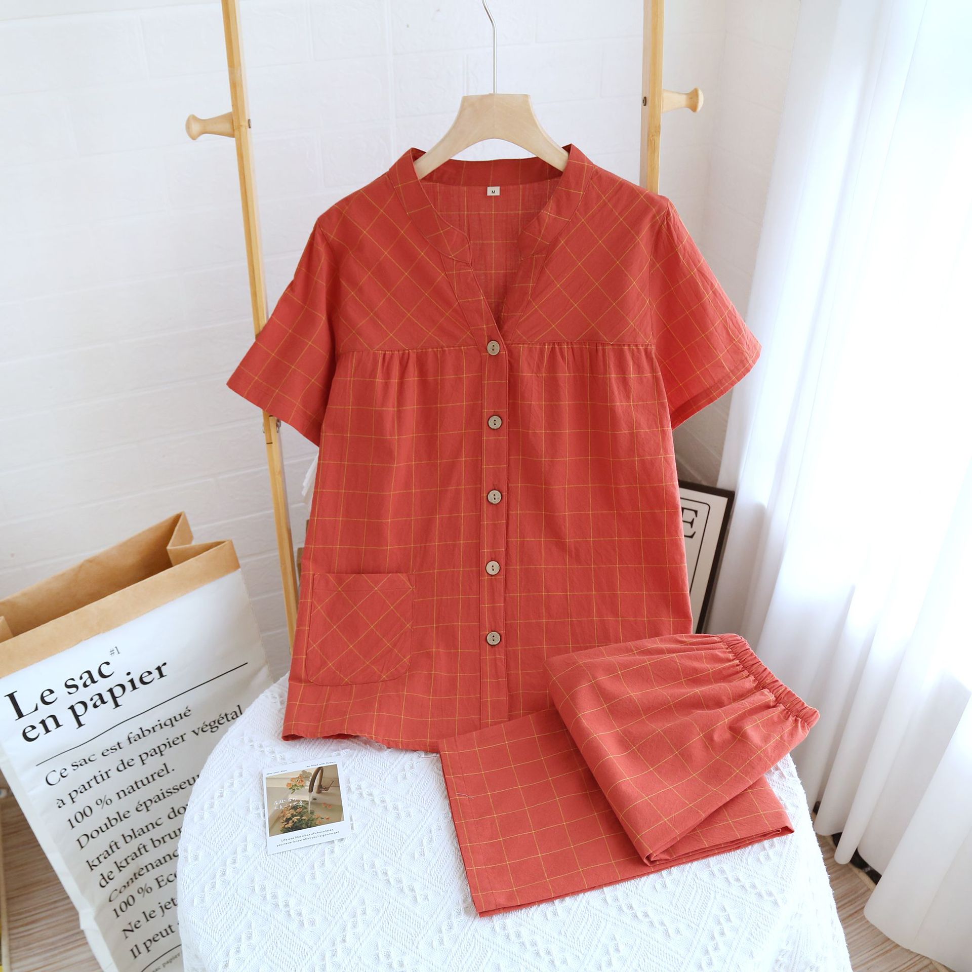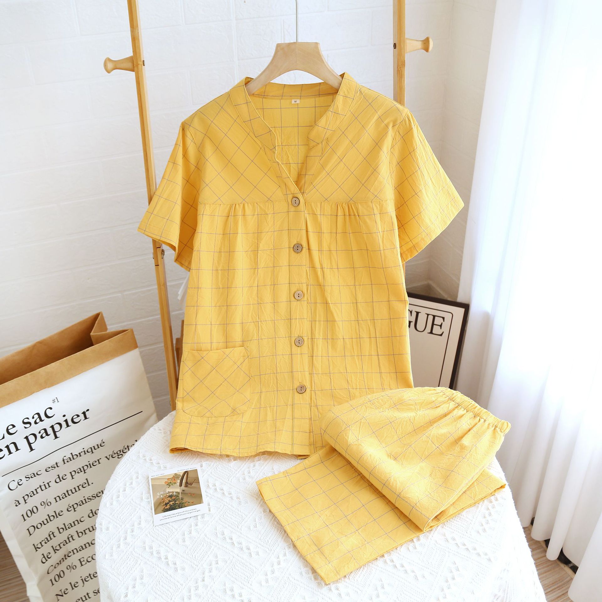 Color: washed cotton V-neck women's half sleeve cropped pack-single line Red large plaid, washed cotton V-neck women's half sleeve cropped pack-single line large plaid yellow, washed cotton male half sleeve short suit-single line large plaid gray, washed cotton male half sleeve short suit-single line large Grand
