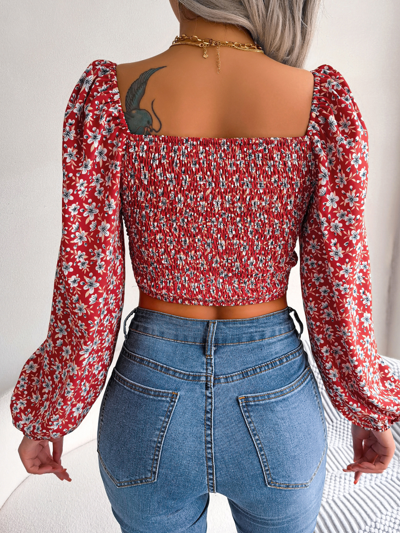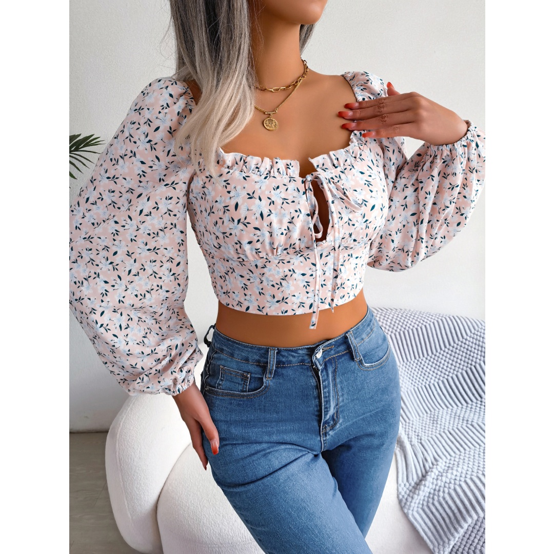 Women Sexy Ruffle Trim Tie Floral Print Chiffon Crop Top
