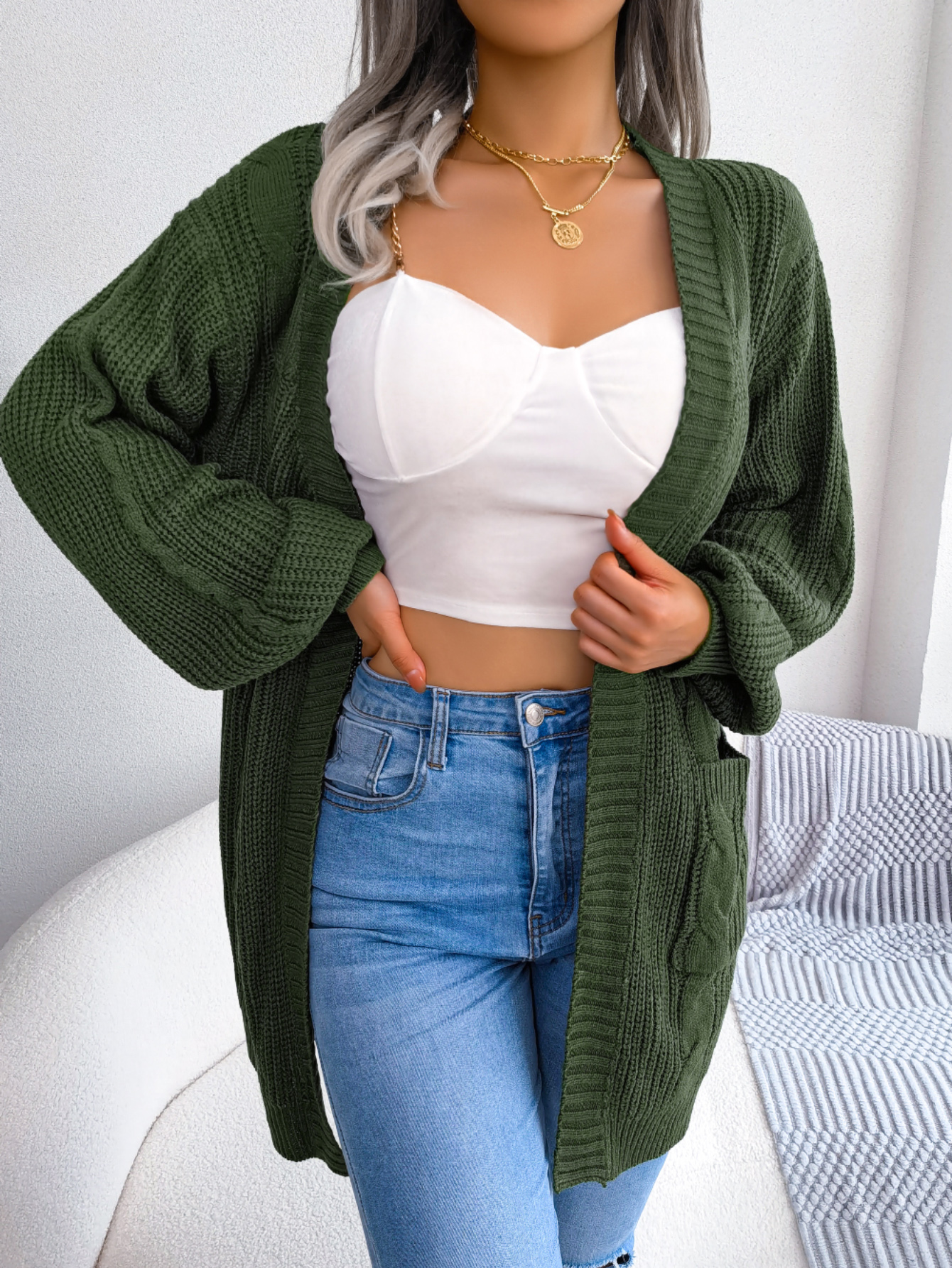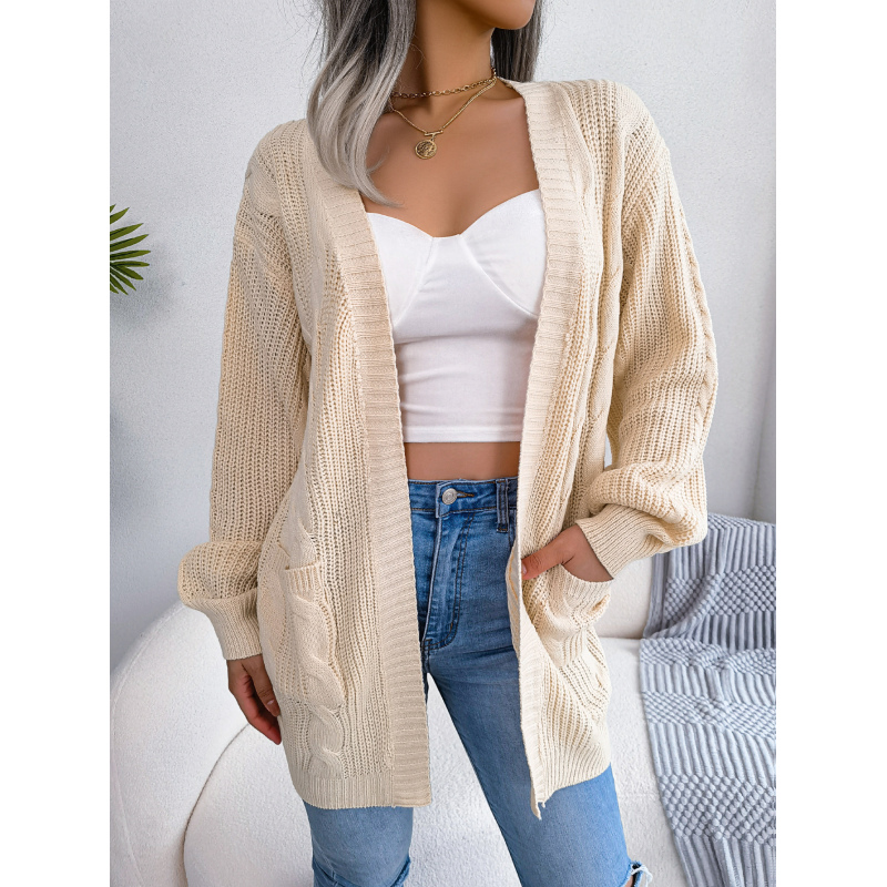 Women Cable Knit Lantern Sleeve Pocket Cardigan Sweater Coat
