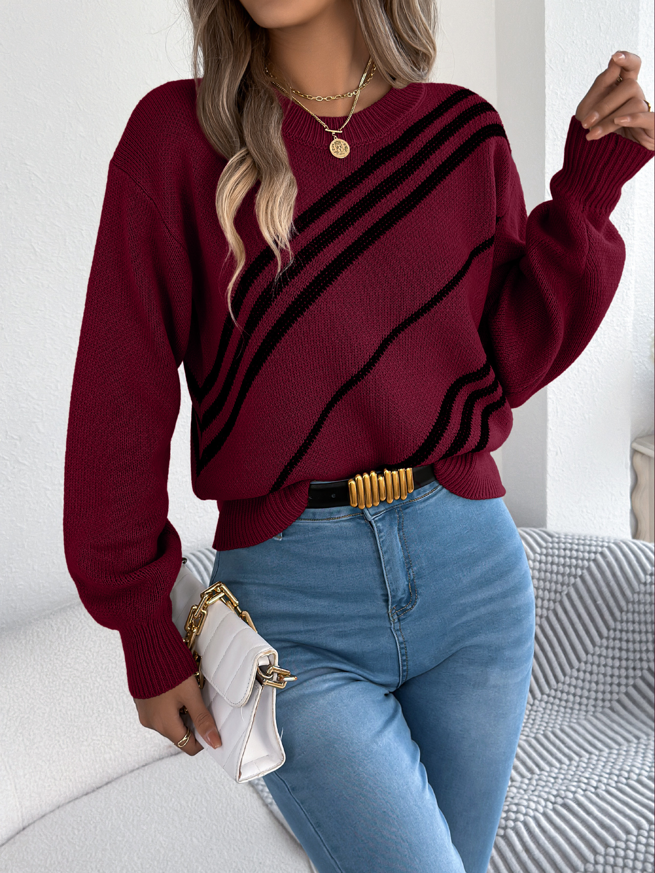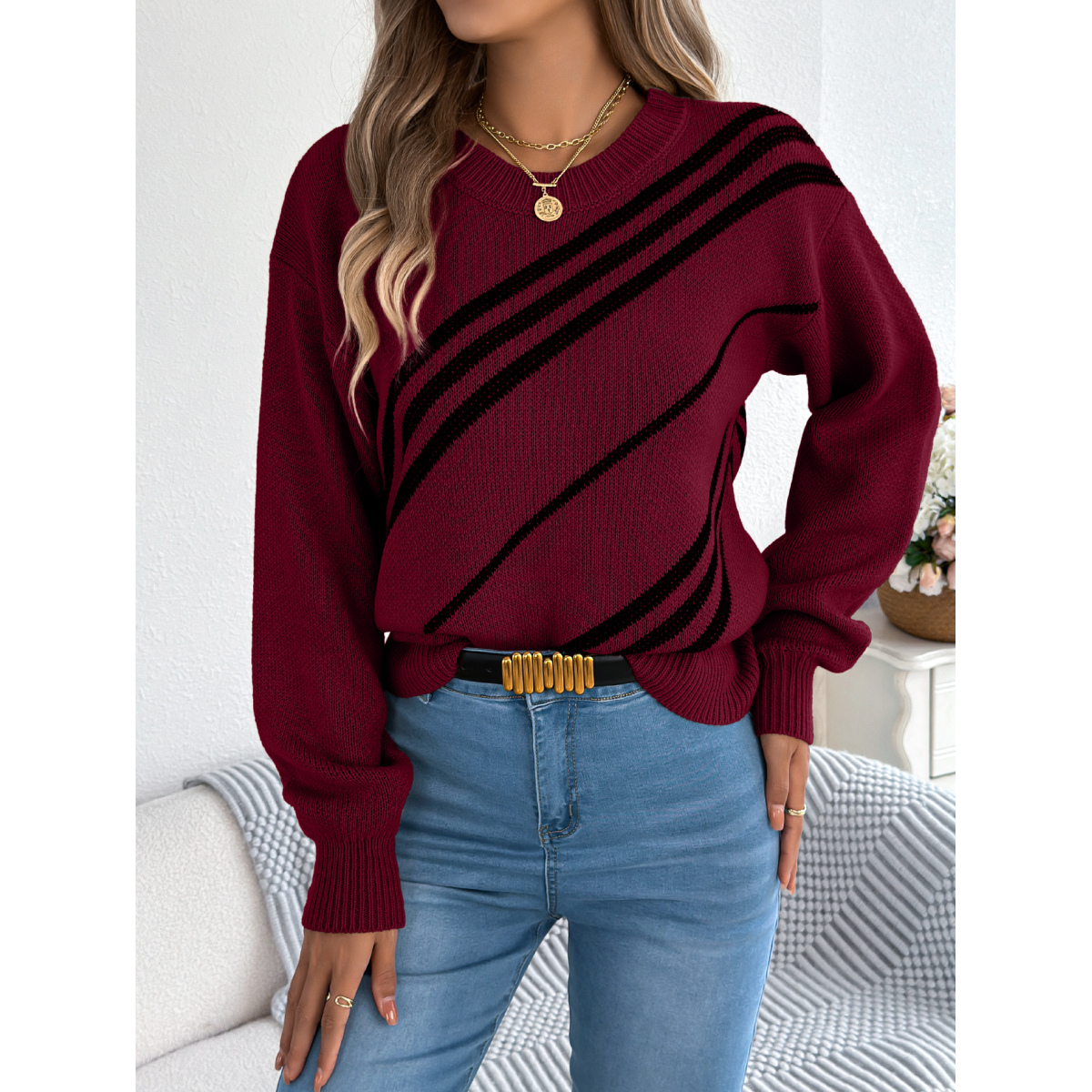 Women Casual Striped Round Neck Lantern Sleeve Long Sleeve Pullover Sweater
