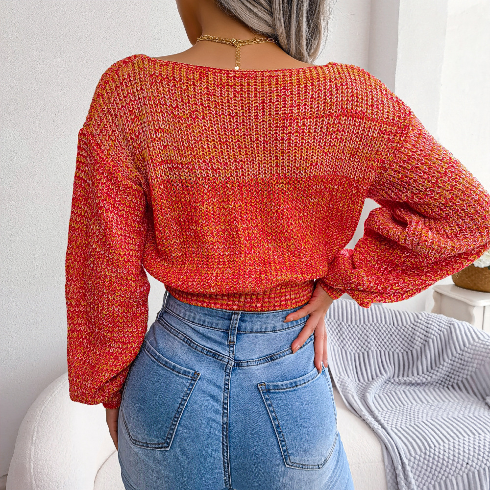Women Colorful Cross V-Neck Lantern Sleeve Cropped Sweater