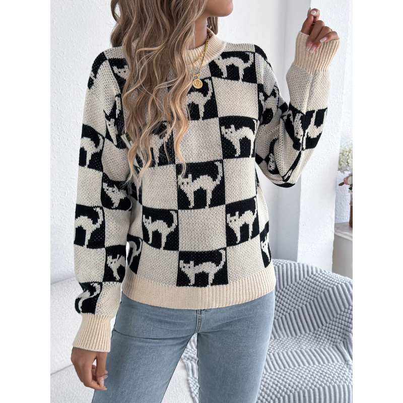 Women Halloween Plaid Lantern Sleeve Long Sleeve Pullover Sweater