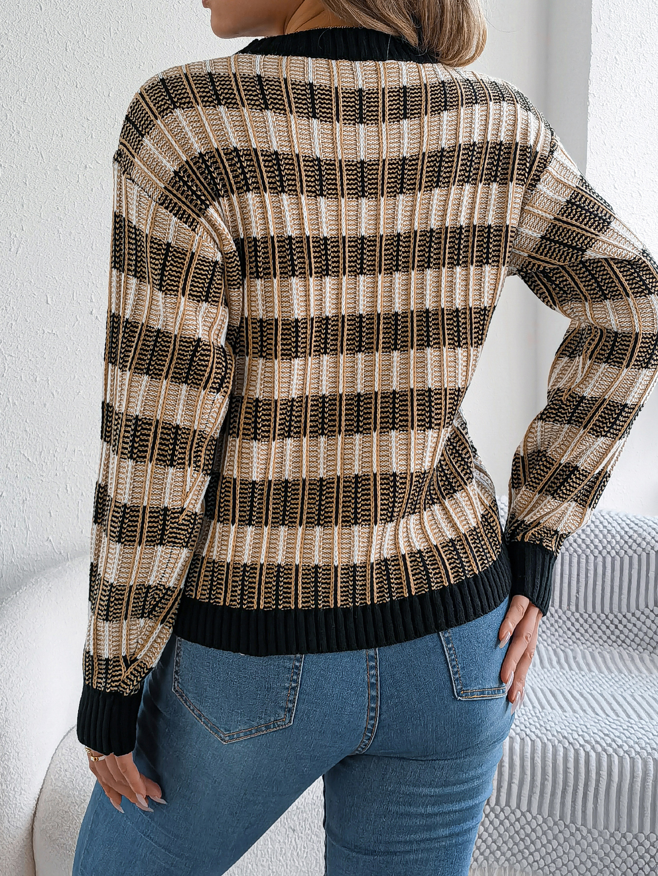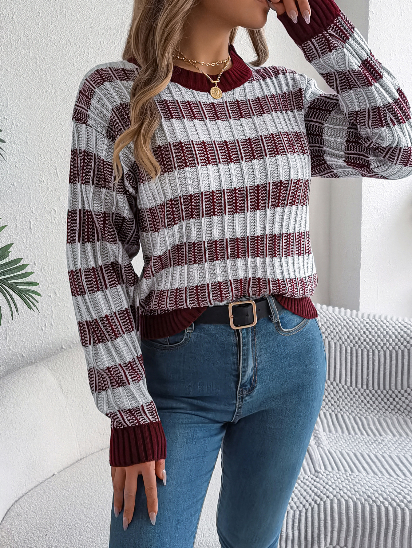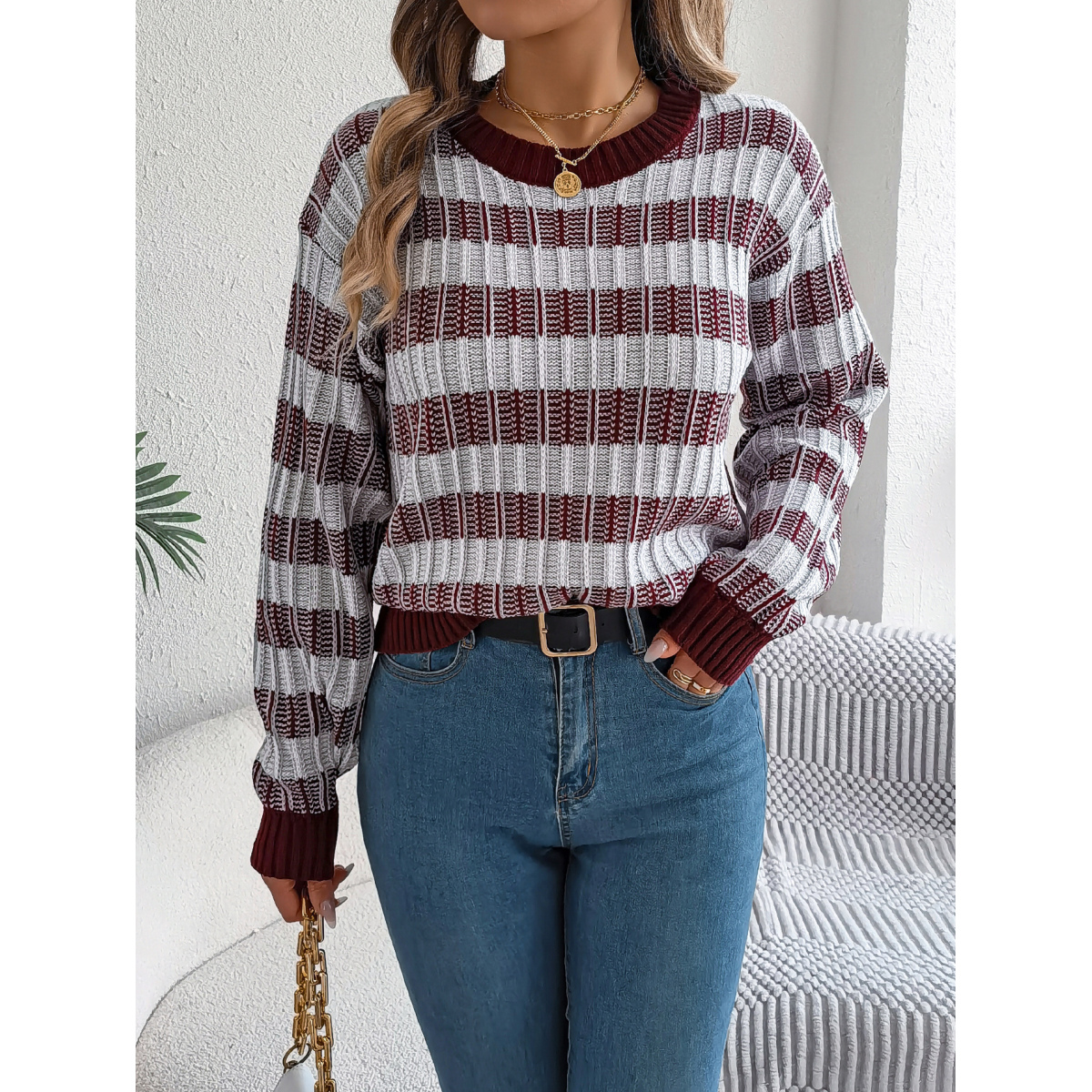 Women Round Neck Retro Stripe Lantern Sleeve Long Sleeve Pullover Sweater
