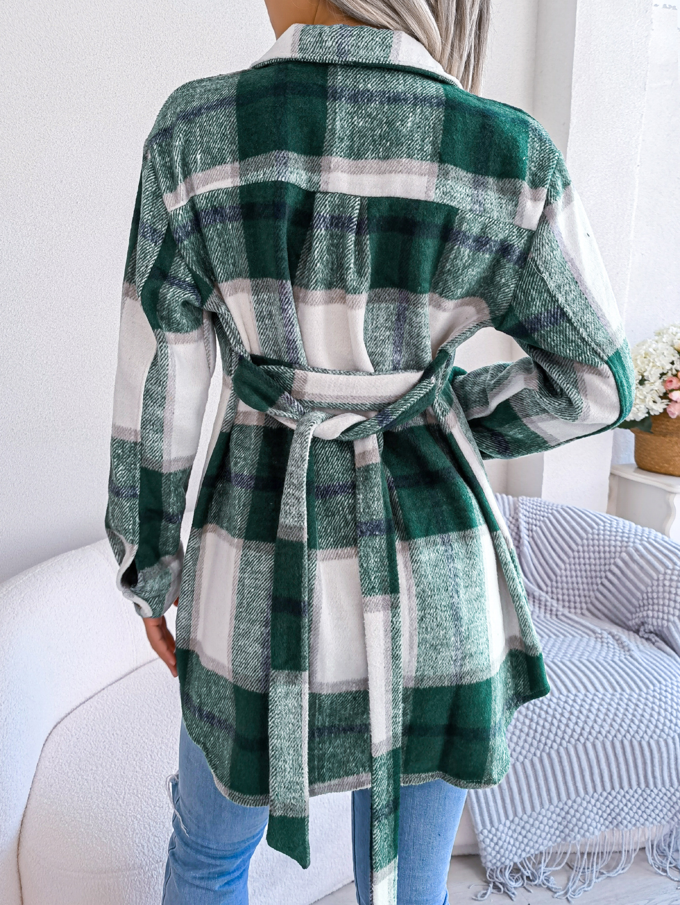 Women's Color-Blocked Plaid Long Sleeve Tie-Waist Thick Tweed Coat