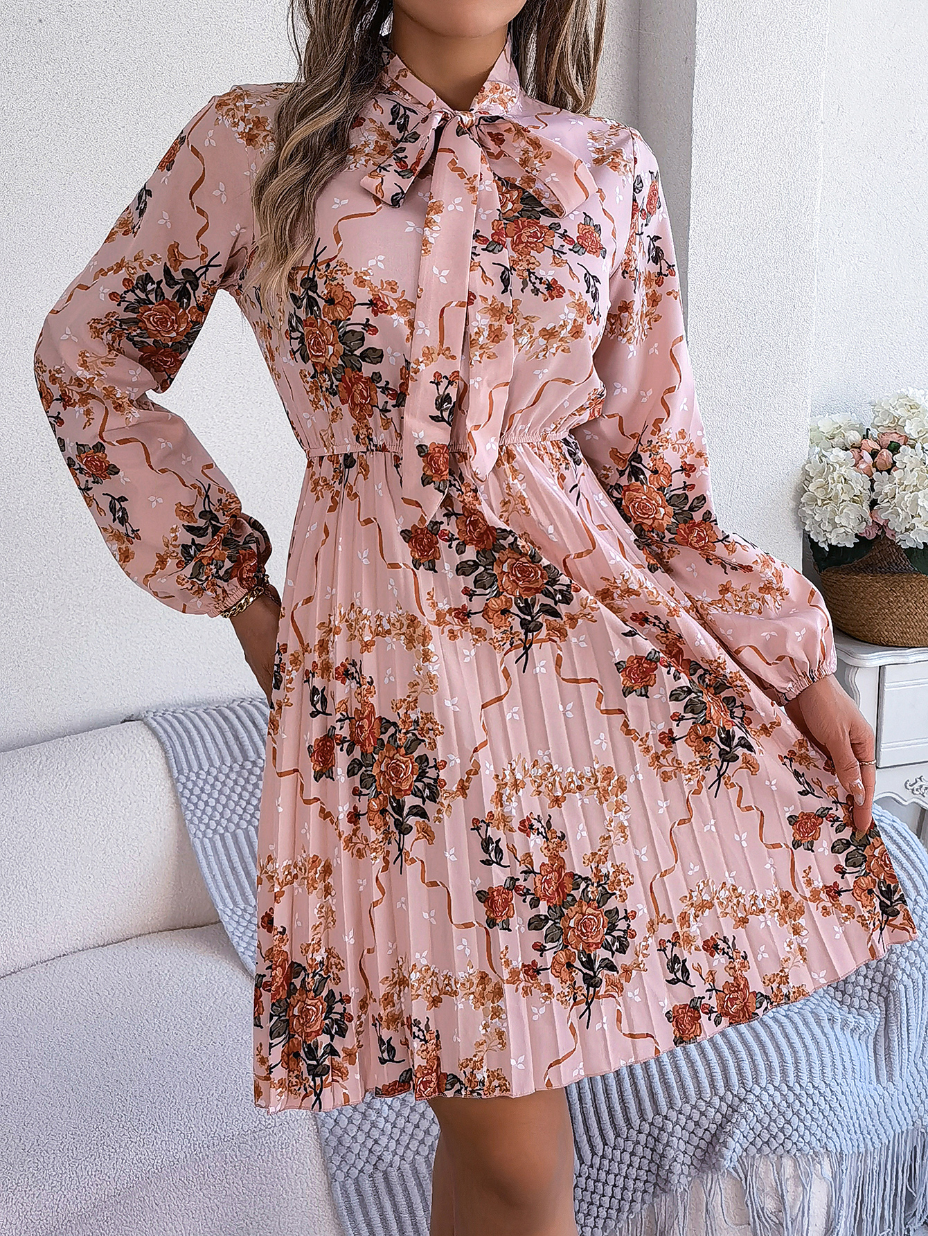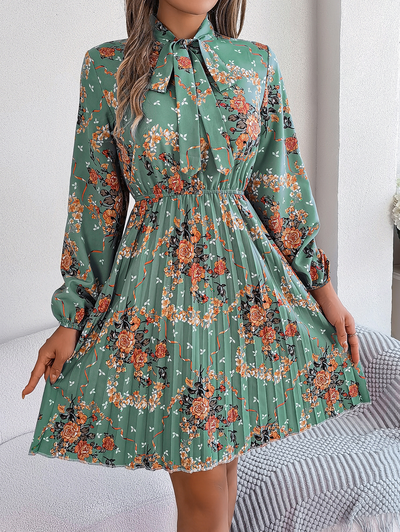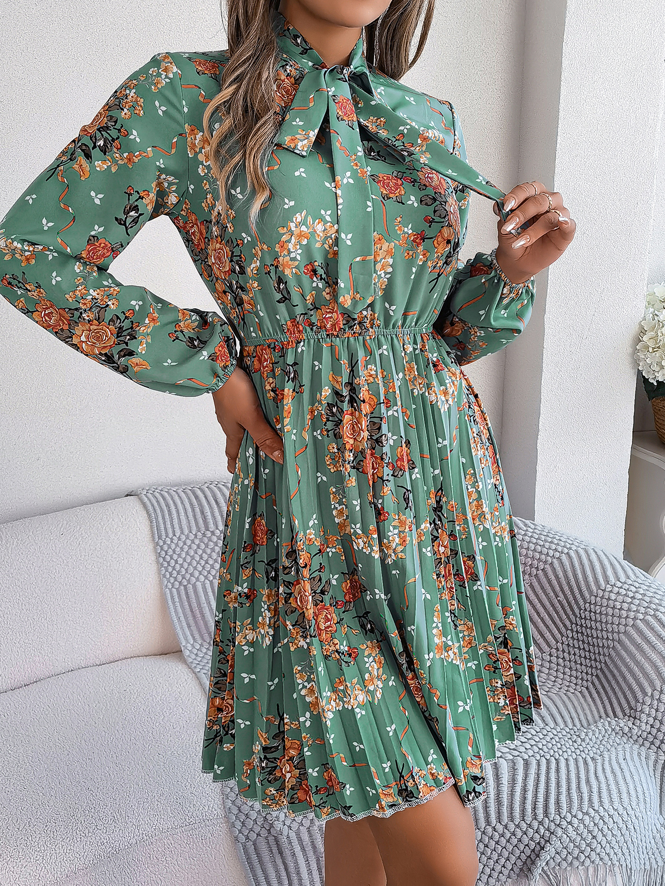 Women's Elegant Floral Tie-Waist Long Sleeve Pleated Maxi Dress