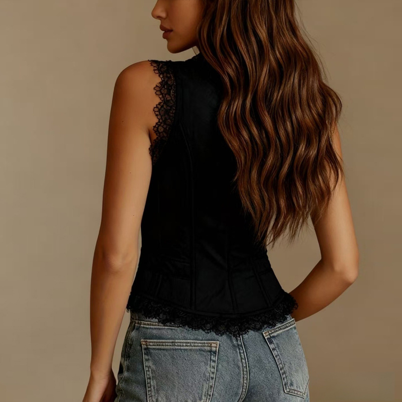 Step up your style game with our Women's Lace Trim Button Down Crop Top. This sleeveless tank is the perfect blend of edgy and elegant, designed to turn heads wherever you go. Whether you're hitting the club, heading to a festival, or enjoying a dinner date, this top provides a sleek, fashion-forward look that's both sexy and sophisticated.