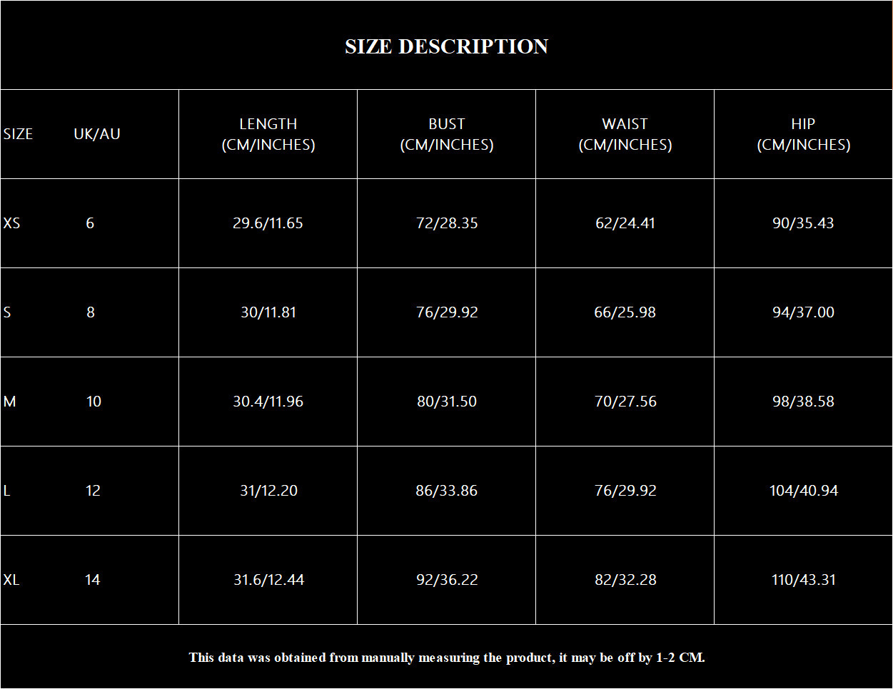 Note:1. Asian sizes are 1 to 2 sizes smaller than European and American people. Choose the larger size if your size between two sizes. Please allow 2-3cm differences due to manual measurement. 2. Please check the size chart carefully before you buy the item, if you don't know how to choose size, please contact our customer service. 3.As you know, the different computers display colors differently, the color of the actual item may vary slightly from the following images.