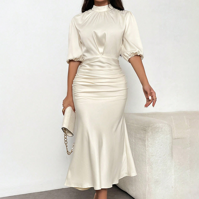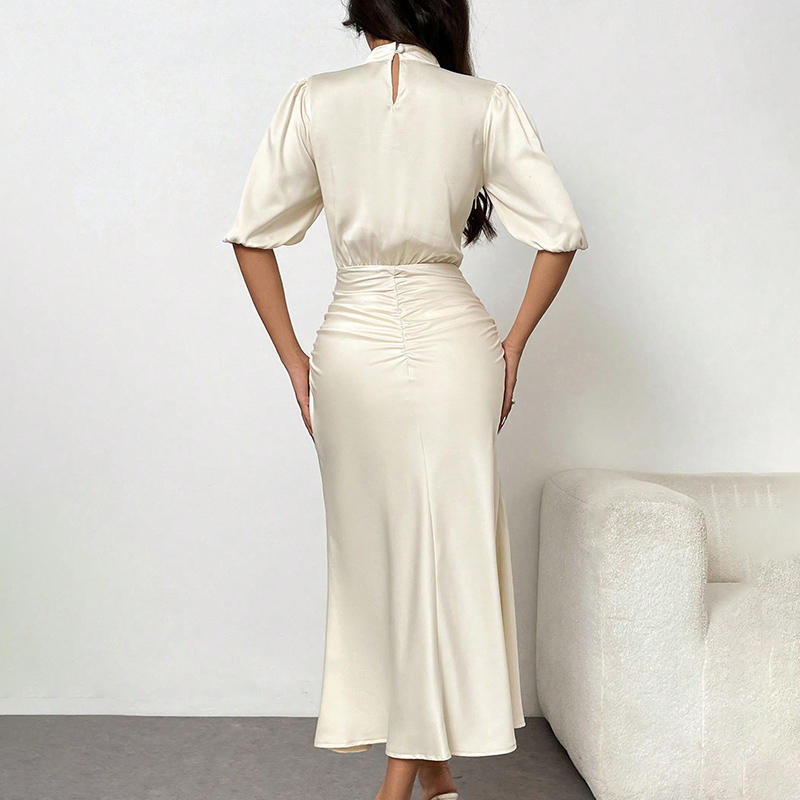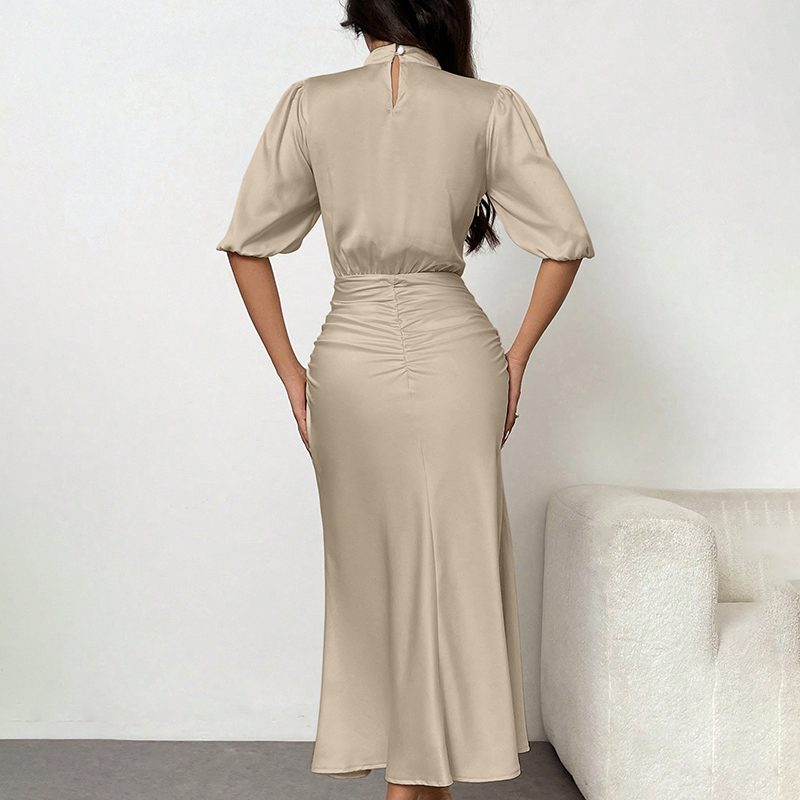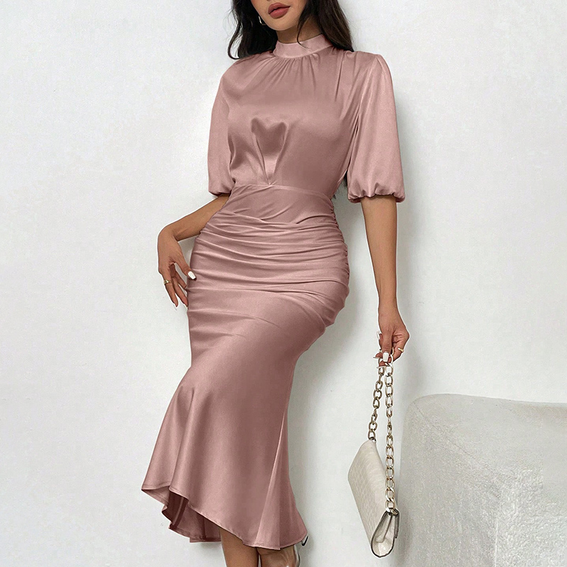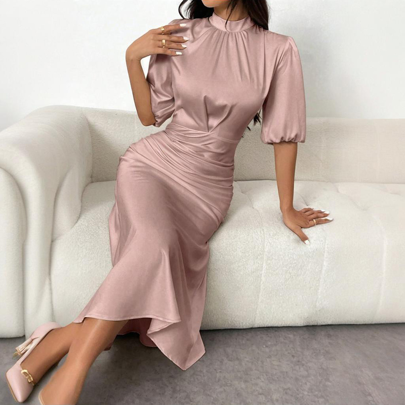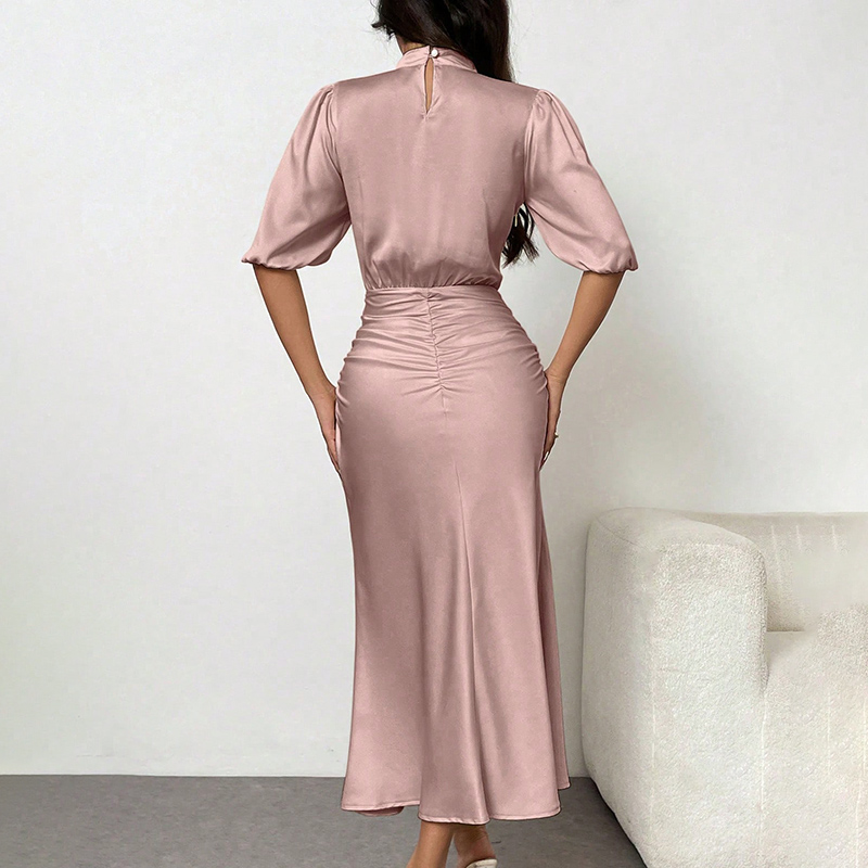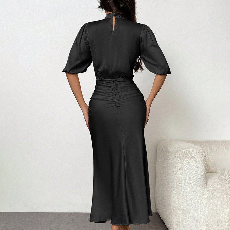 Turn heads with timeless elegance in this Women's Short Sleeve Ruched Midi Dress, crafted for confident, modern women. Featuring a chic mock neck, slim fit silhouette, and flattering ruched detailing, this dress hugs your curves and enhances your figure for any occasion—whether it’s a cocktail party, dinner date, or formal event.