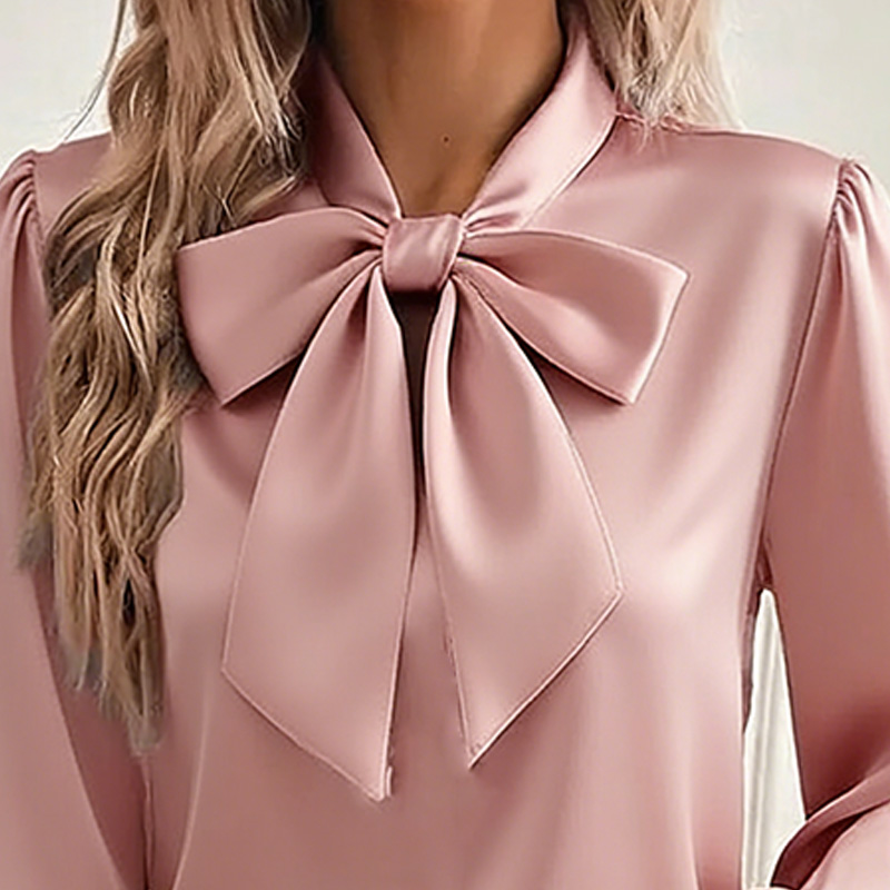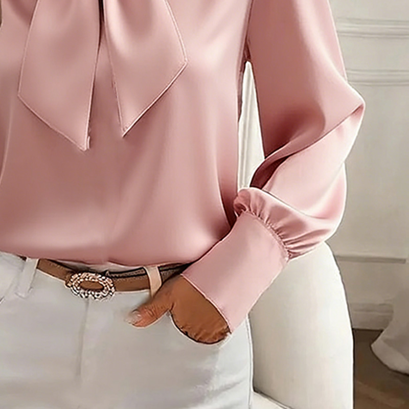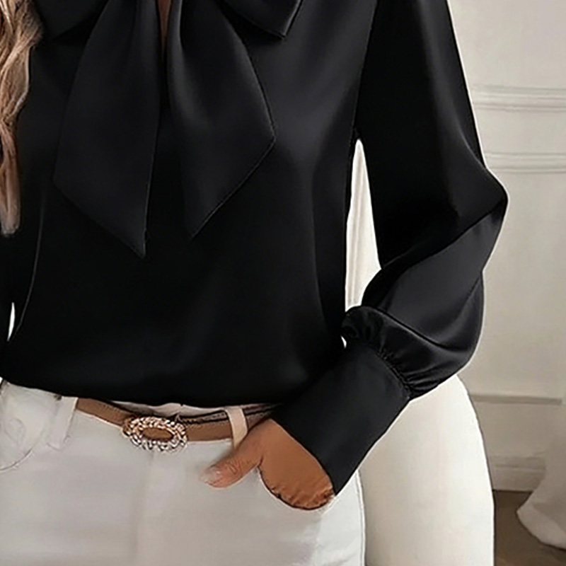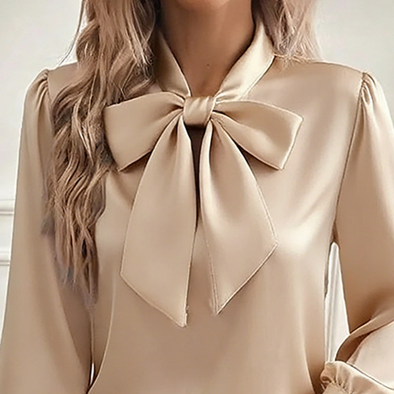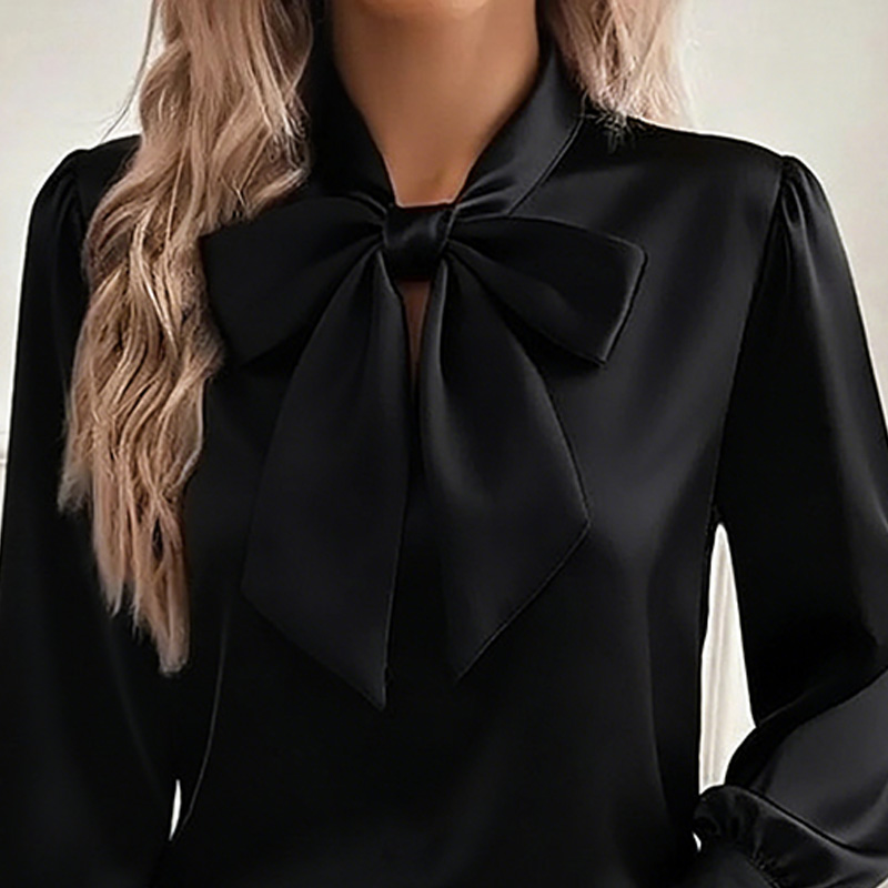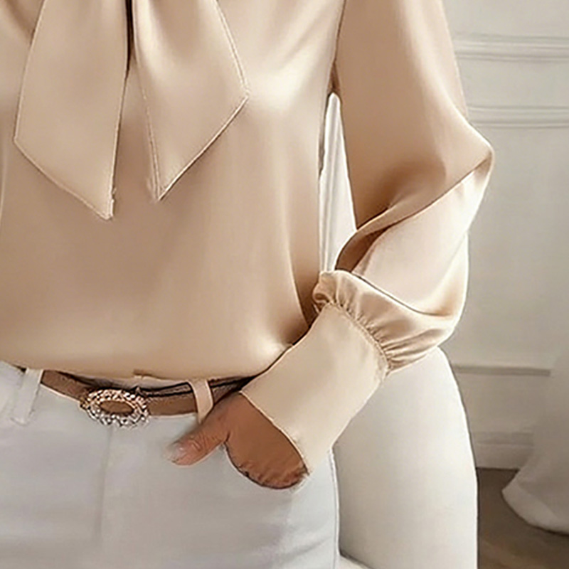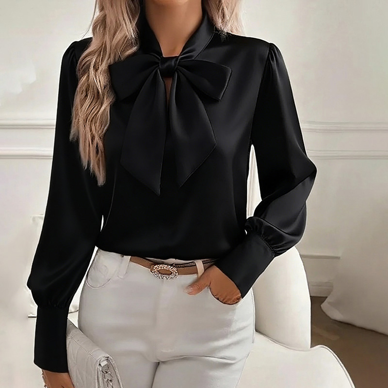 This exquisite long-sleeve shirt combines the luxurious sheen of satin with a delicate bow accent, creating a perfect balance between sophistication and everyday wearability. The graceful drape of the premium fabric and the feminine bow detail make this top an essential piece for your transitional season wardrobe.