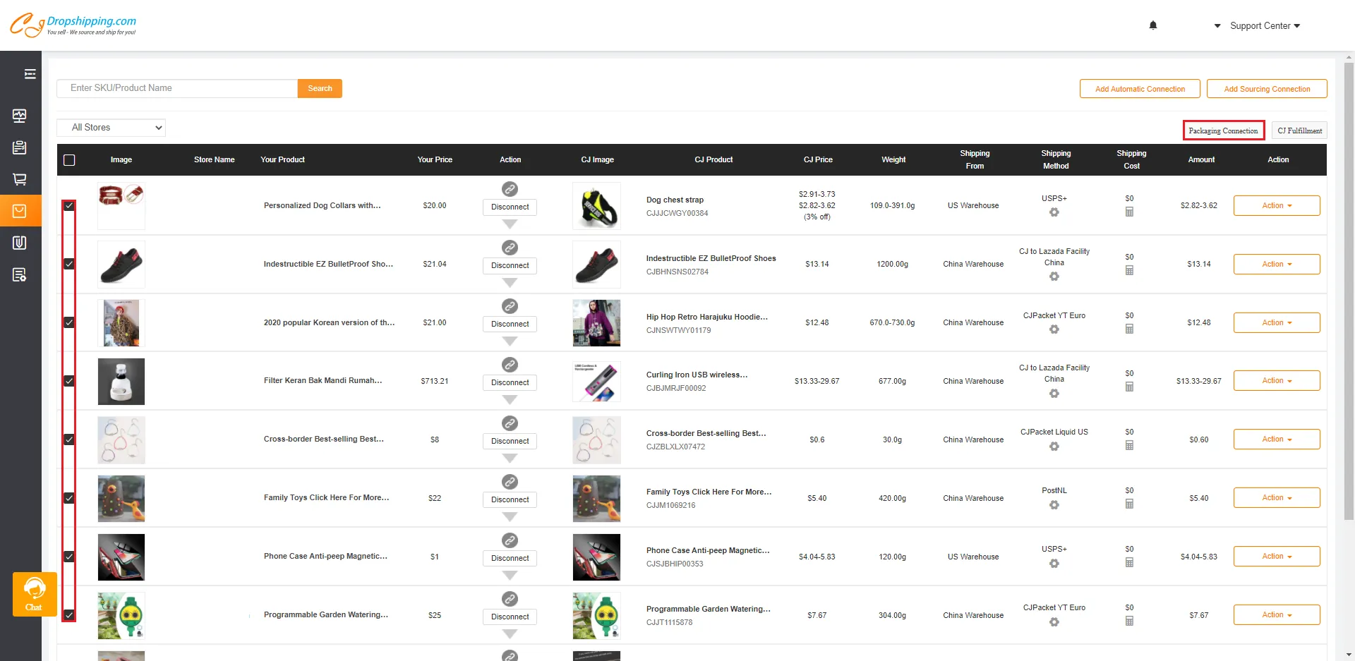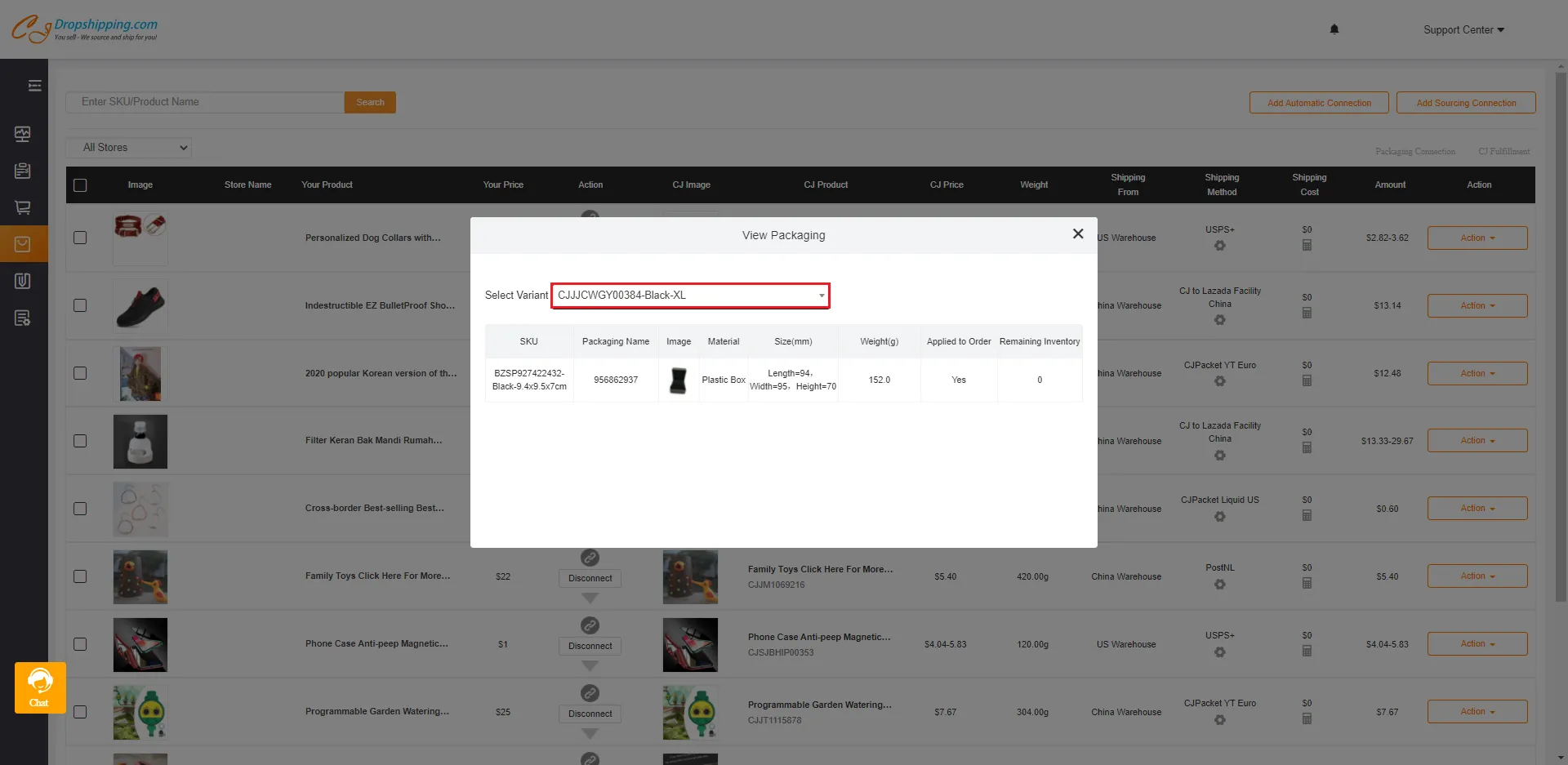 If you have many listed products and want to connect them all with one type of packaging, CJ supports connecting the package in bulk now.