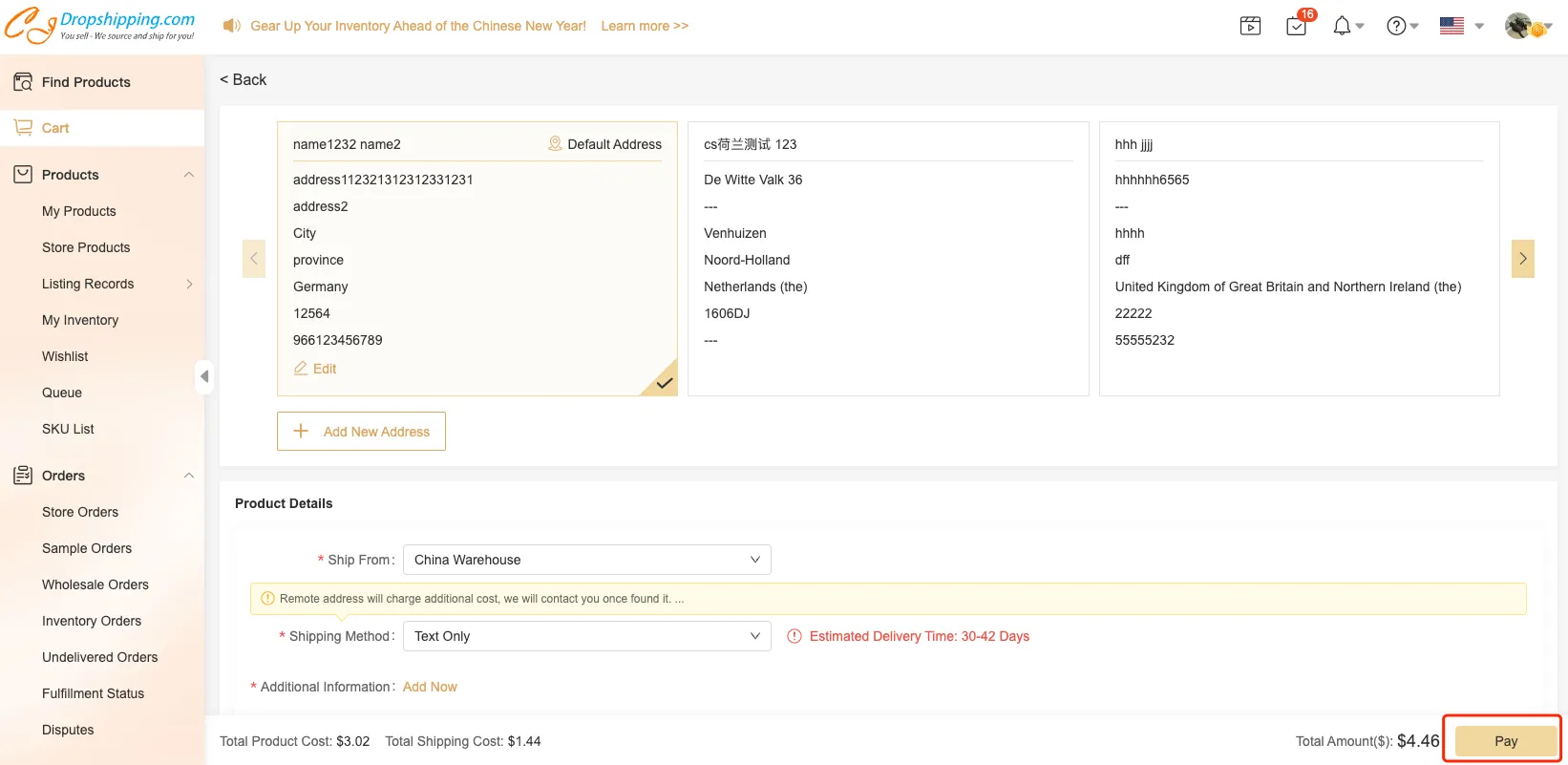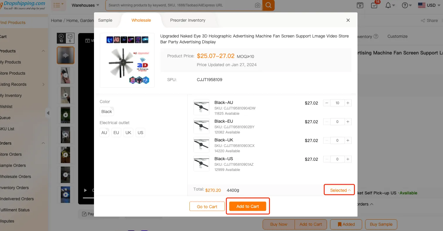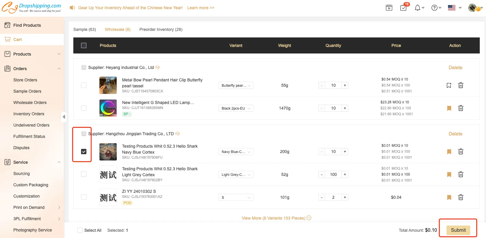 3. Go to the Cart-Wholesale and select the product. Then submit the order.
