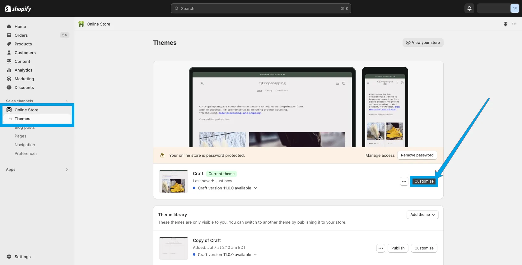 2. Enter Shopify > Online Store > Themes, and click "Customize";