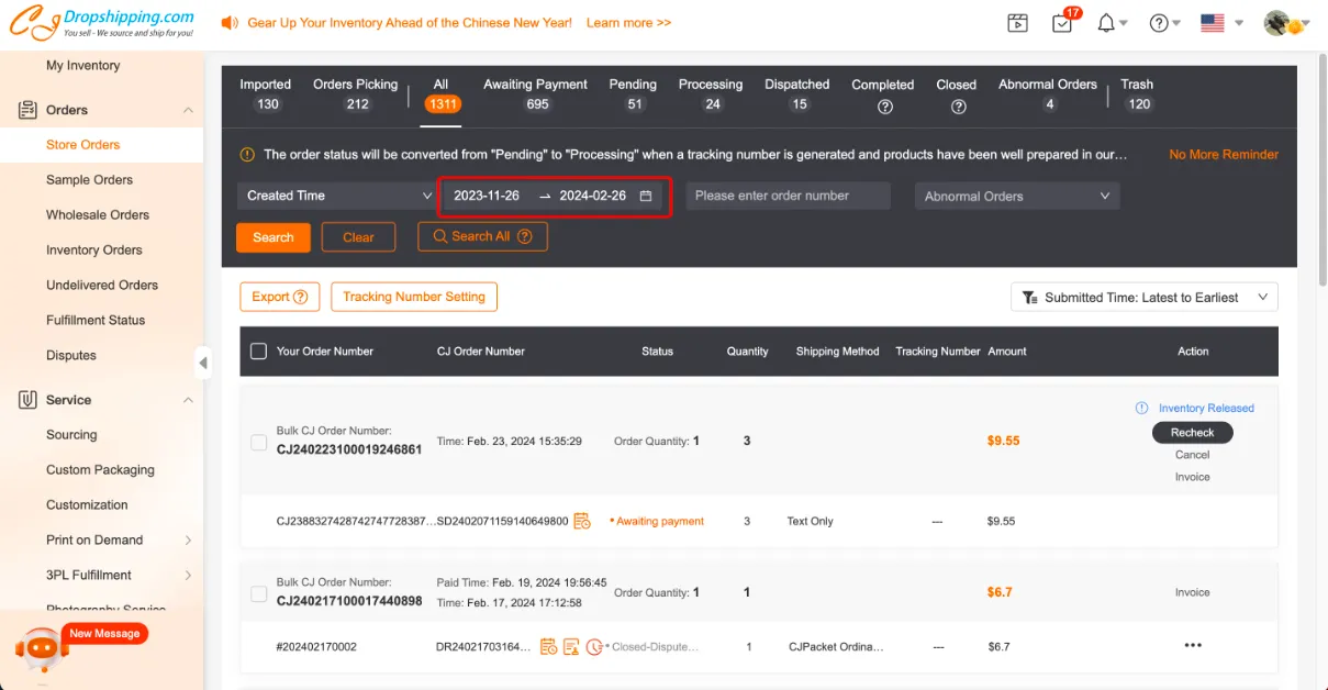 4. Orders will be archived 15 days after being closed. You can still search them using the CJ order number or the store order number.