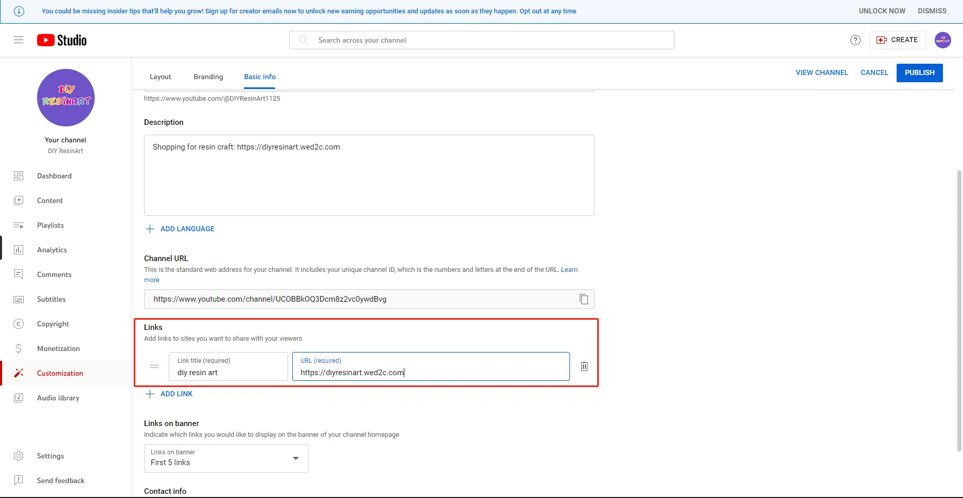 3. Add a link to your store on Youtube. Navigate to YouTube-About-Customize channel-Links.