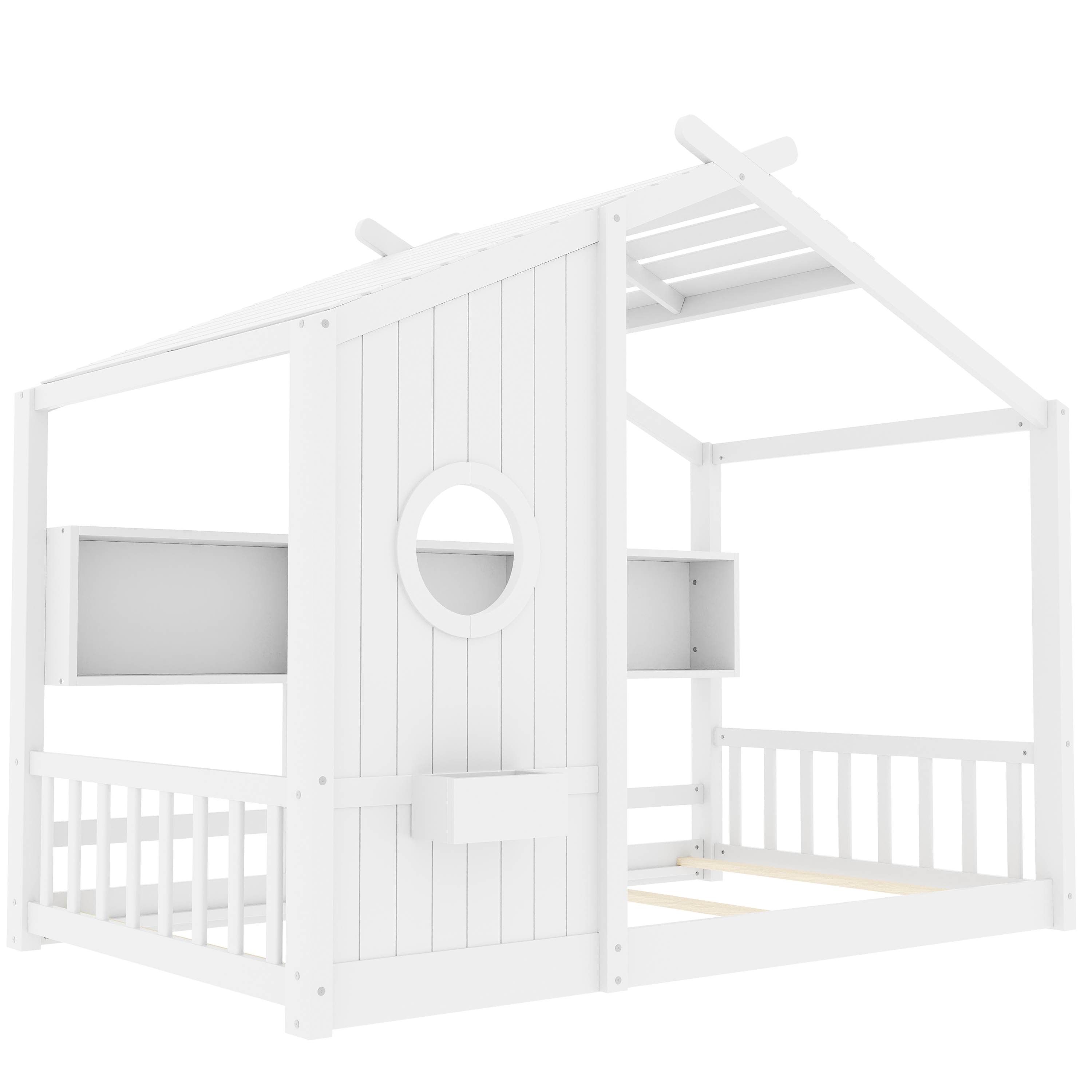 Floor House Bed for Toddler, Kids Montessori Bed with Storage Shelf, Playhouse Bed with Roof Design