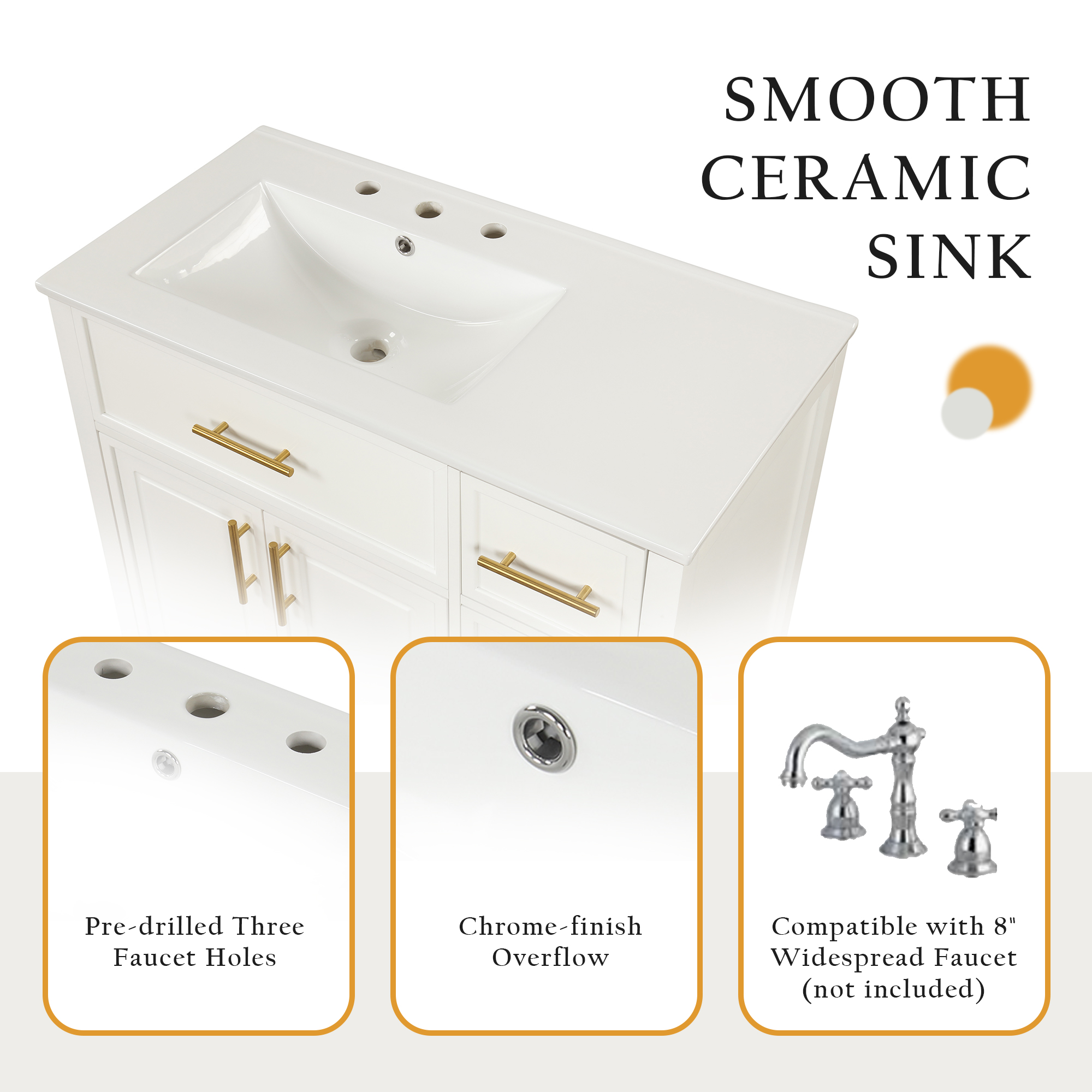 • Ceramic Sink: Made of solid ceramic, this white sink has an overflow and three faucet holes. It is so easy to clean that you can keep it smooth and shinning effortlessly. 8" faucet will fit this sink (not included). The cabinet's sink is on the left and ample storage space is reserved on the right so you can place some daily necessities such as towels and cups on it.