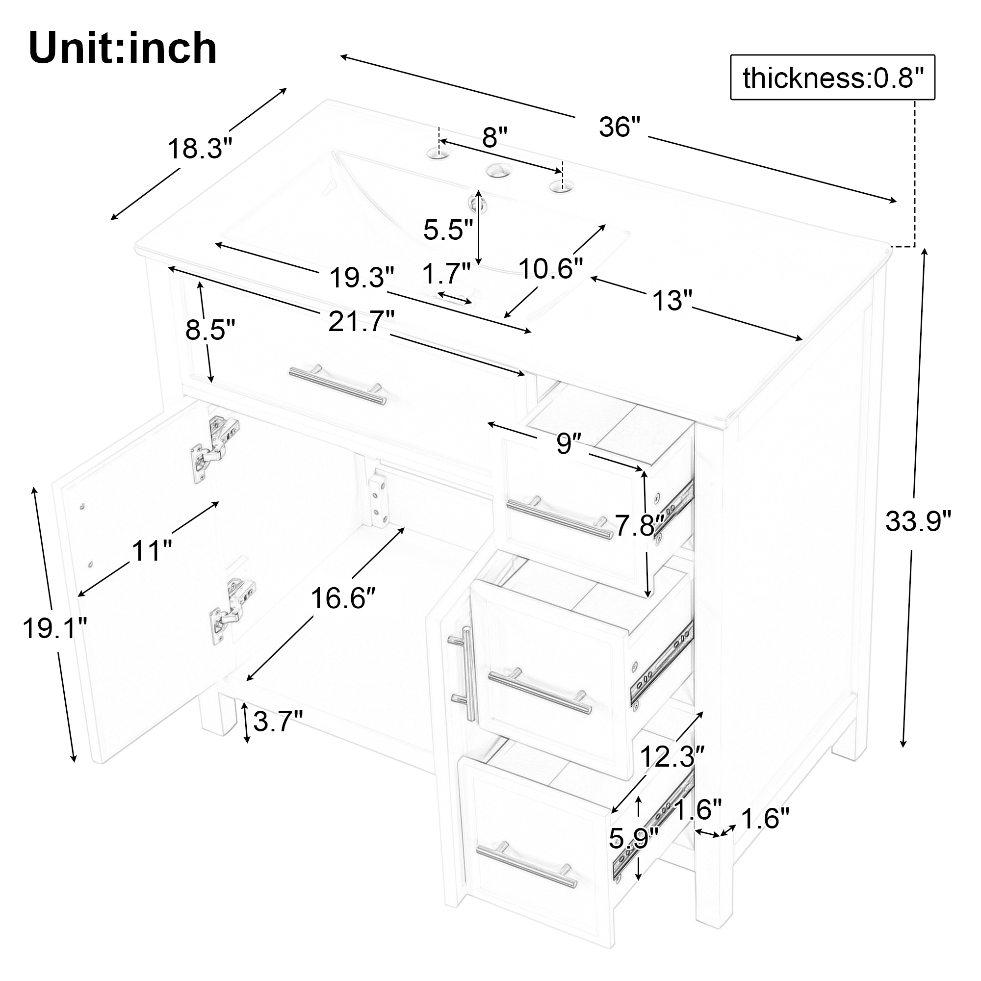 1. 36" Bathroom Vanity with Sink 2. Solid Rubber Wood & High-quality MDF Board & Ceramic Sink & Painted Finish 3. One Cabinet with Doors & Three Drawers 4. One Package Details 1.Metal Handle 2. Drawer Slide Rails 3. Solid Wood Feet