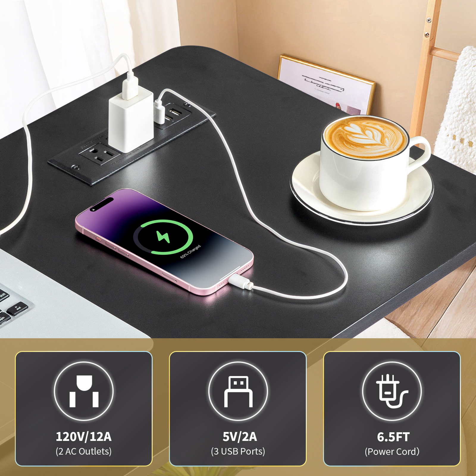 •Multi-functional Design: Equipped with 3 USB ports and 2 AC outlets, this desk offers convenient charging options for multiple devices, making it perfect for modern workspaces.