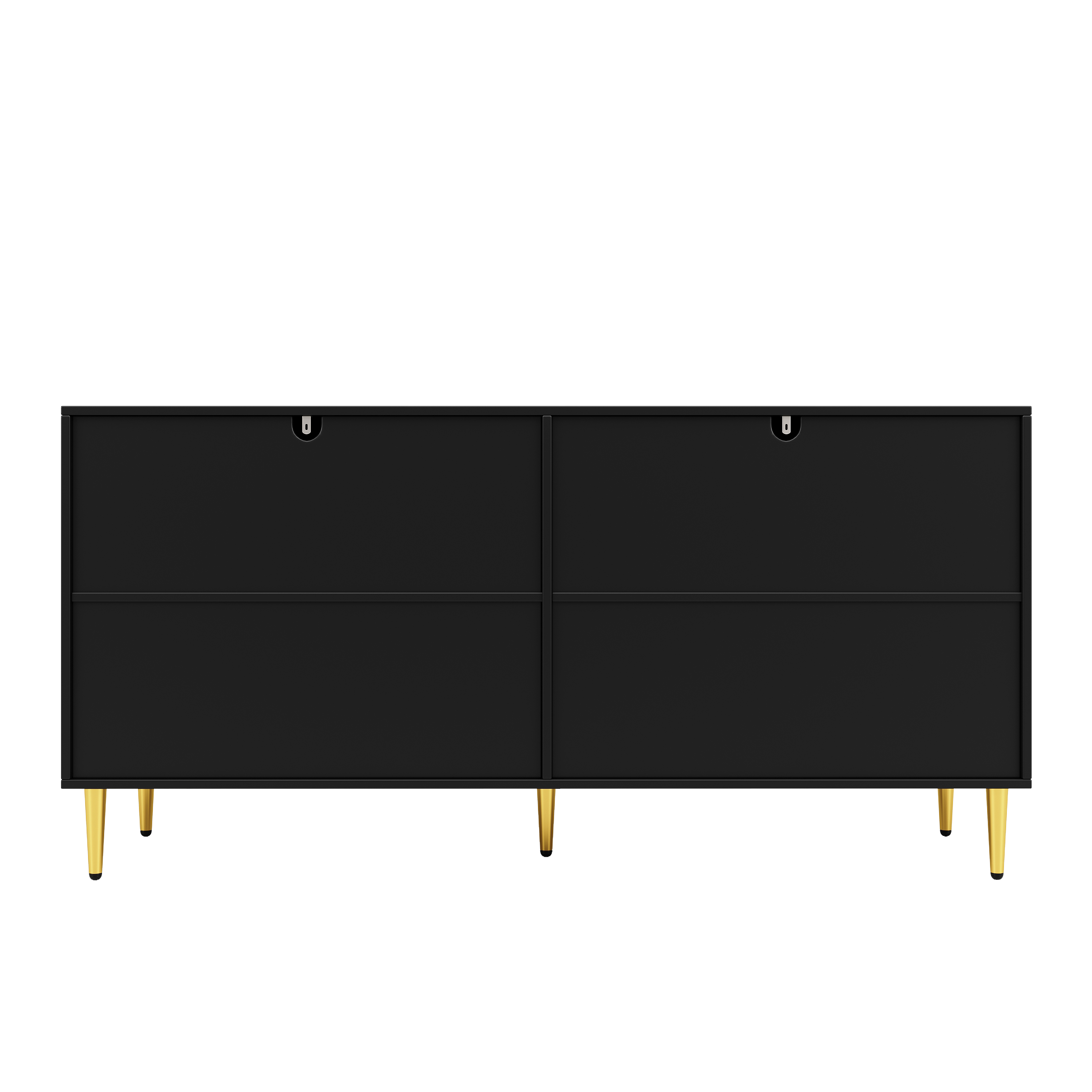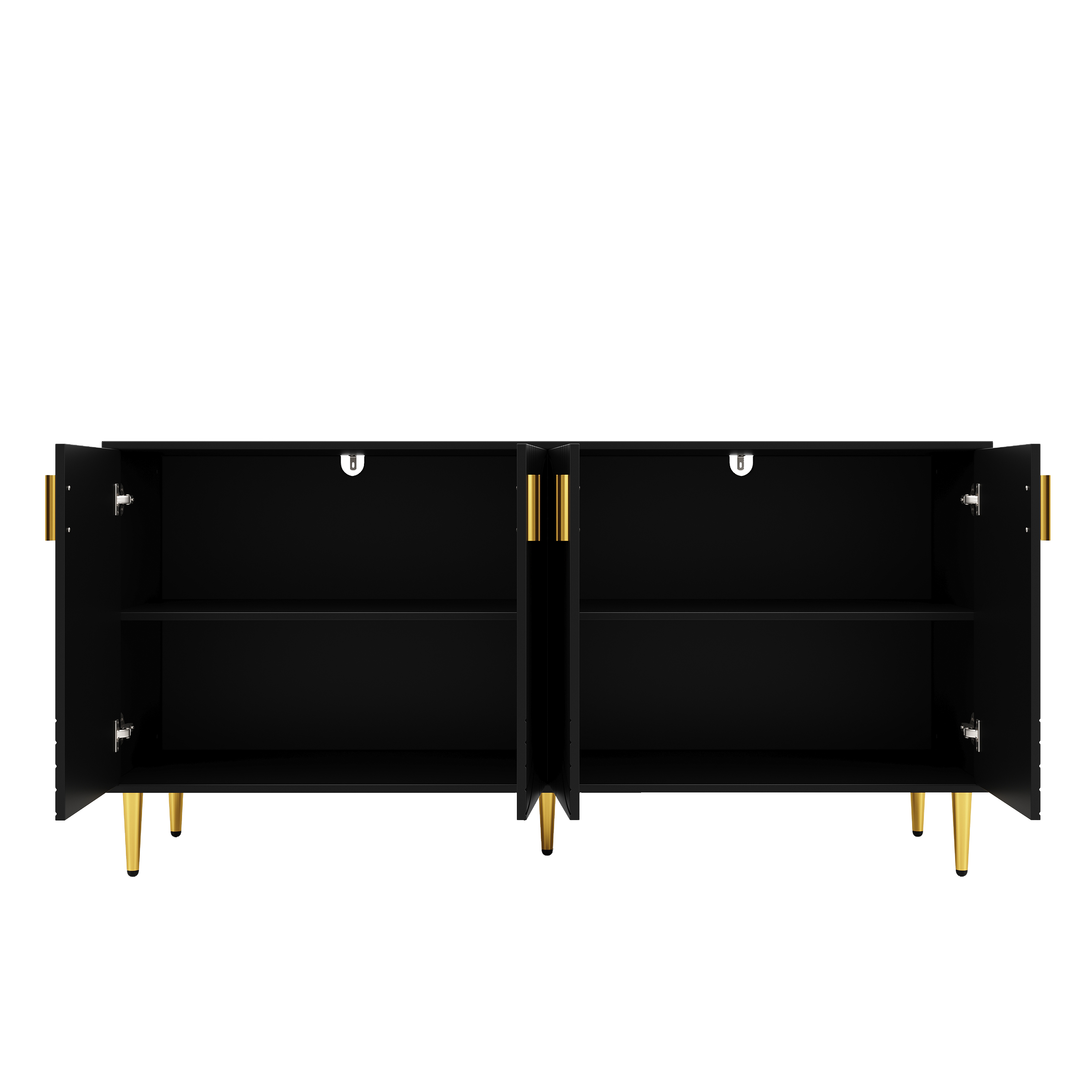 Product Name:Black sideboard (152 x 40 x 75 cm) with unique wave design and golden handles and feet, creating an elegant dining area