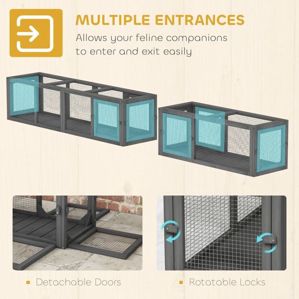 Features: - Flexible design allows various shapes for endless fun - Easily combines with windows, houses, or cages for versatility - Features eight doors for entry, enhancing exploration - Removable door knobs adapt to your cat's play preference - Robust construction and material ensure long-term use - Suitable for cats under 10 lbs. for safe play - Assembly required Specification: - Color: Dark Gray - Material: Fir wood and metal wire - Overall dimensions: 98.4" L x 15" W x 15" H - Long section: 59.1" L x 15" W x 15" H - Short section: 39.4" L x 15" W x 15" H - Inside: 57.5" /37.8" L x 13.4" W x 13.4" H (Long/short) - Door: 12.6" W x 12.6" H - Weight capacity: 10 lbs.