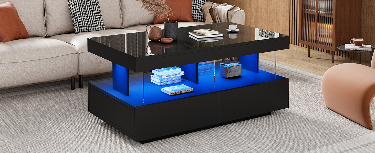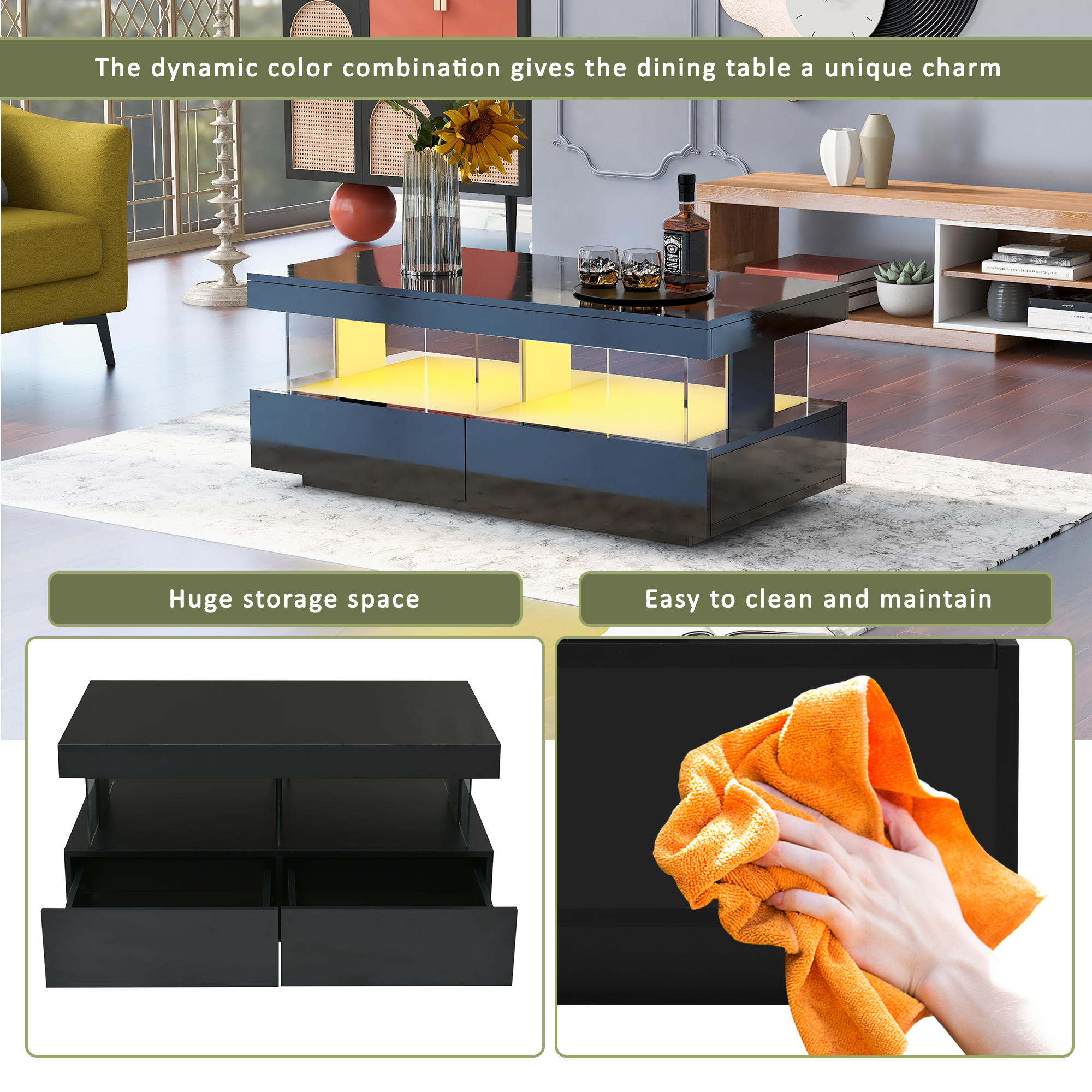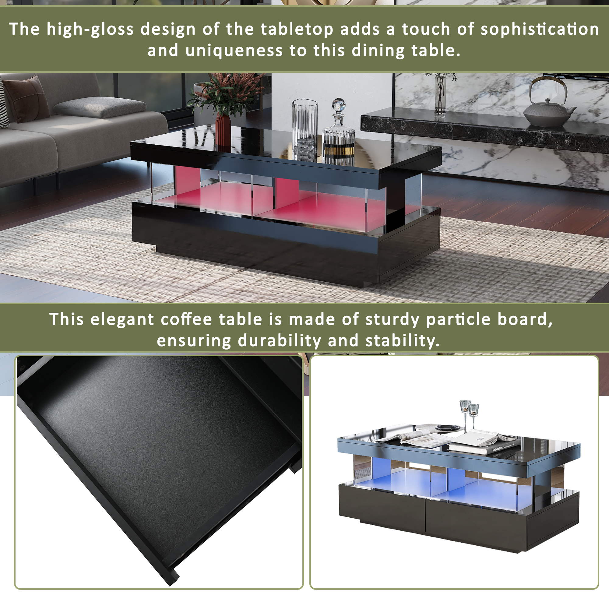 Product Name:Coffee Table for Living Room, High Gloss Tea Table with LED Lights, Centre Table with 2 Drawers and Open Storage Space, End Table for Home Office Furniture, Black
