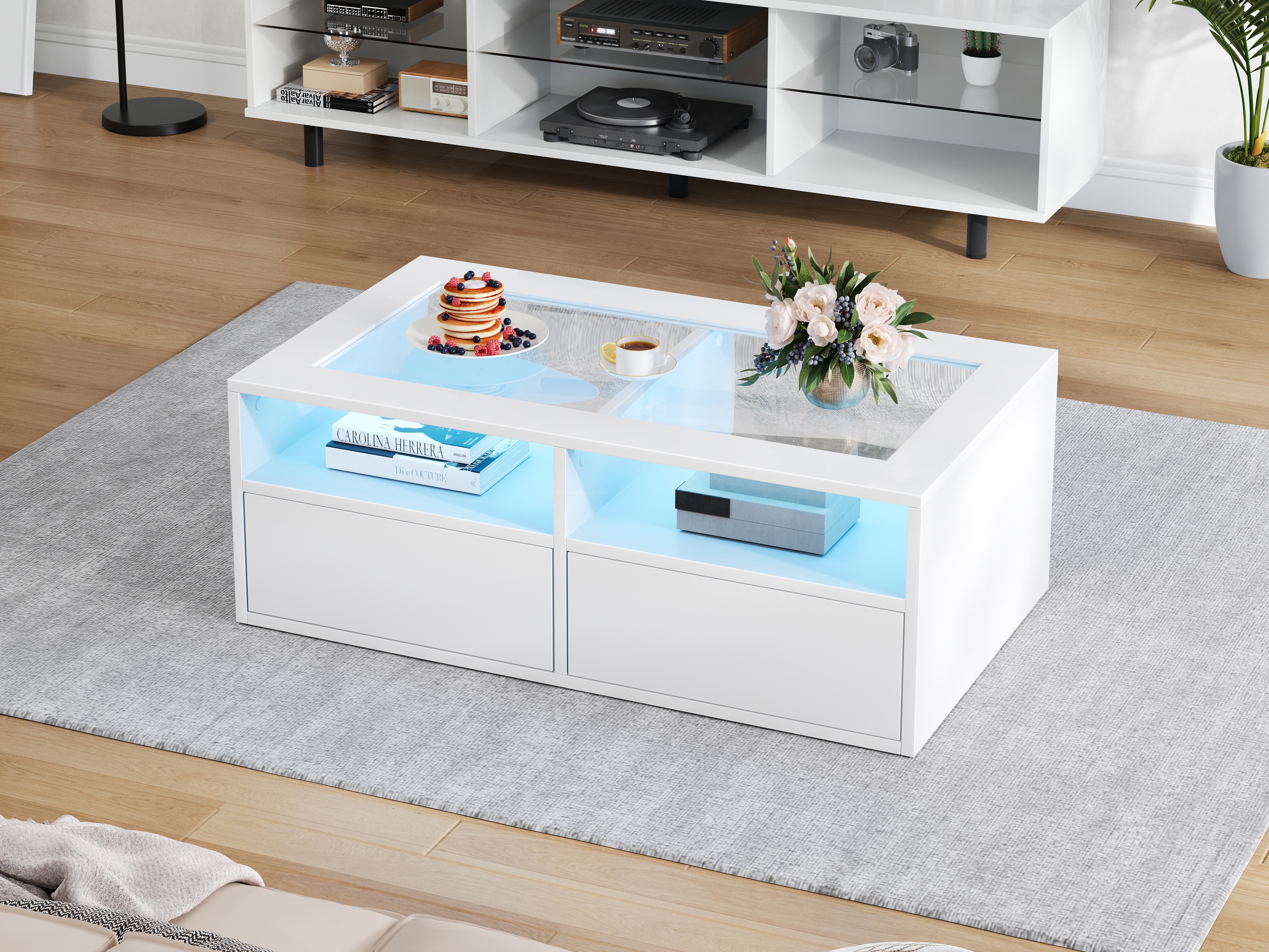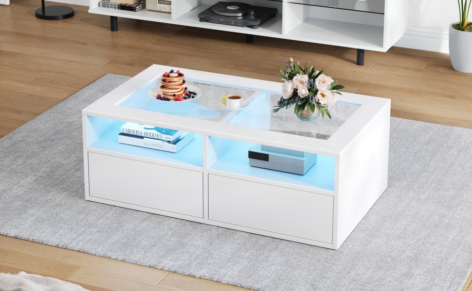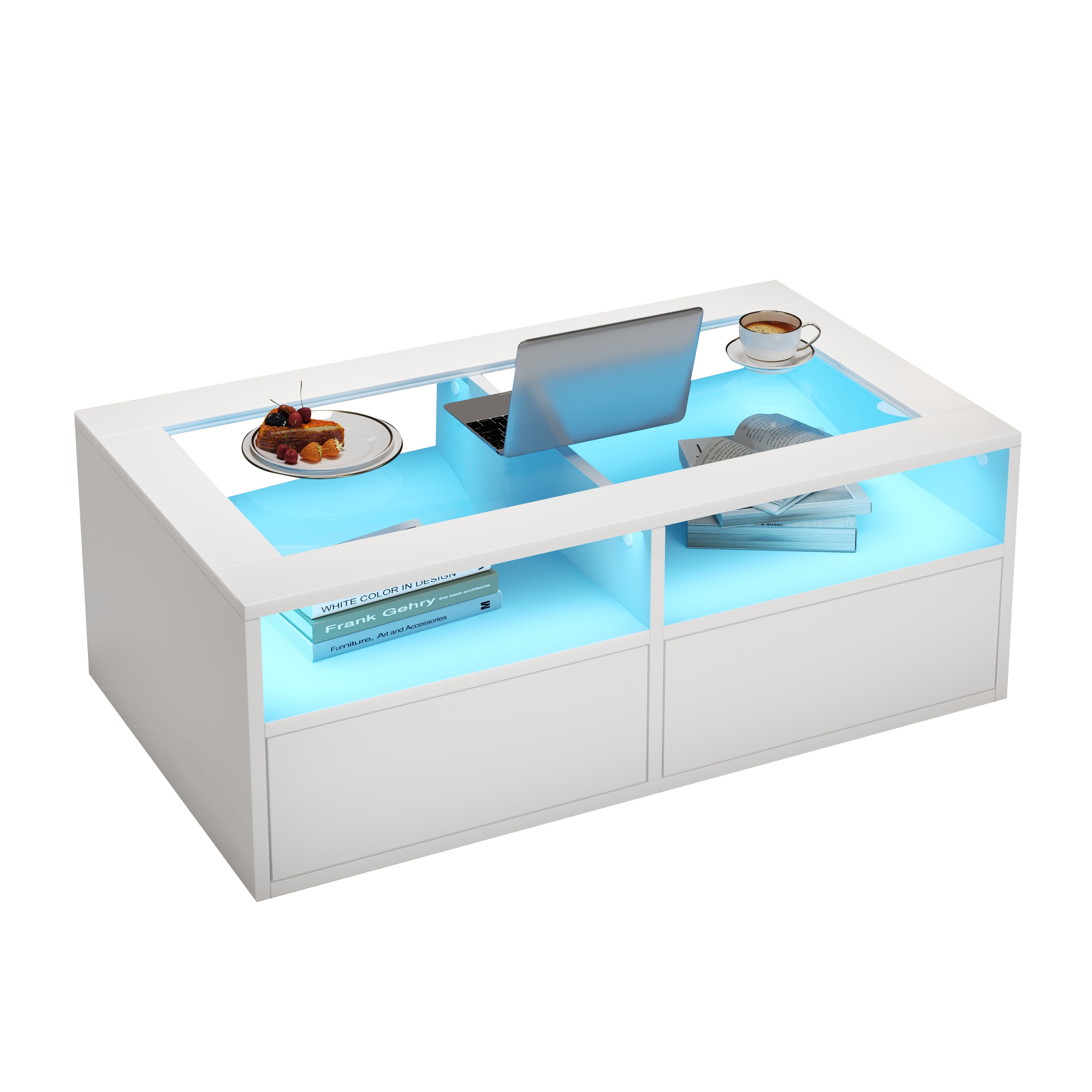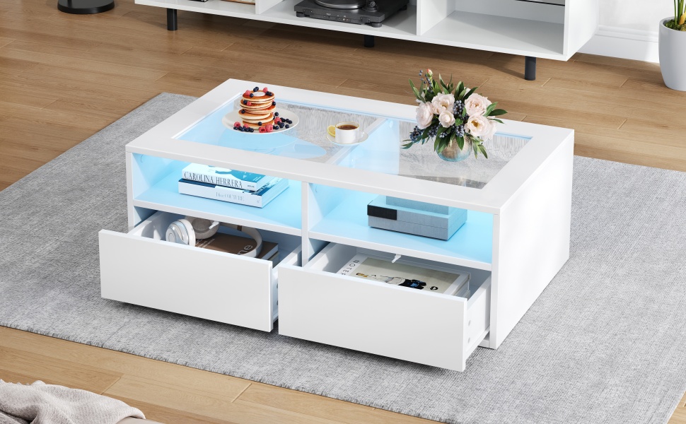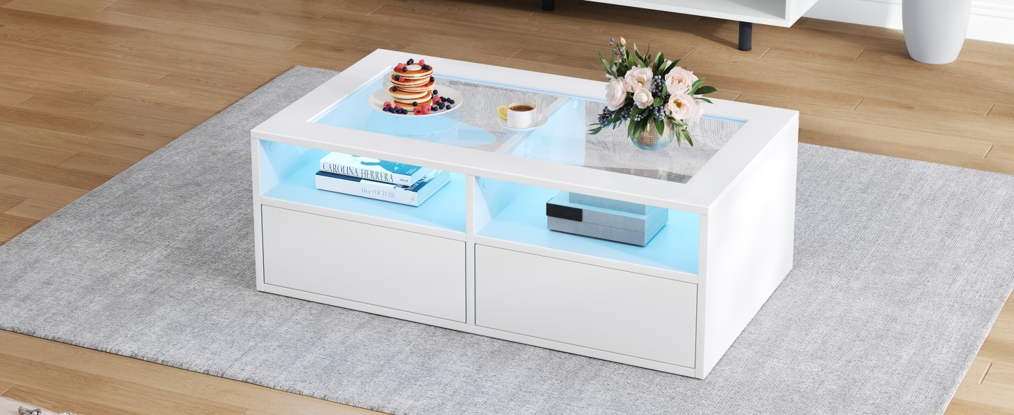 Product Name:Coffee Table with 2 drawers, Open Storage, LED lights, Centre Table with glass tabletop, Sofa Side Table , Tea Table for Living Room, Office, 100*50*35cm, White