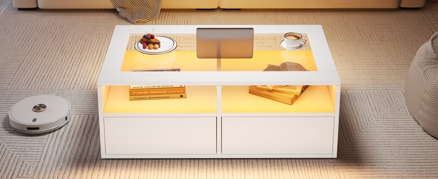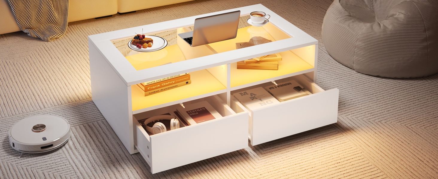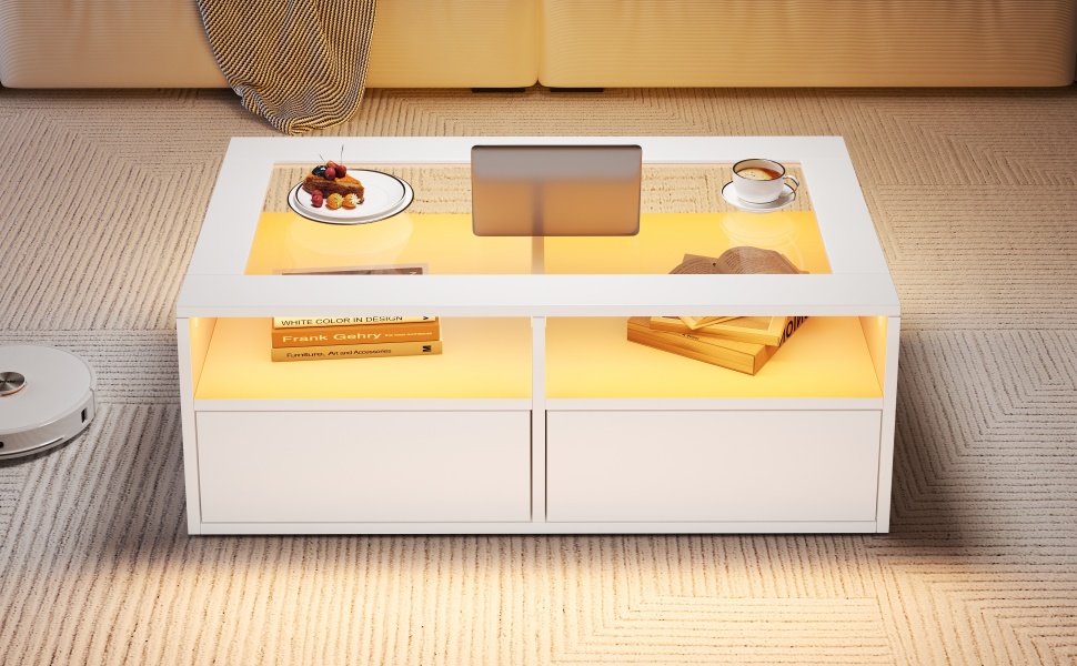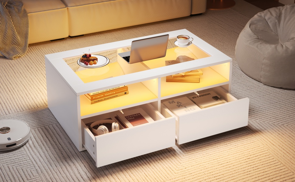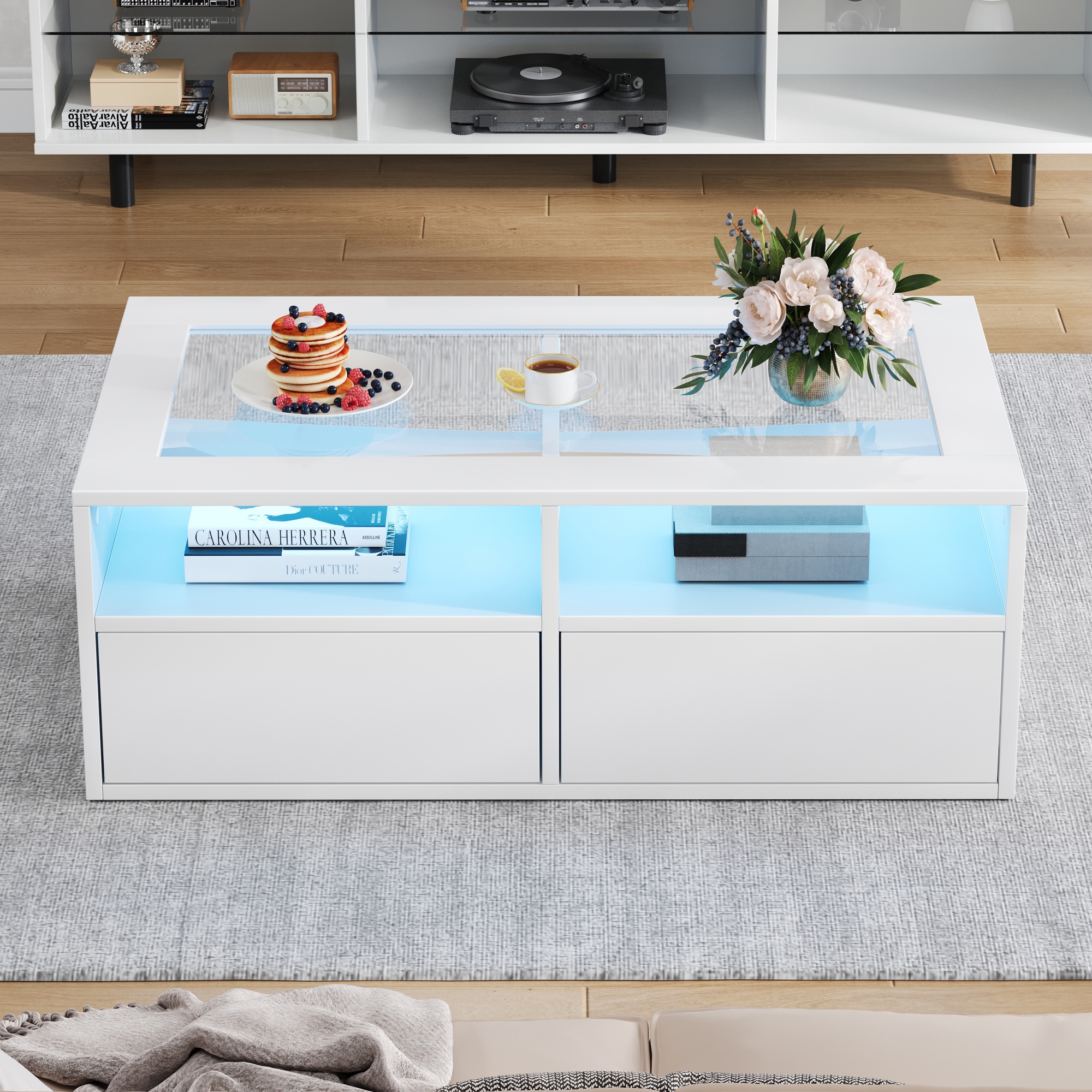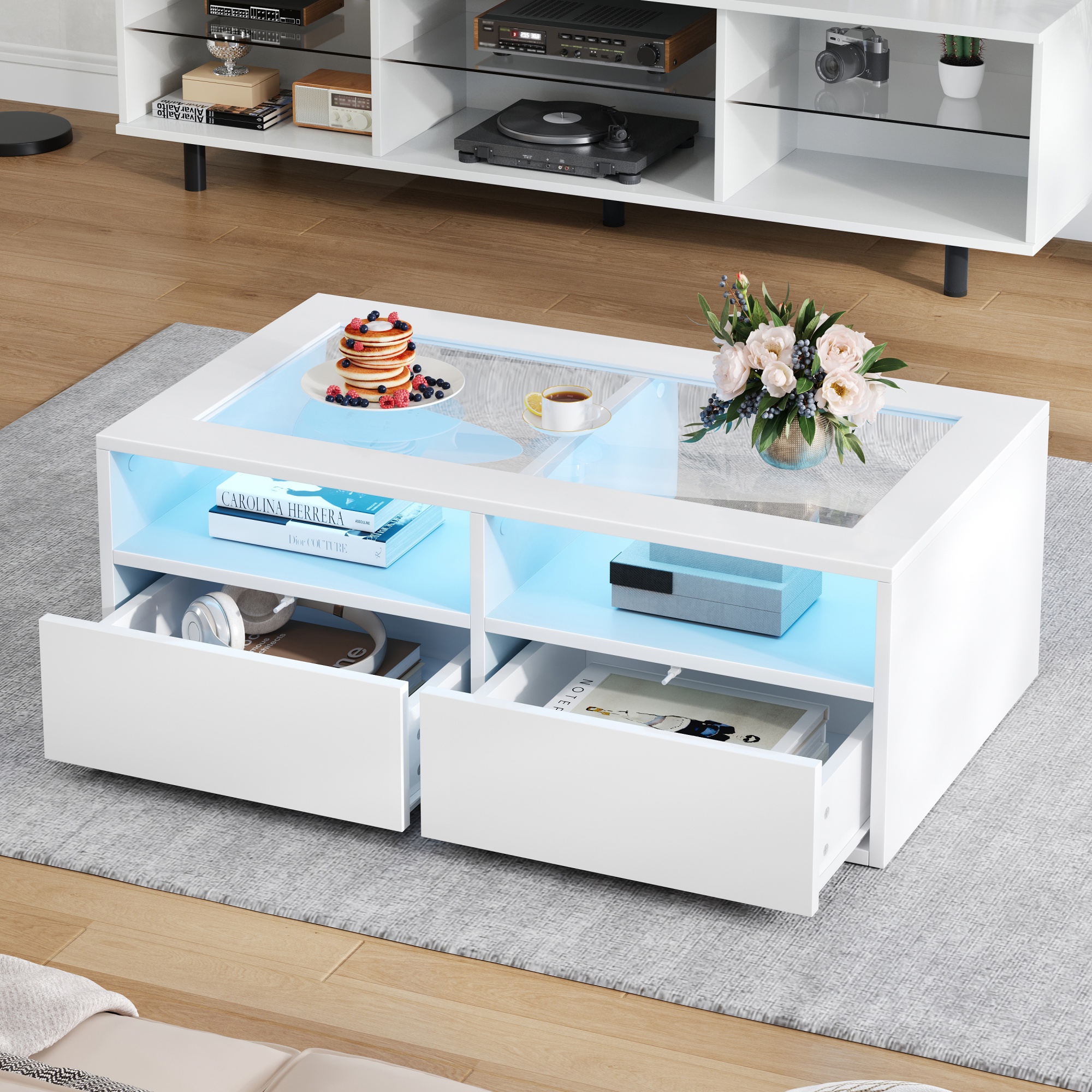 Product Name:Coffee Table with 2 drawers, Open Storage, LED lights, Centre Table with glass tabletop, Sofa Side Table , Tea Table for Living Room, Office, 100*50*35cm, White