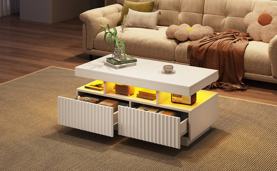 - Functional Integration: This coffee table integrates storage (drawers + open shelves), ambiance creation (LED light strip), and display space (for decorative items and books), meeting the diverse needs of the living room. It is a powerful assistant in enhancing the quality of life.