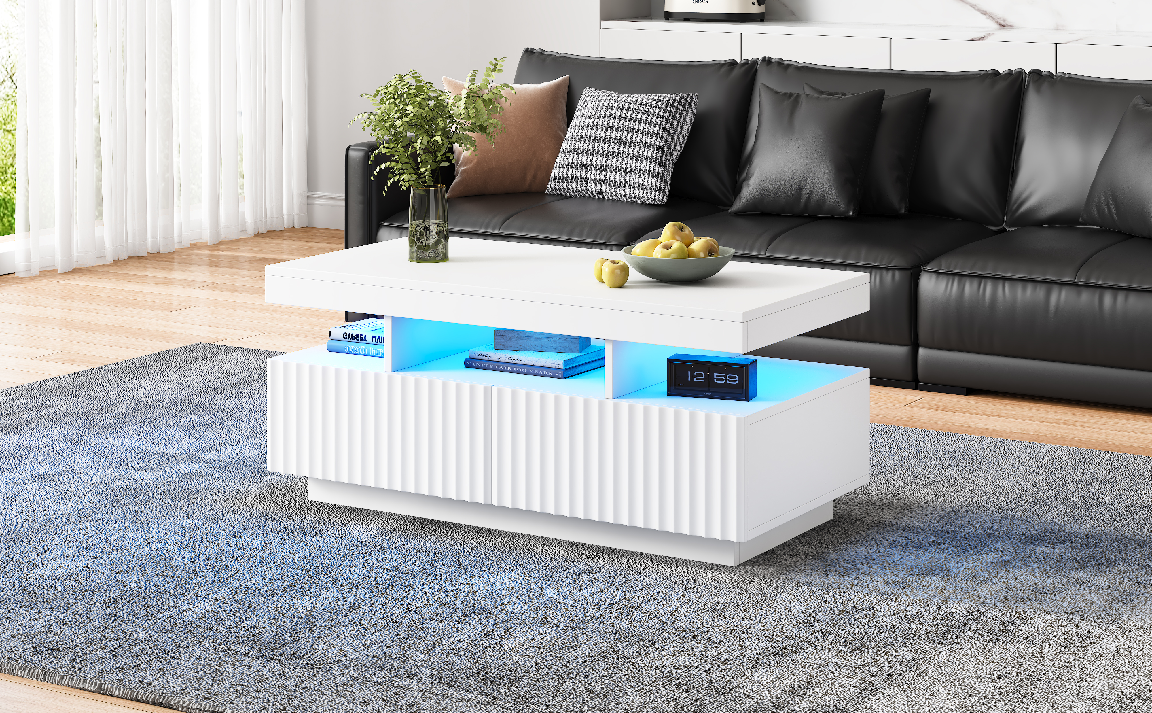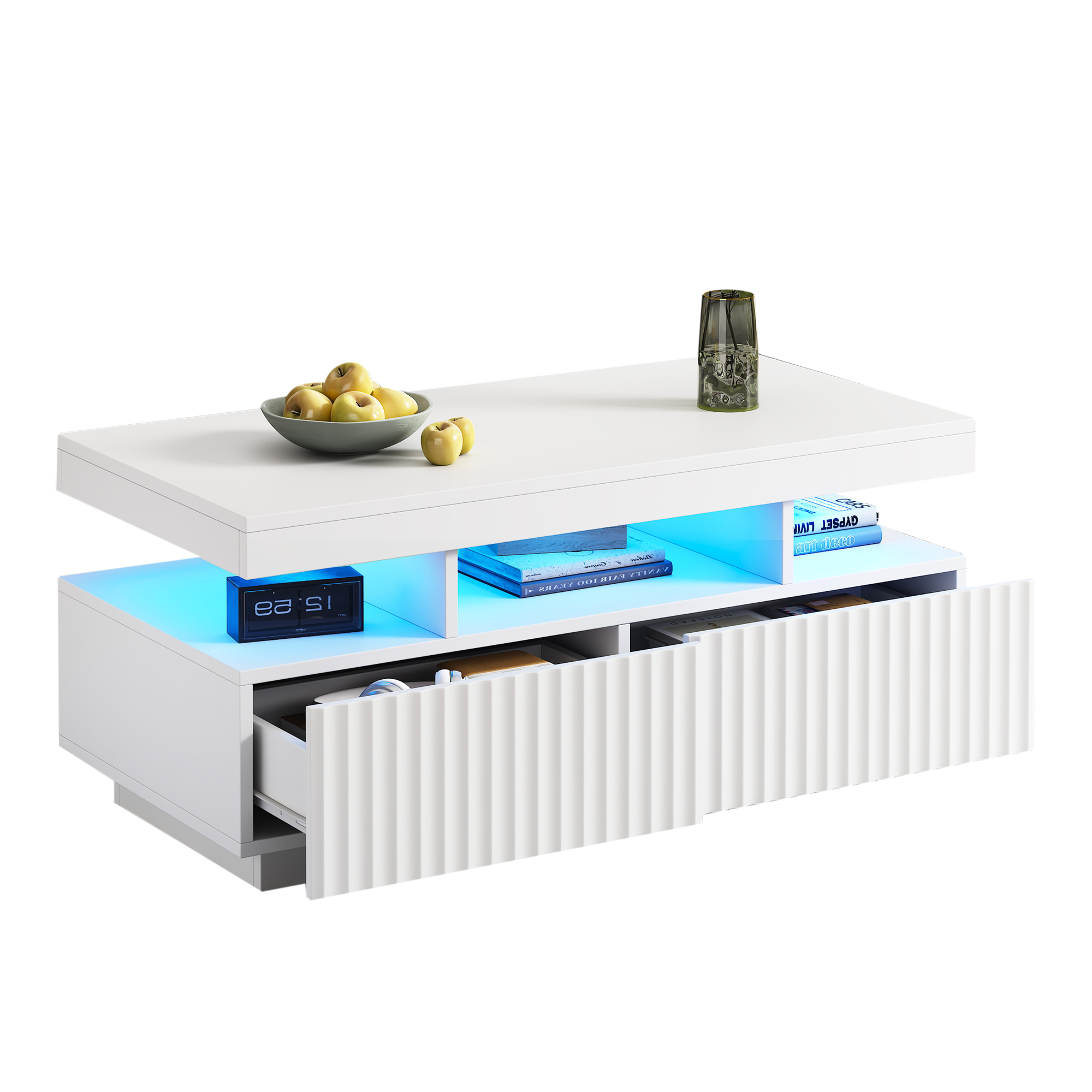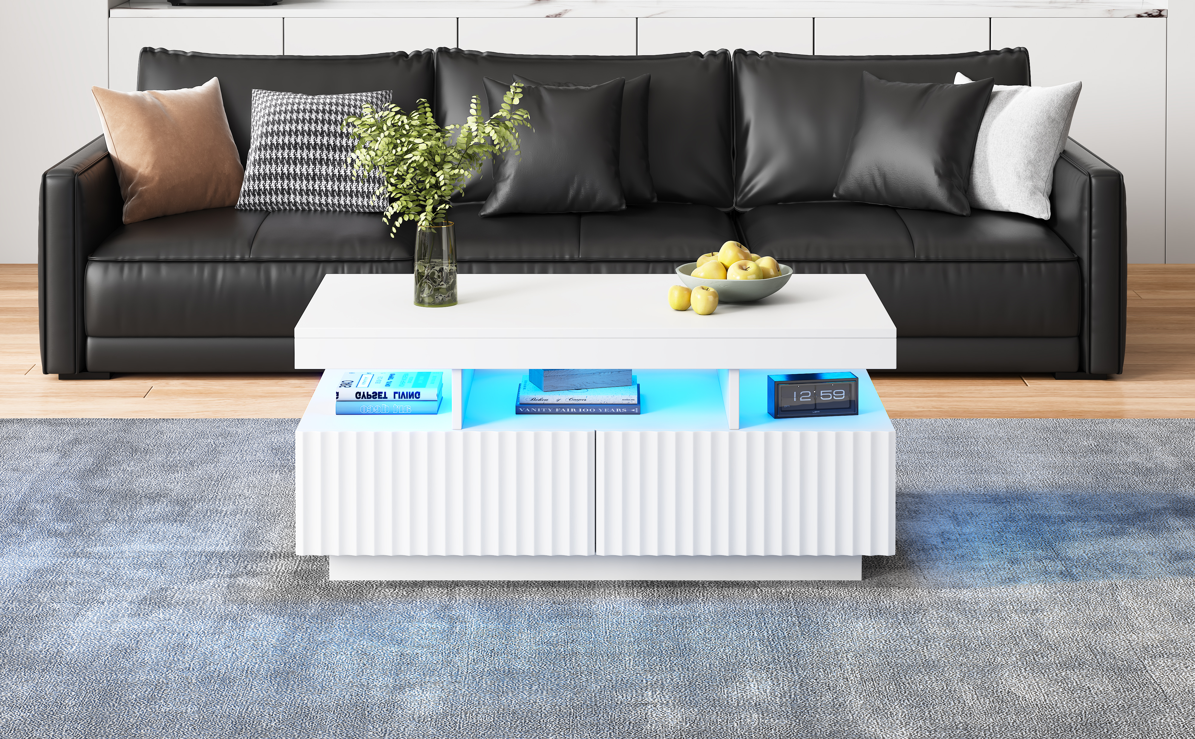 Product Name:Coffee Table with LED lights, 2drawers, Ribbed Decorative Centre Table, Sofa Side Table, Rectangle Coffee End Table for Living Room, Office, 100*50*45cm, white, Particleboard