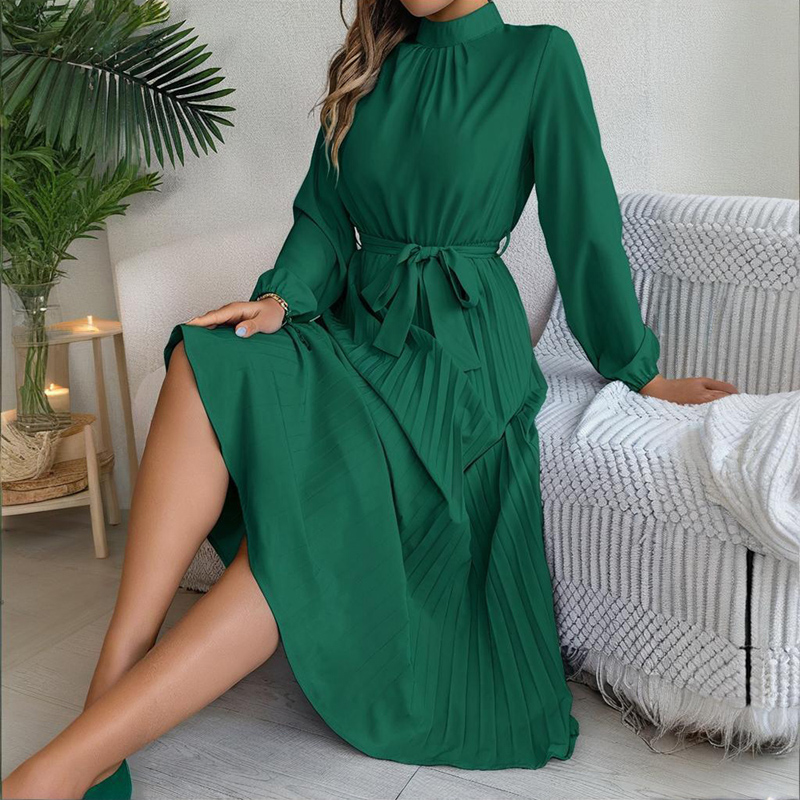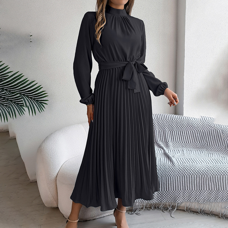 Elegant High Neck Long Sleeve Pleated Maxi Dress - Solid Color Flowy Dress for Women, Casual to Formal Wear
