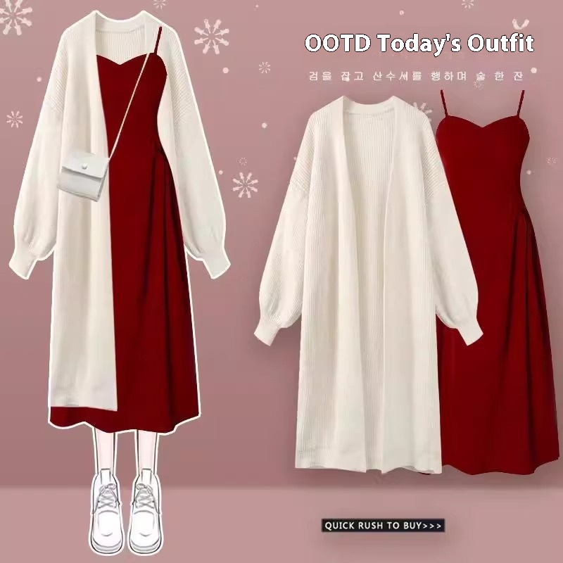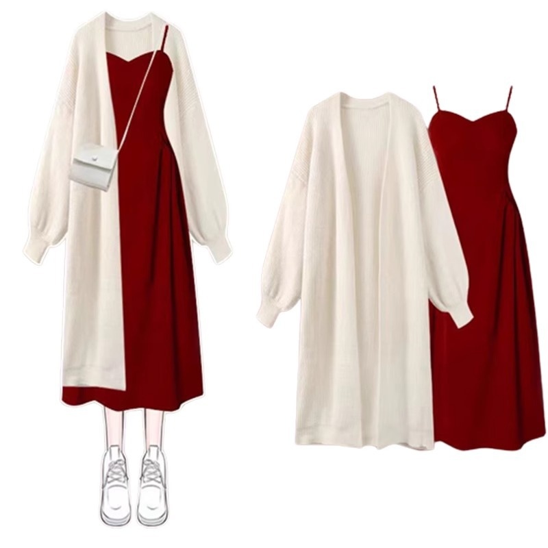 Color: apricot cardigan, red suspender skirt, apricot cardigan red suspender skirt