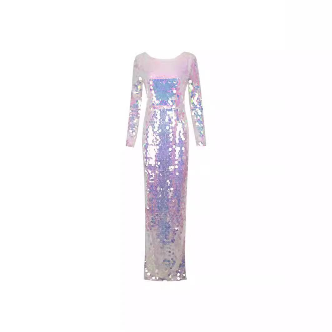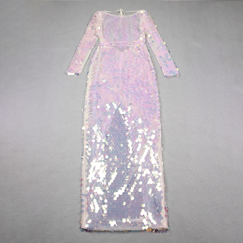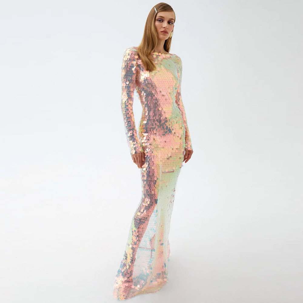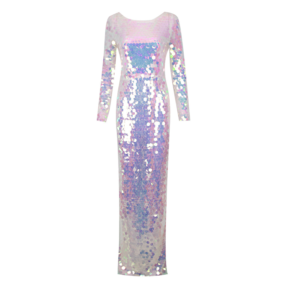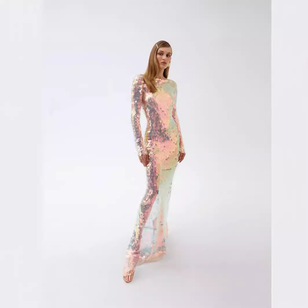 Fashion Elegant Sexy Backless Mesh Sequined Long Sleeve Long