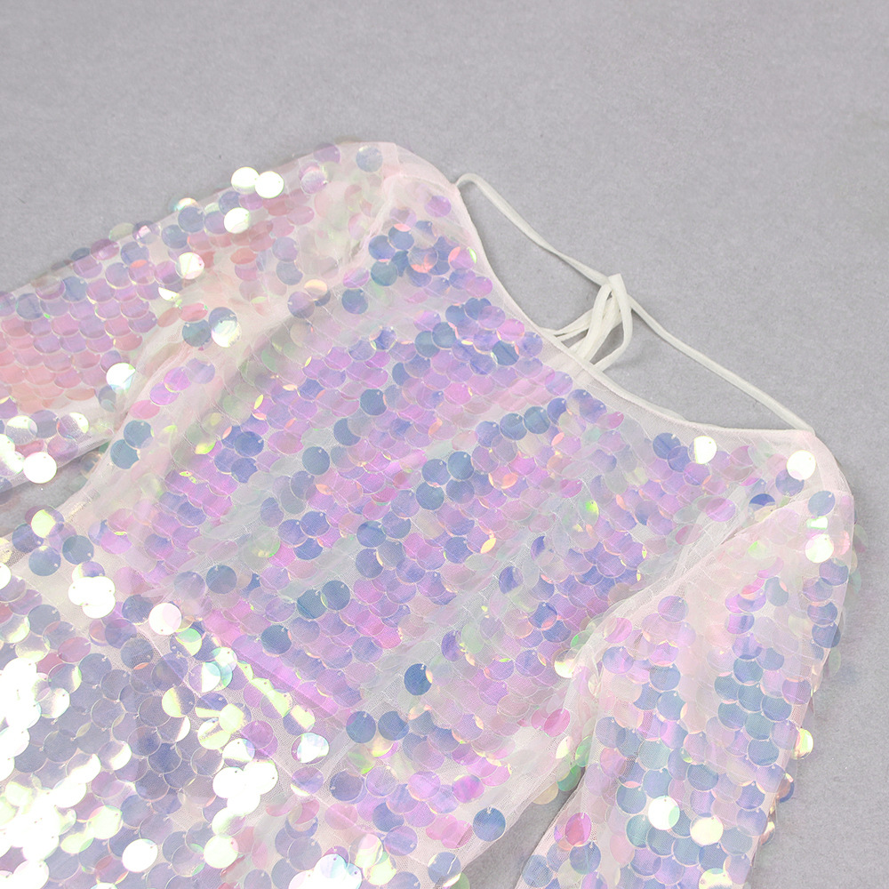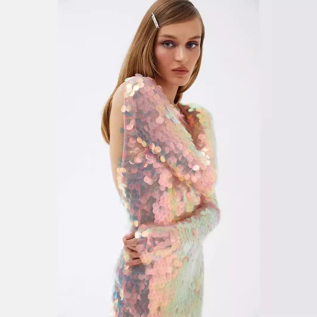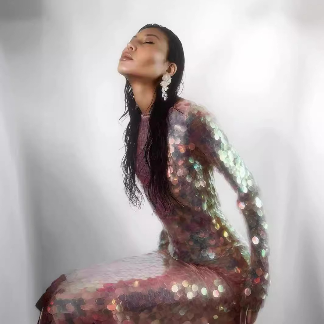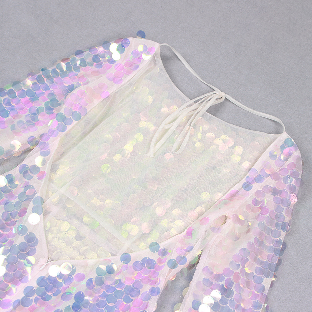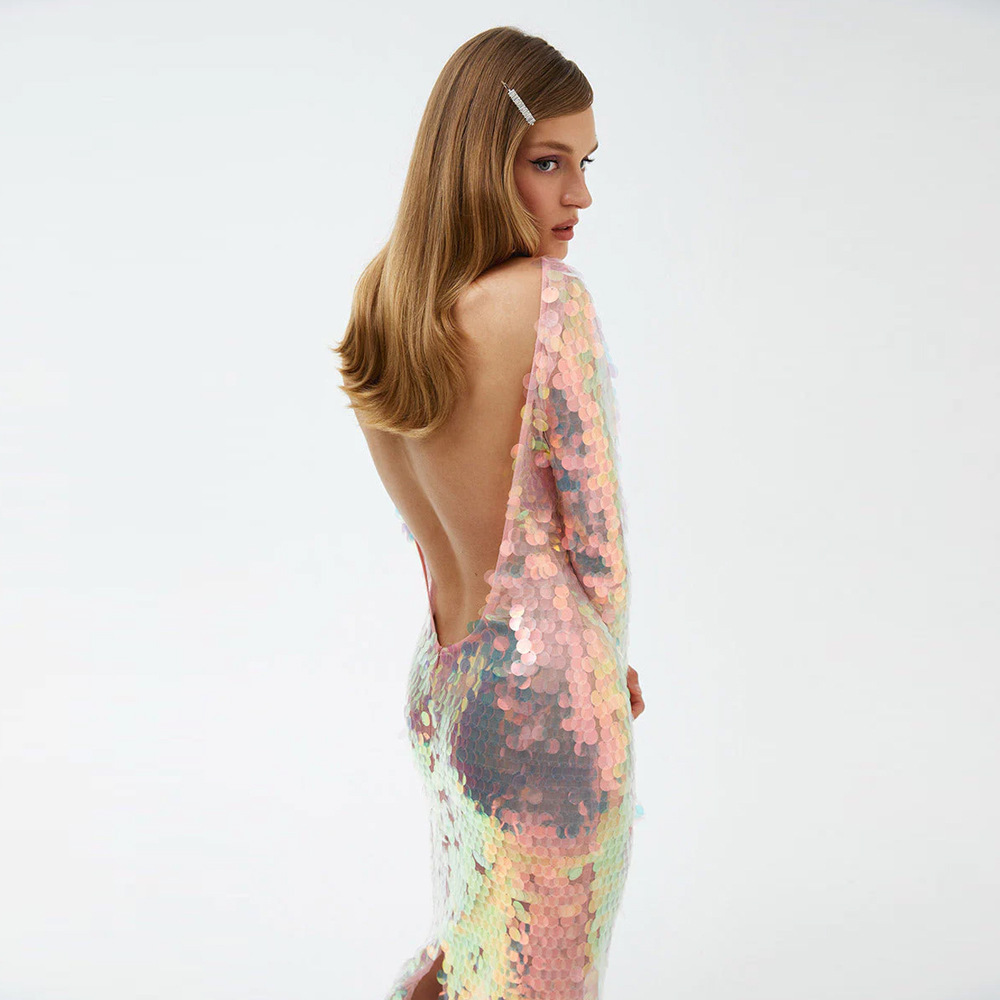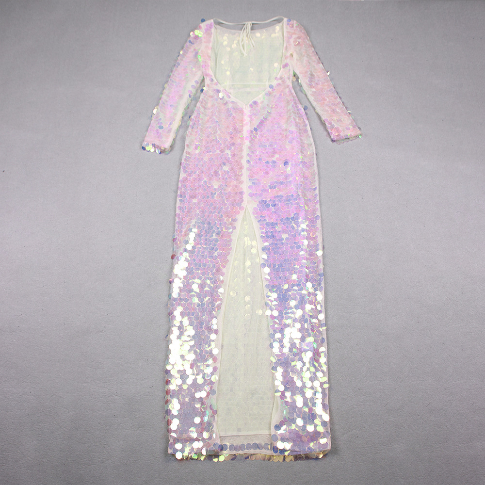Fashion Elegant Sexy Backless Mesh Sequined Long Sleeve Long