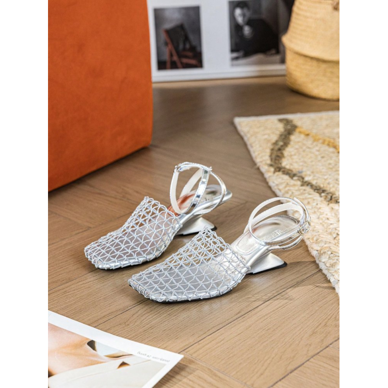Material: Premium metallic synthetic leather upper with a delicate woven fishnet hollow design, soft fabric lining, and a durable rubber outsole for traction.
