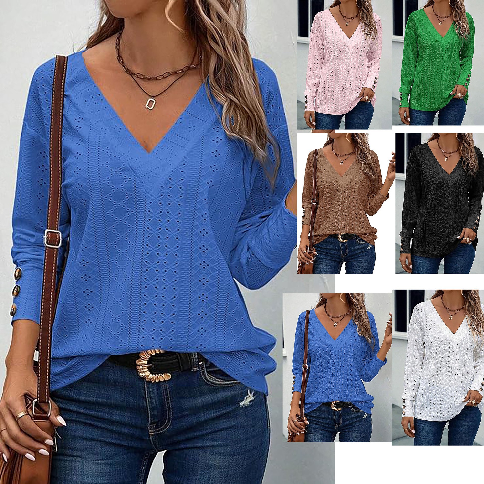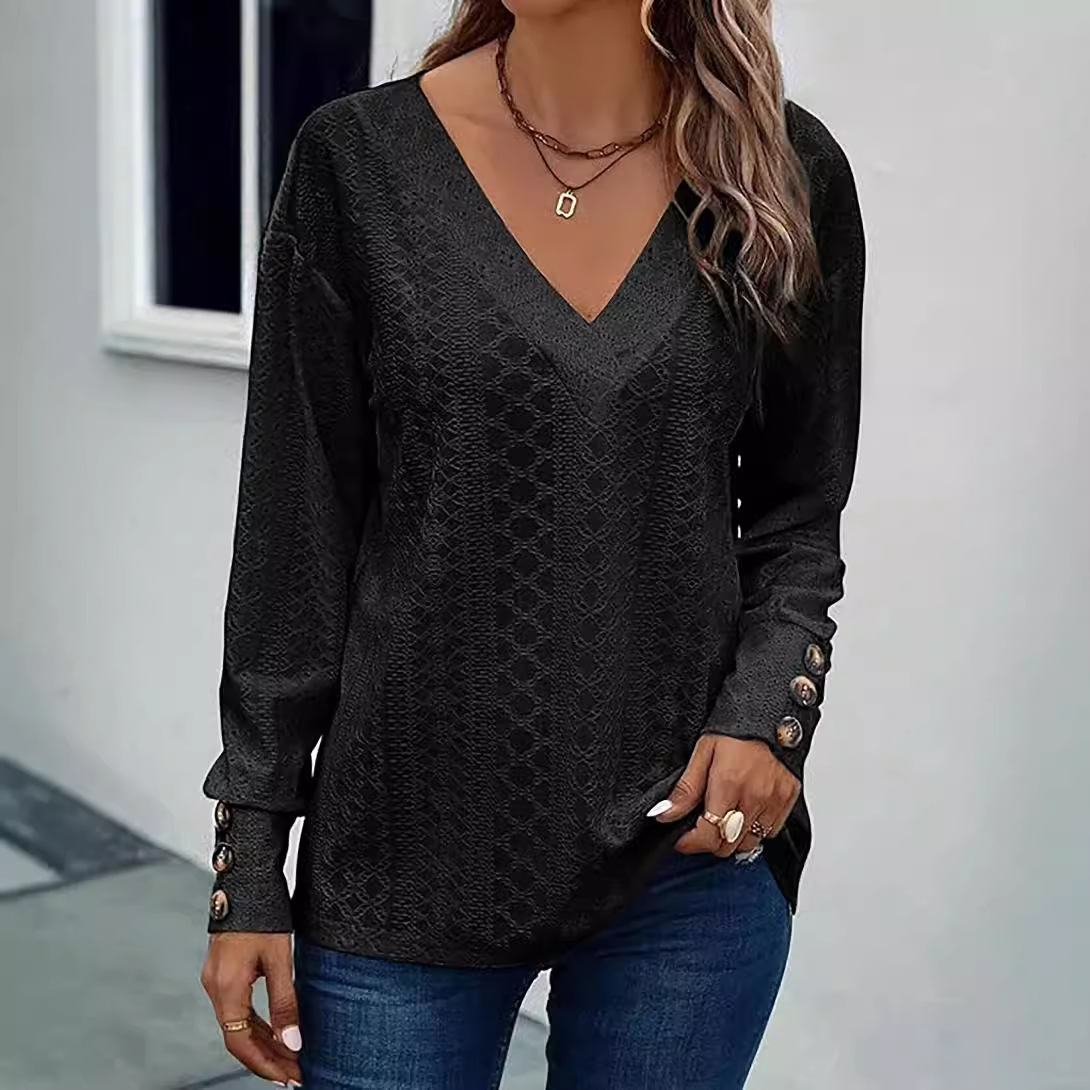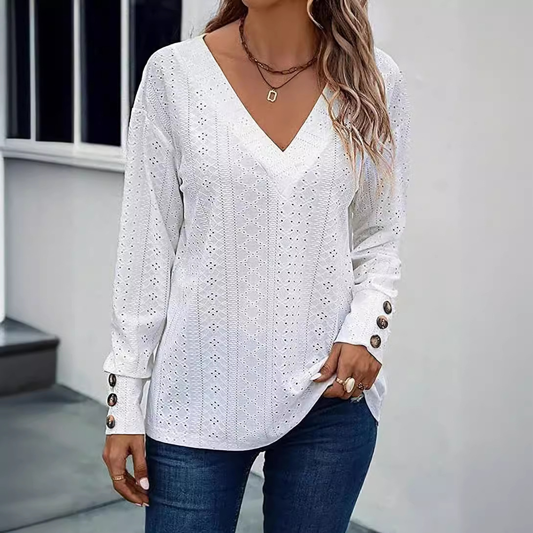 Hollowed-out V-neck Drop-shoulder Long-sleeve Button T-shirt