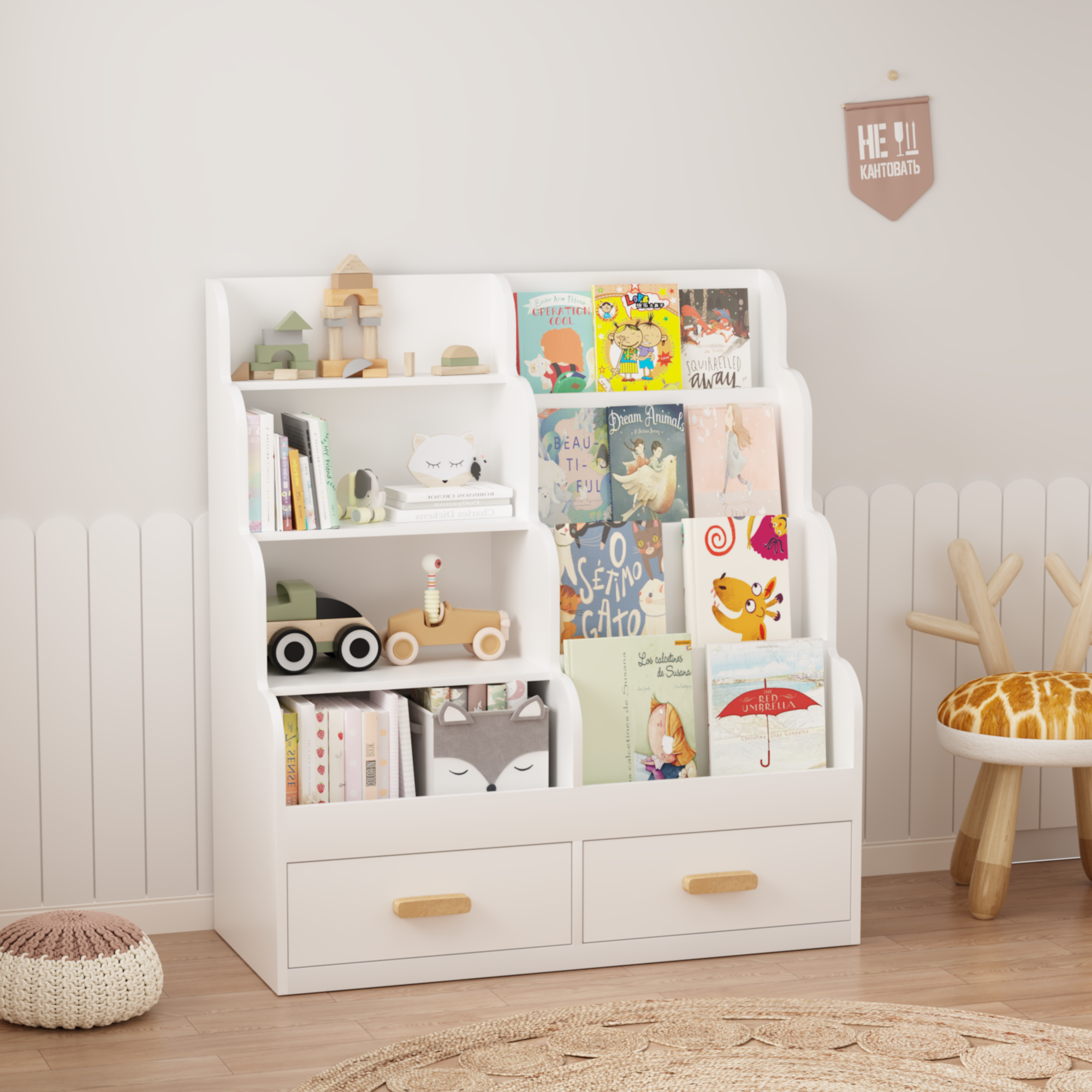Product Name:Kids Bookshelf with 2 Storage Drawers, Front-Facing Children's Bookcase and Toy Organizer, Multi-Tier Reading Shelf for Toddlers, Playroom, Bedroom, or Nursery - White