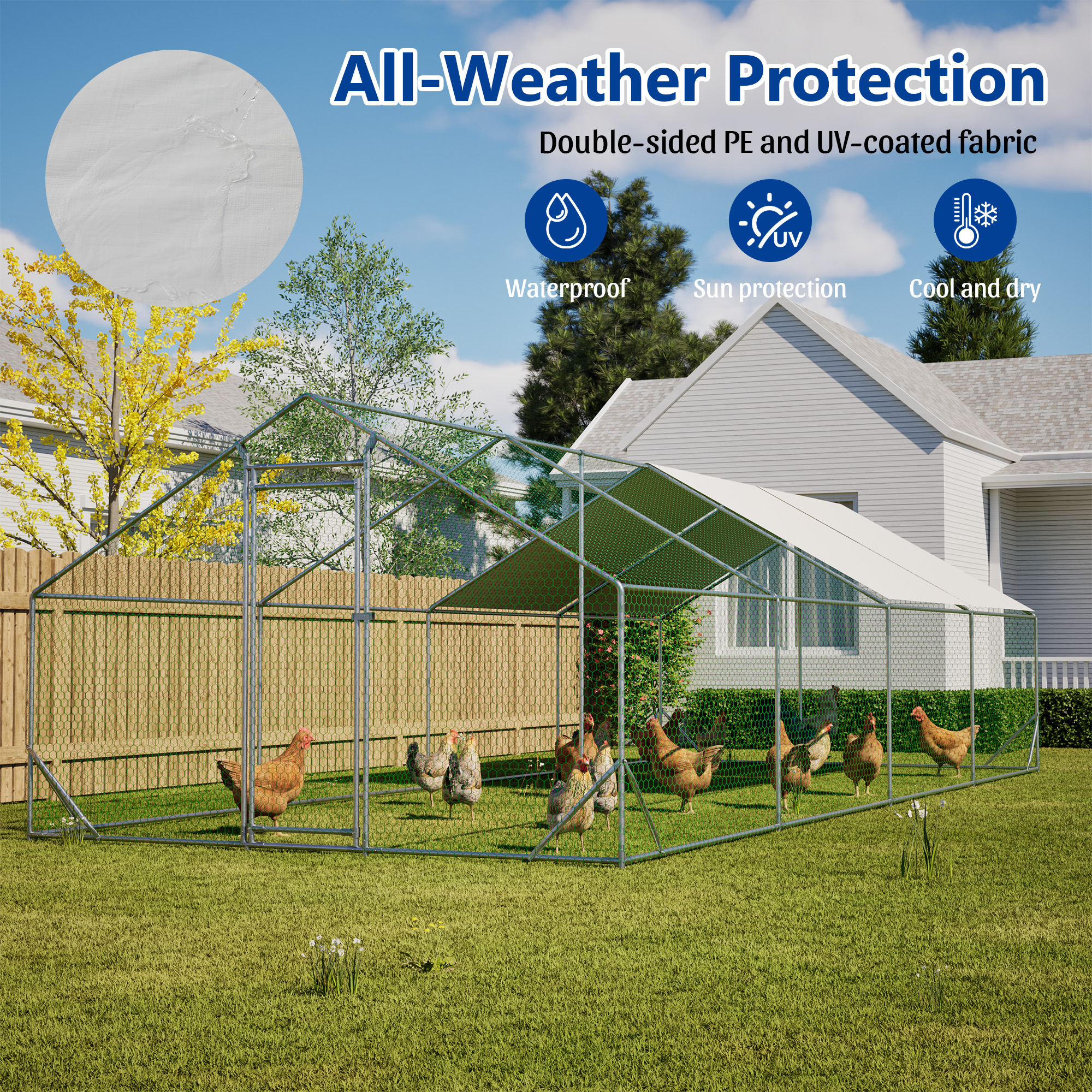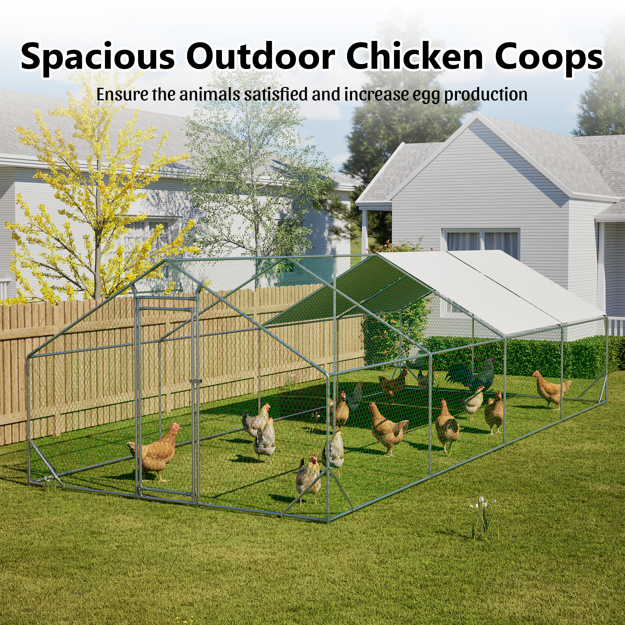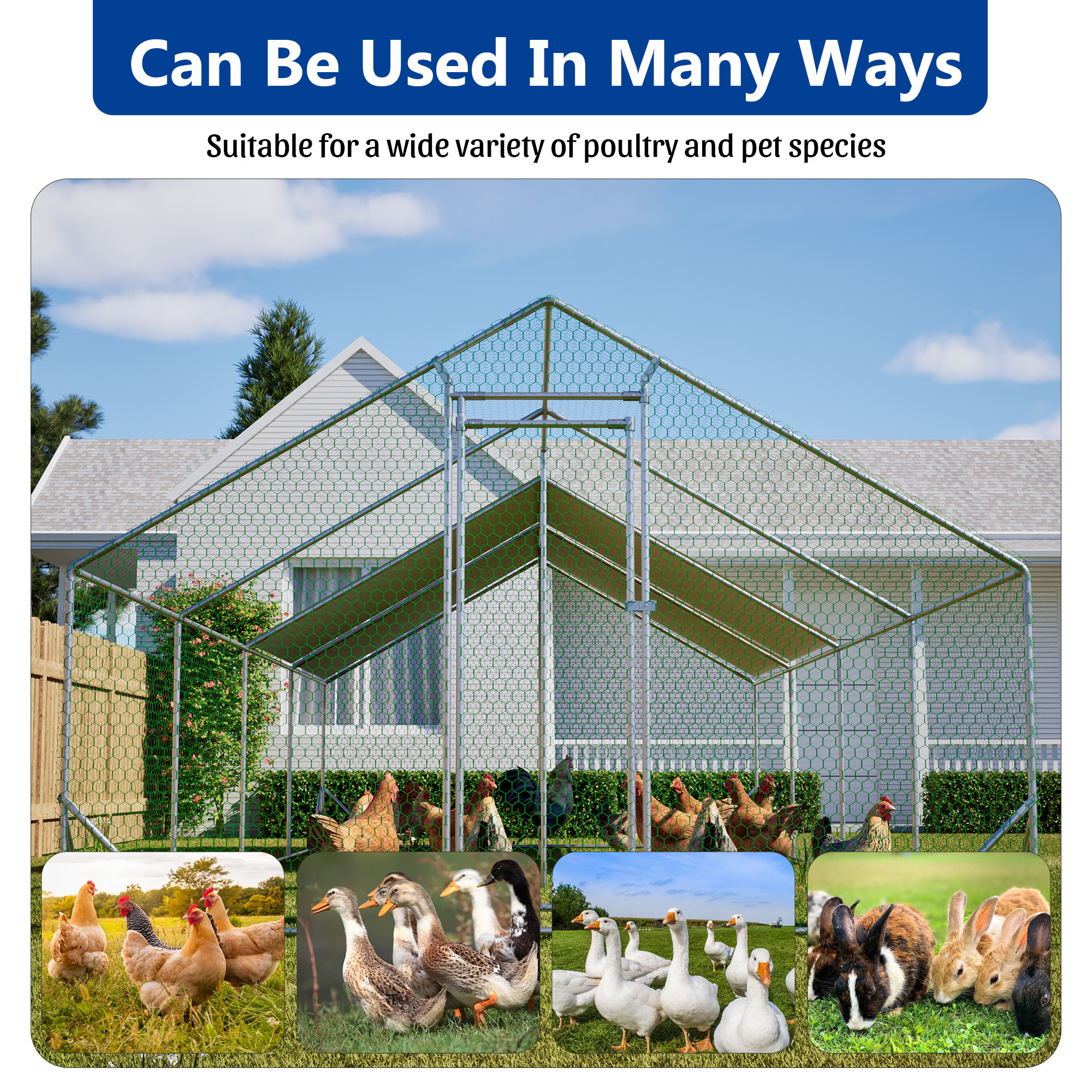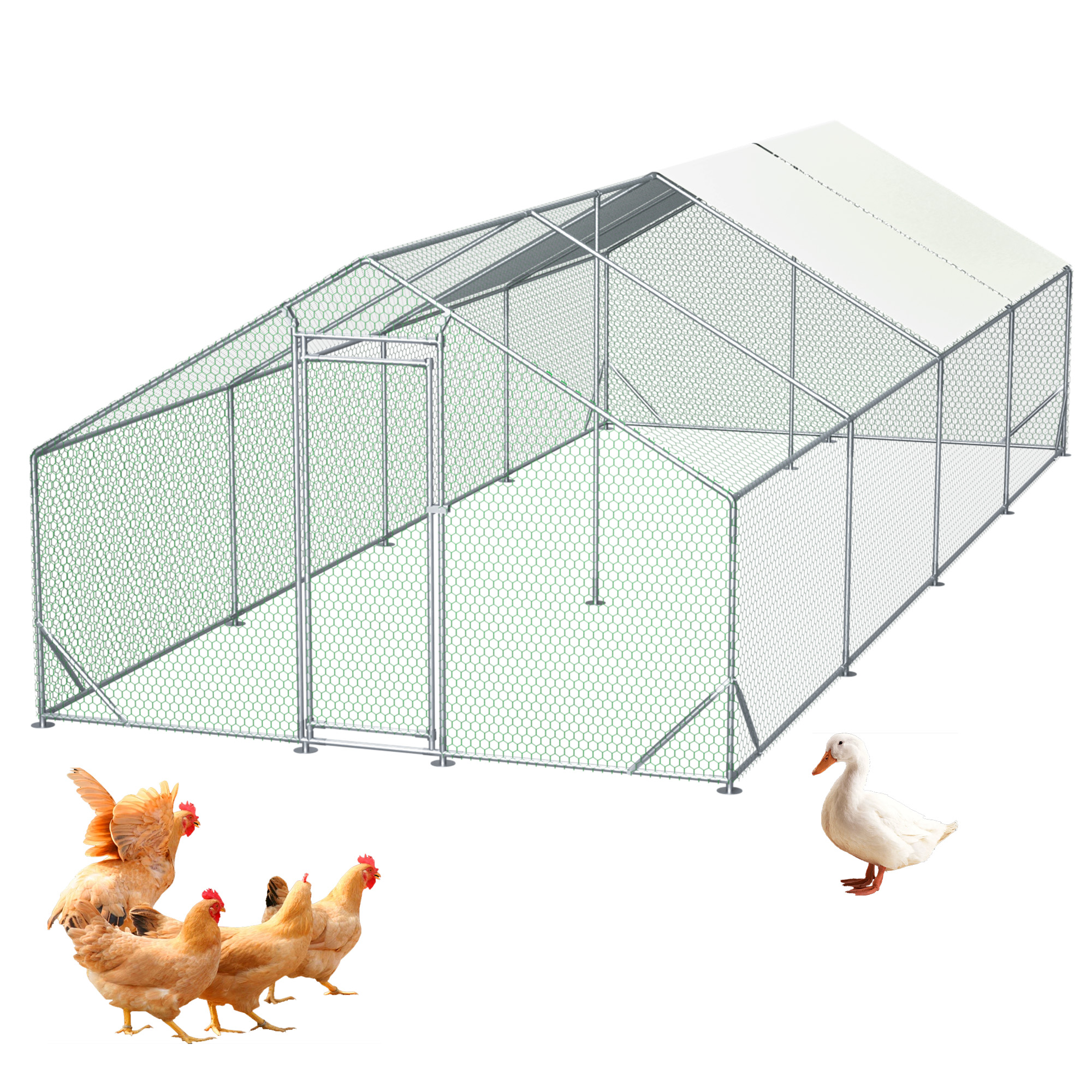 Our chicken run manufactured with high quality steel frame, including ground nails, so that the fence can better fixed to the ground.solid enough to keep the poultry from escaping and secure from predators. And this hen run house is also stably stationed to withstand the wind and snow weather. Featuring a durable sun and rain-proof tarp on the top, it is protective for the steel frame, wire mesh and animals under its cover. And the tarp is sturdy enough to avoid tear up or fade over time. With hexagonal wire mesh and the small gaps between meshes, you can prevent your chicken from some predators to make them safety. The spring clasp design requires no-welding for your quick assembly with this large metal chicken run. You can easily understand the installation with a complete set of components and simple instructions we offered. Lockable chicken run house suitable for a variety of animals like for chickens, rabbits, ducks and more. This walk-in metal poultry house has a spacious area for the animal to play and rest in the backyard garden and farm settings.
