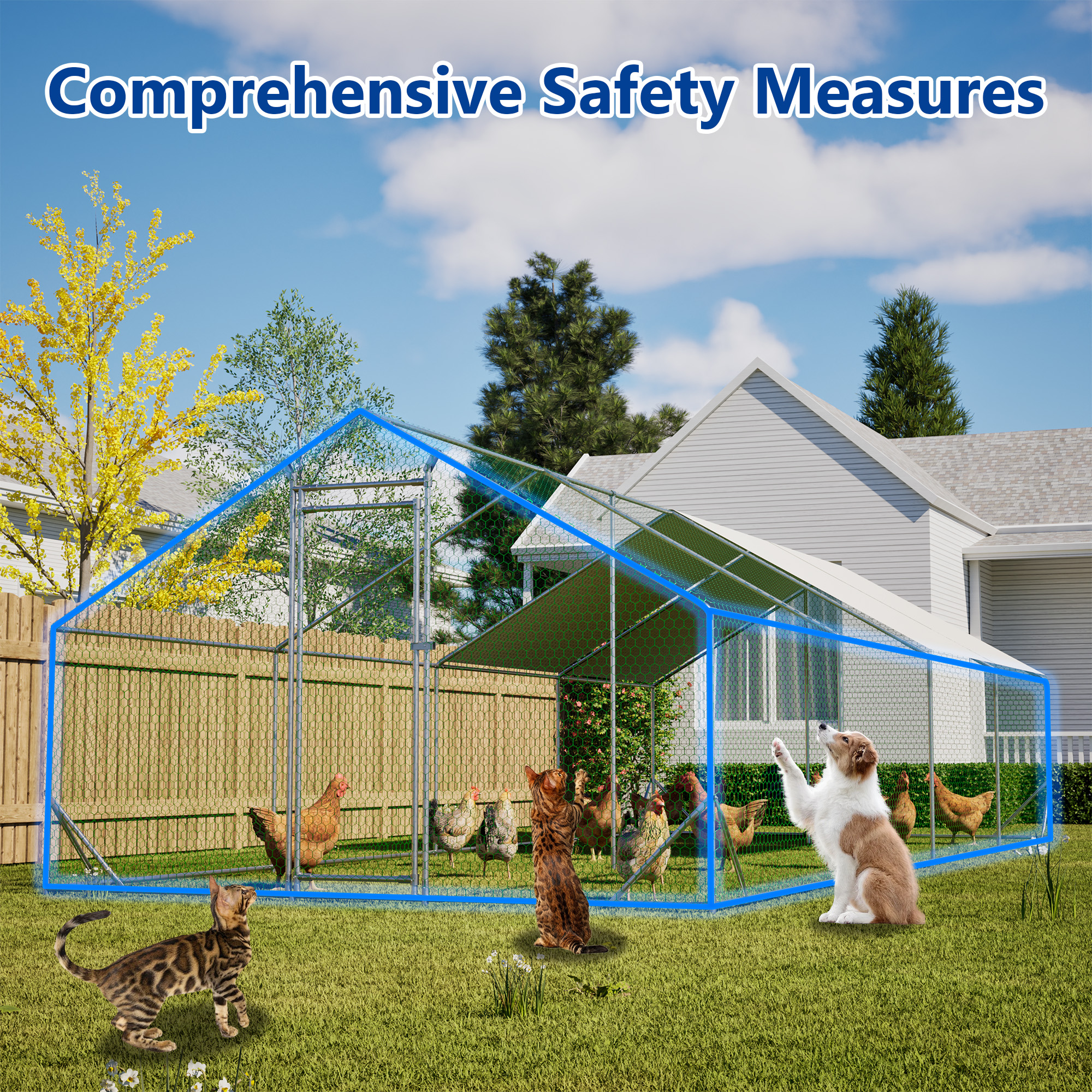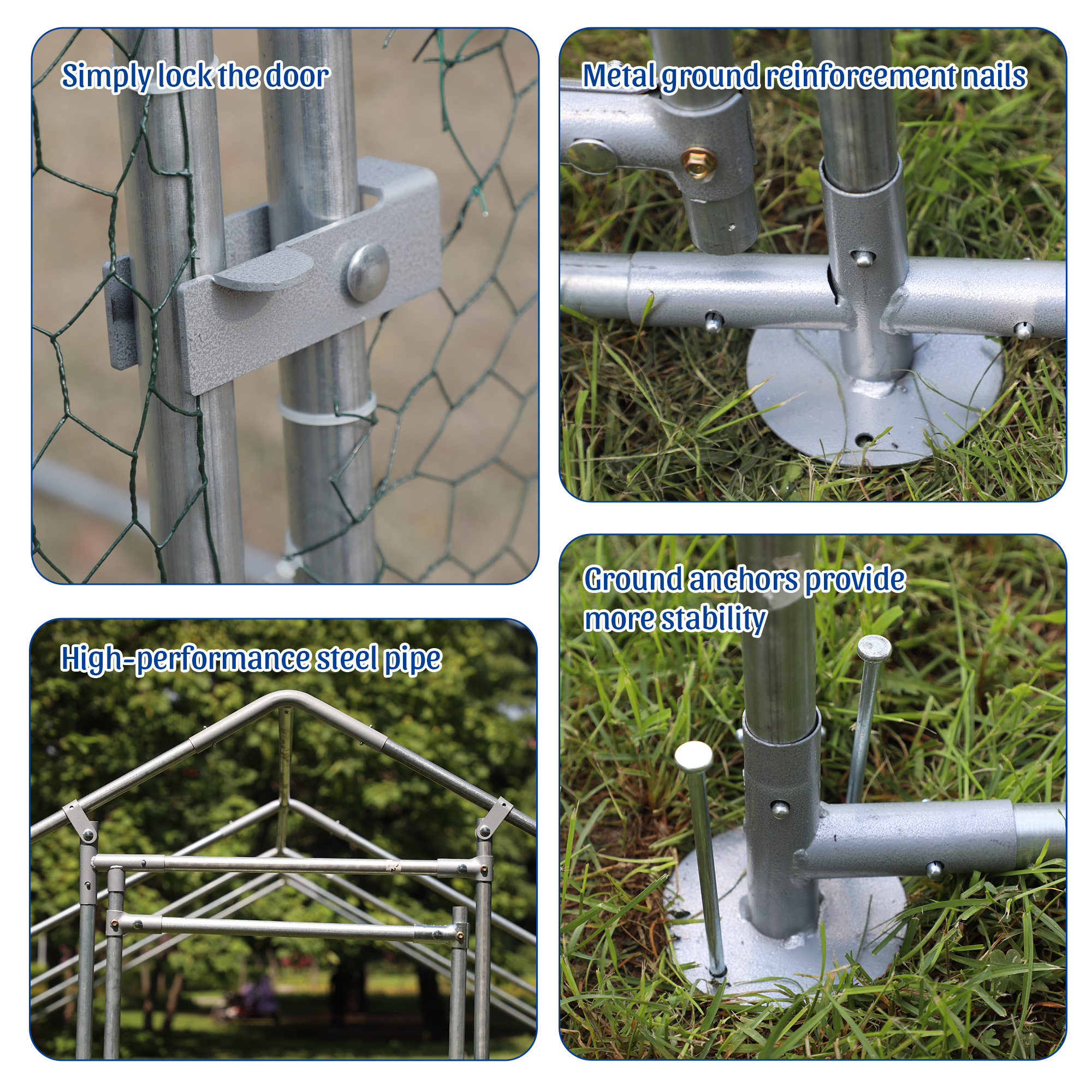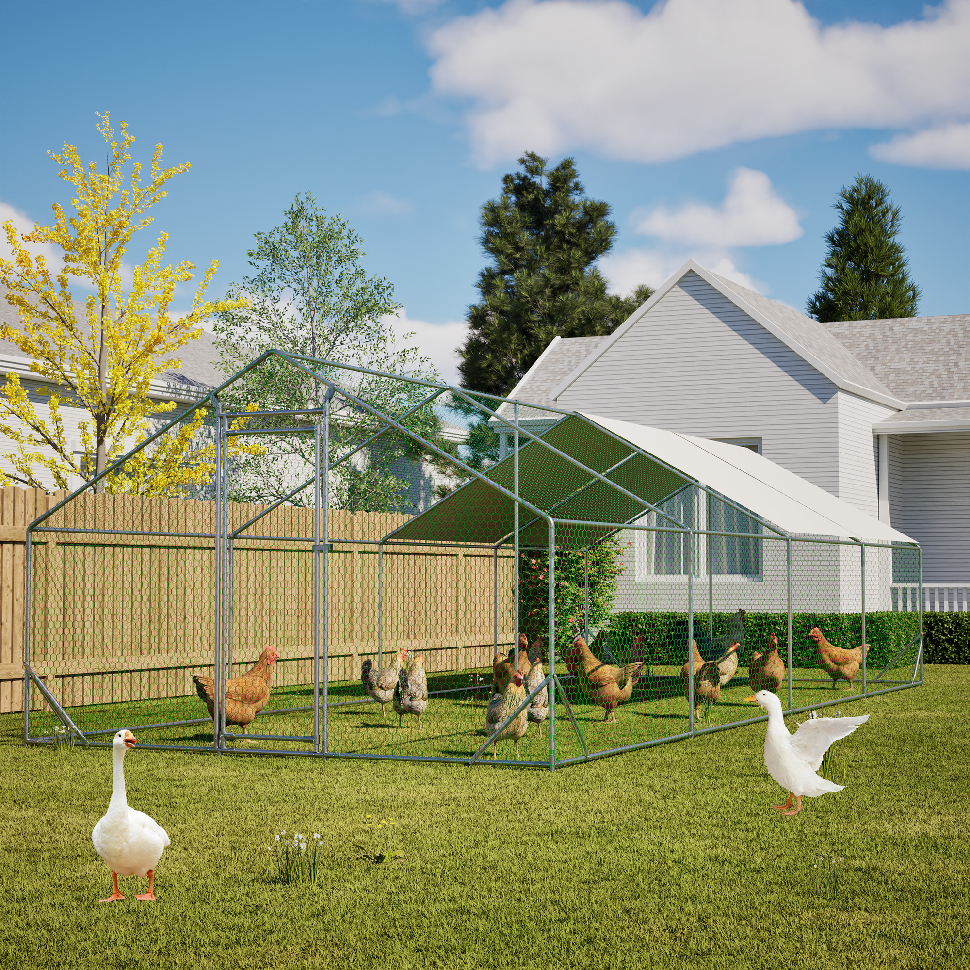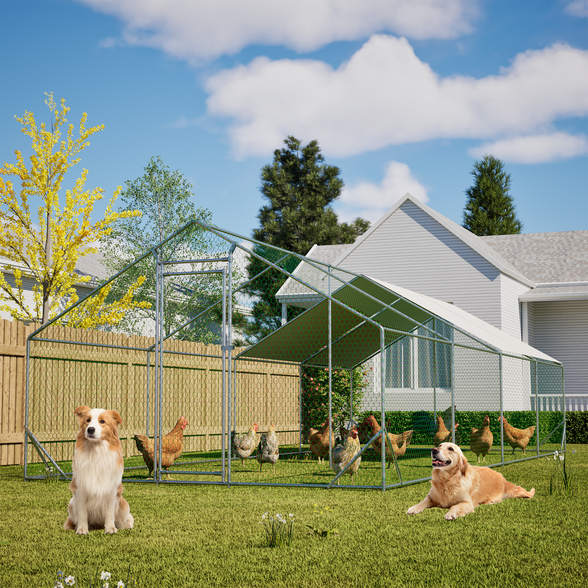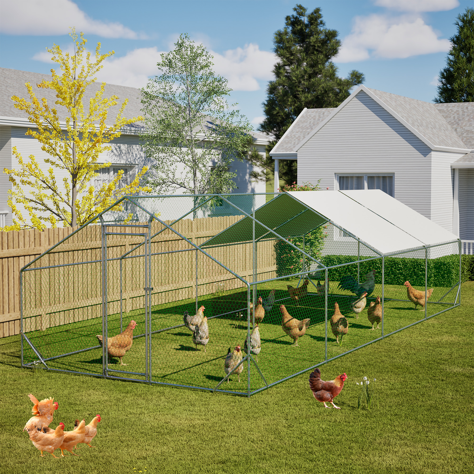 Our chicken run manufactured with high quality steel frame, including ground nails, so that the fence can better fixed to the ground.solid enough to keep the poultry from escaping and secure from predators. And this hen run house is also stably stationed to withstand the wind and snow weather. Featuring a durable sun and rain-proof tarp on the top, it is protective for the steel frame, wire mesh and animals under its cover. And the tarp is sturdy enough to avoid tear up or fade over time. With hexagonal wire mesh and the small gaps between meshes, you can prevent your chicken from some predators to make them safety. The spring clasp design requires no-welding for your quick assembly with this large metal chicken run. You can easily understand the installation with a complete set of components and simple instructions we offered. Lockable chicken run house suitable for a variety of animals like for chickens, rabbits, ducks and more. This walk-in metal poultry house has a spacious area for the animal to play and rest in the backyard garden and farm settings.